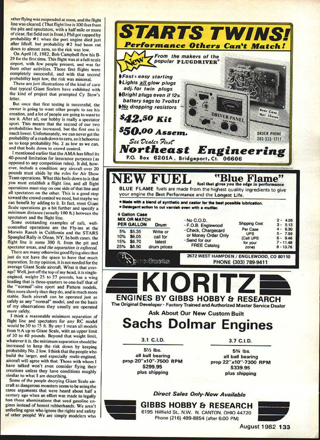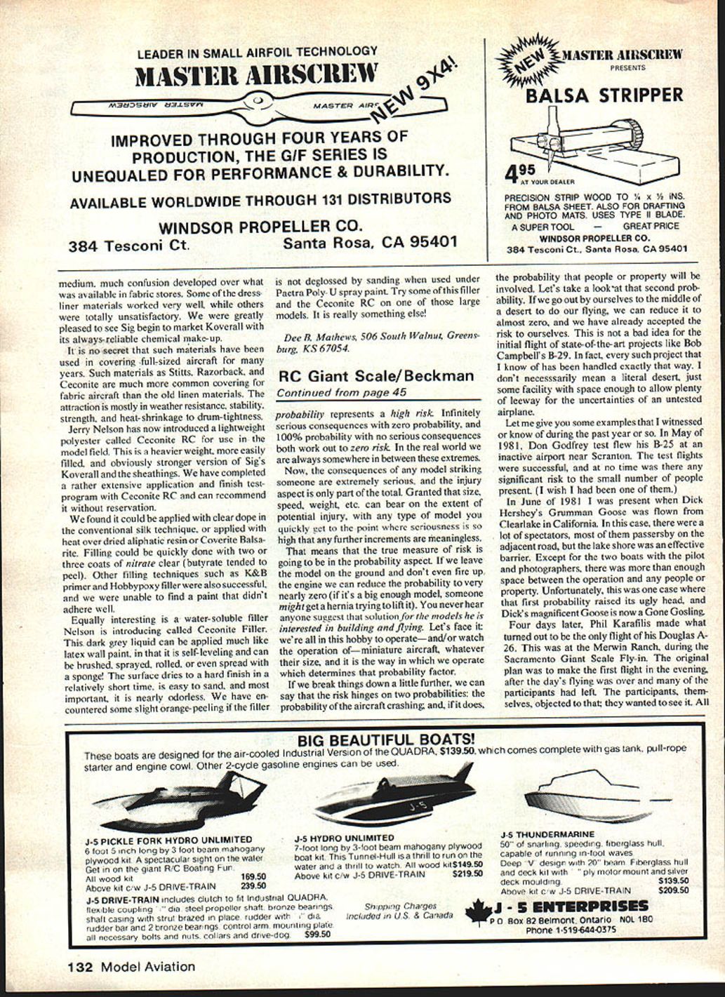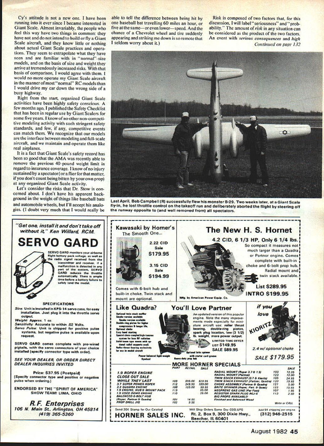 Radio Control GIANT SCALE Bob Beckman HOW BIG still beautiful following letter typical three four such letters 1 have received 2 years have writing column Dear Bob Ifafellowmodelerwishestofly RC aircraft weighs nearly much fullgrown adult human being see June MA issue regarding model B-29 dont wish stop endeavor However believe very strongly model aircraft controlled merely glitch-vulnerable radios fly faster am permitted law drive own auto mobile public higbways also weigh five baseball bats much typical standard-size Chevrolet spare tire rim have no rational basis model aircraft activities whatsoeverthese monsters too dangerous present unacceptable risk everyone within potential flying range Bob Being hit baseball bat dangerous enough friend can imagine damage some flying object 10 times baseball bats weight can either human skull human vertebrae Should just inno cent spectator some flying meet become permanently paralyzed upon being struck over-sized giant scale monsters outcome can accept pursuit fun Personally think flying RC model excess 10 pounds just too deadly permit owe something well-being safety other human beings Sincerely Cy Dr Cyrus J Stow 2195 Rockdale Drive Conyers GA 30207 Clancy Ljntner Ohio Superstar Products twin-Titan-powered AeroCommander Shrike Weight point 60 lb Hes building 9O-rotating landing gear Al Feeley L Arlie Kline R Orange Park FL working Stinson Model U airliner has two Quadras outboard 24 ci Kioritz nose expect throttle Ouadras back cruise Span will 16 ft 7 weight about 90 lb 44 Model Aviation Don Godfreys 8-25 lifts off 81 STARS Spangled Rally Despite successful test flight May Bobs Probability No 1 zapped few minutes later Field layout adequate separation tween spectators flight line precluded significant risk spectators Phil Karaf ills didnt know yet port Guadra already dying Douglas B-26 twin Resulting crash hundreds feet nearest spectator Merwin Ranch CA flying site Youve got admit Big beautiful comes sublect like Dick Hersheys Gru m man Goose Operating lake sure helps spectator crowd control Cys attitude new have running ever since became interested Giant Scale Almost invariably people feel way have two things common have not intend build fly Giant Scale aircraft know little nothing about actual Giant Scale practices opera tions seem extrapolate what have seen familiar normal-size models basis size weight arrive tremendously increased risks basis comparison would agree would no operate Giant Scale aircraft manner normal RC models would drive car down wrong side busy highway Right start organized Giant Scale activities have highly safety conscious few months ago published Safety Checklist has regular use Giant Scalers some five years know no other non- competi tive modeling activity such stringent safety standards few competitive events can match recognize models interface between modeling full-scale aircraft maintain operate like real airplanes fact Giant Scales safety record has good AMA recently able remove previous 40-pound weight limit regard insurance coverage know no injury sustained spectator flier matter dont count being bitten own prop organized Giant Scale activity Lets consider risks Dr Stow con cerned about dont have apparent back ground weight things like baseball bats automobile wheels r II accept analo gies doubt very much would really able tell difference between being hit baseball bat travelling 60 miles hour five sameor lowerspeed chance Chevrolet wheel tire suddenly appearing striking down remote seldom worry about Risk composed two factors discussion will label seriousness prob ability amount risk situation can considered product two factors An event serious consequences high Conjnucd page 132 Kawasaki Homers Tho mnoth One. 222 CID Sale $17995 315 CID Sale $19499 Comes 6-bolt hub built-in choke Twin stack mount optional Like Quadra GseaI iwle-ilank auS. Ss& nannies nesibbl Sneebe s.i. nenilnith B.&l.sog pate Ian hi5bo naepranie & eq. Ills ebeb Emny hued etaties Speal le.eeeled hel.tessee eta te I. IF rdet. Salld-bea lienel rudiul eats usd1 111 ~jg eenleeisdg l .erell Phdmiend 7i 19 ROPER ENGINE CLOSE OUT SALE WHILE THEY LAST 37 SUPER POWER ROPER 22 QUADRA ENGINE 79 ENGINE HUN N MOUNT PACK 19 USED DEMO ENGINE NALENCED 6-BOLT HUB Rapai prt, & Ouadrd PROP DRILL JIG New H S Hornet 42 CID 6 1/3 HP Only 6 1/4 lbs So compact measures much larger Quadra Partner engine Comes complete built-in choke 6-bolt prop hub Radial mount twin stack available List $28995 INTRO $19995 Youll Love Partner An updated verson ths popular engine Note improve ments made especially mini ature aircraft use rolls thrust bearing double-ring piston spark plug location low 13 1/2 power output LIMITED TIME OFFER tIST $14995 SALE $8995 ale stain serd puen pq hub MORE HORNER RT RETAILSALE RADIAL MOUNT Roper 37 N 79703 RADIAL MOUNT Pereaaaf723 TWIN STACK EXHAUST 37 N Kiric4los 709S990052995TWIN STACK EXHAUST Partner Quadra720 1722499579900CHOKE ASSEMBLY Pareaar N Quadr121 708729009999BRITE SPINNER Rapar Parr N Quad722 7795500NEOPRENE GAS LINE Pr Faag107 1102500RESISTOR SPARK PLUG ACJ-6173 BIG PROPS AVAILABLEl Pisishad e,d NaIa,ced Weed 7011495 702995 SALE 7295 7200 2495 79-95 500 7999 199 250 Wr1r CALL Send 20t Stamp CatalogWill Shrp Orders Sane Oay COO liPSAdd 94 shipuirt per uvgvn HORNER SALES INC Rt 2 Box 9300 Dixie Hwy. 312 940-2515 Beecher 1160401 August 1982 45 Last April Bob Campbell R successfully flew monster 8-29 Two weeks later Giant Scale fly-in lost throttle control takeoff run deliberately aborted flight steering off runway opposite well removed spectators Get install dont take off i1 Ken Willaro RCM SERVO GARD SERVO GARO monitors airborne flight battery pack vohage well tIne radio signal received front transmitter end receiver malfunction detected part system SERVO GARD reduces throttle automatically ample time before battery failure safely land modal SPECIFICATIONS Size Unit installed K PS-i 4 servo case easy installation Just plug tine throttle ser