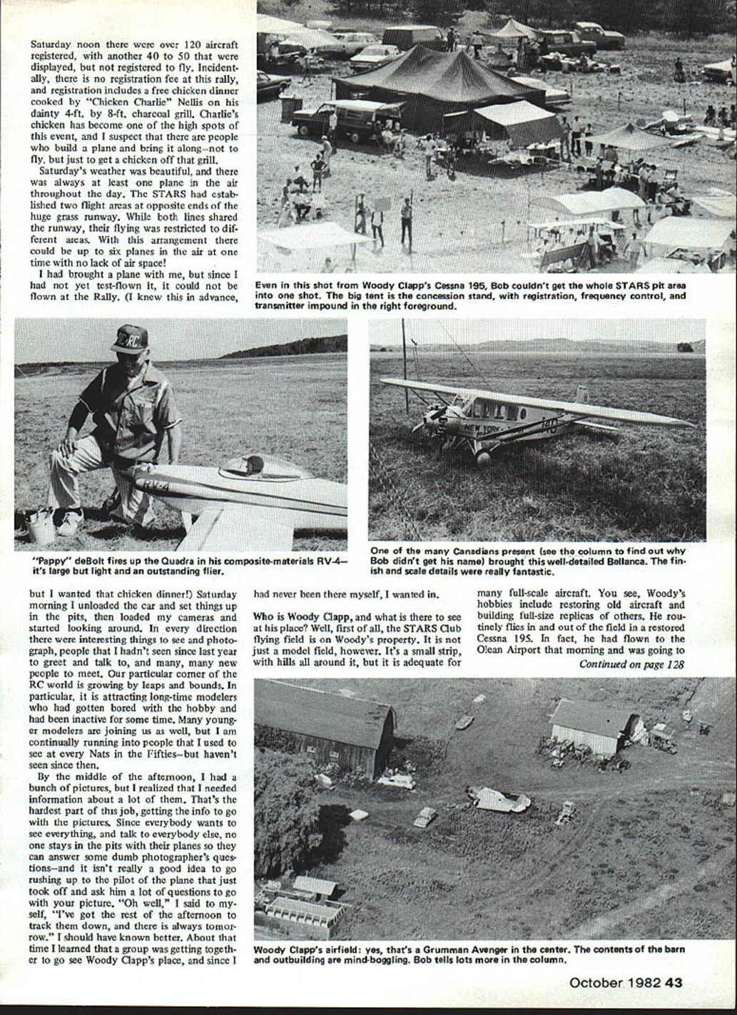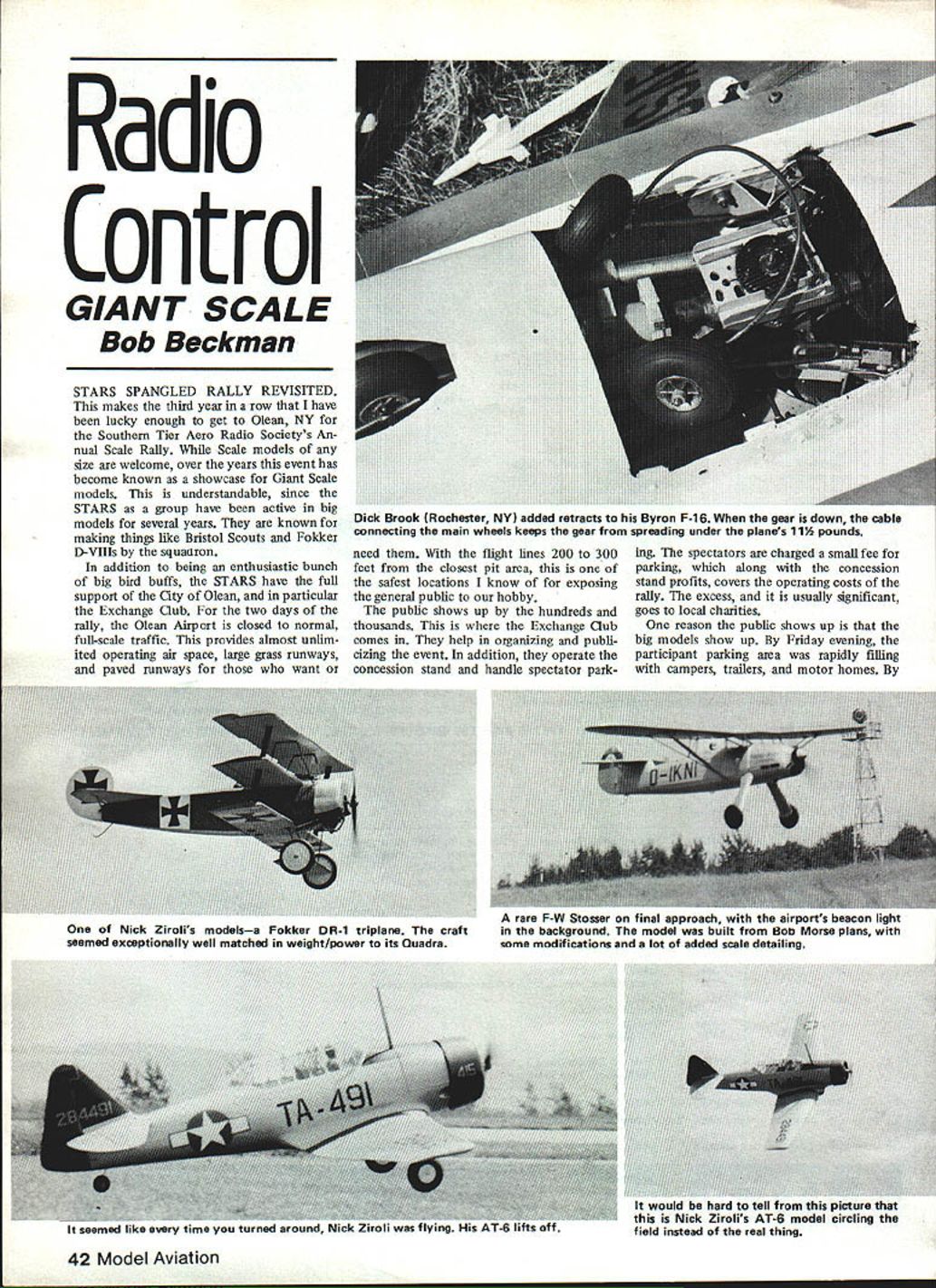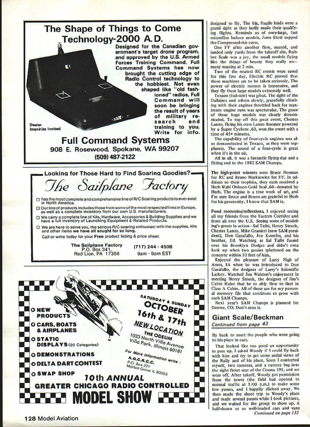 Radio Control GIANT SCALE Bob Beckman STARS SPANGLED RALLY REVISITED makes third year row have lucky enough get Glean NY Southern Tier Aero Radio Societys An nual Scale Rally Scale models size welcome over years event has become known showcase Giant Scale models understandable since STARS group have active big models several years known making things like Bristol Scouts Fokker D-VIIIs squadron addition being enthusiastic bunch big bird buffs STARS have full support City Glean particular Exchange Club two days rally Glean Airport closed normal full-scale traffic provides almost unlim ited operating air space large grass runways paved runways want need flight lines 200 300 feet closest pit area safest locations know exposing general public hobby public shows up hundreds thousands Exchange Club comes help organizing publi cizing event addition operate concession stand handle spectator parking spectators charged small fee parking along concession stand profits covers operating costs rally excess usually significant goes local charities reason public shows up big models show up Friday evening participant parking area rapidly filling campers trailers motor homes ,..ed like time turned around hard tell picture th Zirolis AT-B model circling field inatdu real thing 42 Model Aviation Dick Brook Rochester NY added retracts Byron F-16 gear down cable connecting main wheels keeps gear spreading under planes 1 PA pounds Nick Zirolis modelsa Fokker DR1 triplane craft seemed exceptionally well matched weight/power its Quadra rare F-W Stosser final approach airports beacon light background model built Bob Morse plans some modifications lot added scale detailing Saturday noon over 120 aircraft registered another 40 50 displayed registered fly Incident ally no registration fee rally registration includes free chicken dinner cooked Chicken Charlie Nelils dainty 4-ft 8-ft charcoal grill Charlies chicken has become high spots event suspect people build plane bring alongnot fly just get chicken off grill Saturdays weather beautiful always least plane air throughout day STARS estab lished two flight areas opposite ends huge grass runway both lines shared runway flying restricted dif ferent areas arrangement could up six planes air time no lack air space brought plane since yet test-flown it could flown Rally knew advance wanted chicken dinner Saturday morning unloaded car set things up pits loaded cameras started looking around direction interesting things see photo graph people hadnt seen since last year greet talk many new people meet particular corner RC world growing leaps bounds particular attracting long-time modelers gotten bored hobby inactive some time young er modelers joining us well am continually running people used see Nats Fiftiesbut havent seen since middle afternoon bunch pictures realized needed information about lot Thats hardest part job getting info go pictures Since everybody wants see everything talk everybody else no stays pits planes can answer some dumb photographers ques tionsand isnt really good idea go rushing up pilot plane just took off ask him lot questions go picture Oh well said self Ive got rest afternoon track down always tomor row should have known better About time learned group getting togeth er go see Woody Clapps place since never myseif wanted Woody Clapp what see place Well first STARS Club flying field Woodys property just model field however Its small strip hills around it adequate full-scale aircraft see Woodys hobbies include restoring old aircraft building full-size replicas others rou tinely flies out field restored Cessna 195 fact flown Olean Airport morning going Continued page 128 October 198243 shot Woody Clapps Cessna 195 Bob couldnt get whole STARS pit area shot big tent concession stand registration frequency control transmitter impound right foreground Pappy deBolt fires up Quadra composite-materials RV4 its large light outstanding flier Canadians present sea column find out Bob didnt get name brought well-detailed Bellanca f ish scale details really fantastic Woody Clapps airfield yes thats Grumman Avenger center contents barn outbuilding mind-boggling Bob tells lots column Shape Things Come Technology-2000 D Designed Canadian gov ernments target drone program approved US Armed Forces Training Command Full Command Systems has now brought cutting edge Radio Control technology hobbiest shaped like old fash ioned radios Full Command will soon bringing result years military re search training Write info Full Command Systems 908 E Rosewood Spokane WA 99207 509 487-2122 Looking Hard Find Soaring Good ies 3/ie Sa4fane iT/a dory o has complete comprehensive line RIO Soaring products ever exist North America o Our line products includesthosefrom some respected firms Europe well complete inventory own US manufacturers o We carry complete line Kits Hardware Accessories & Building Supplies have full inventory Launching Equipment & Related Products o We serve serious R/O soaring enthusiast supplies kits other items have sought long Call write today Free product listing & price sheet Sailplane Factory PO Box 341 Red Lion PA 17356 717 244-4508 9am 9pm EST -m 0 NEW PRODUCTS NJ o STATIC DISPLAYS 20 Categories o DEMONSTRATIONS O DELTA DART CONTEST 8AUR OCjAIOAY vji0 0rJ flOis 6oij7 Por fo 1n0 0 rite Morto0021 rove IL 60053 10th ANNUAL GREATER CHICAGO RADIO CONTROLLED zmM MODEL SHOW V U U U U U U U U U U U U U U U U U U U U U -U designed fly big fragile birds grand sight lazily made qualify ing flights Reminds us over-large fast microfilm Indoor models Joon Stott topped Compressed-Air crew FF after another flew maxed landed yards takeoff site Rub ber Scale joy small models flying like things beauty really maxing 2 min Two neatest RC events saved fine day Electric RC proved machines taken seriously power electric motors impressive fly large models extremely welL Texaco full-size gieat sight Dallaires others siowly gracefully climb ing engines throttled back max imum engine