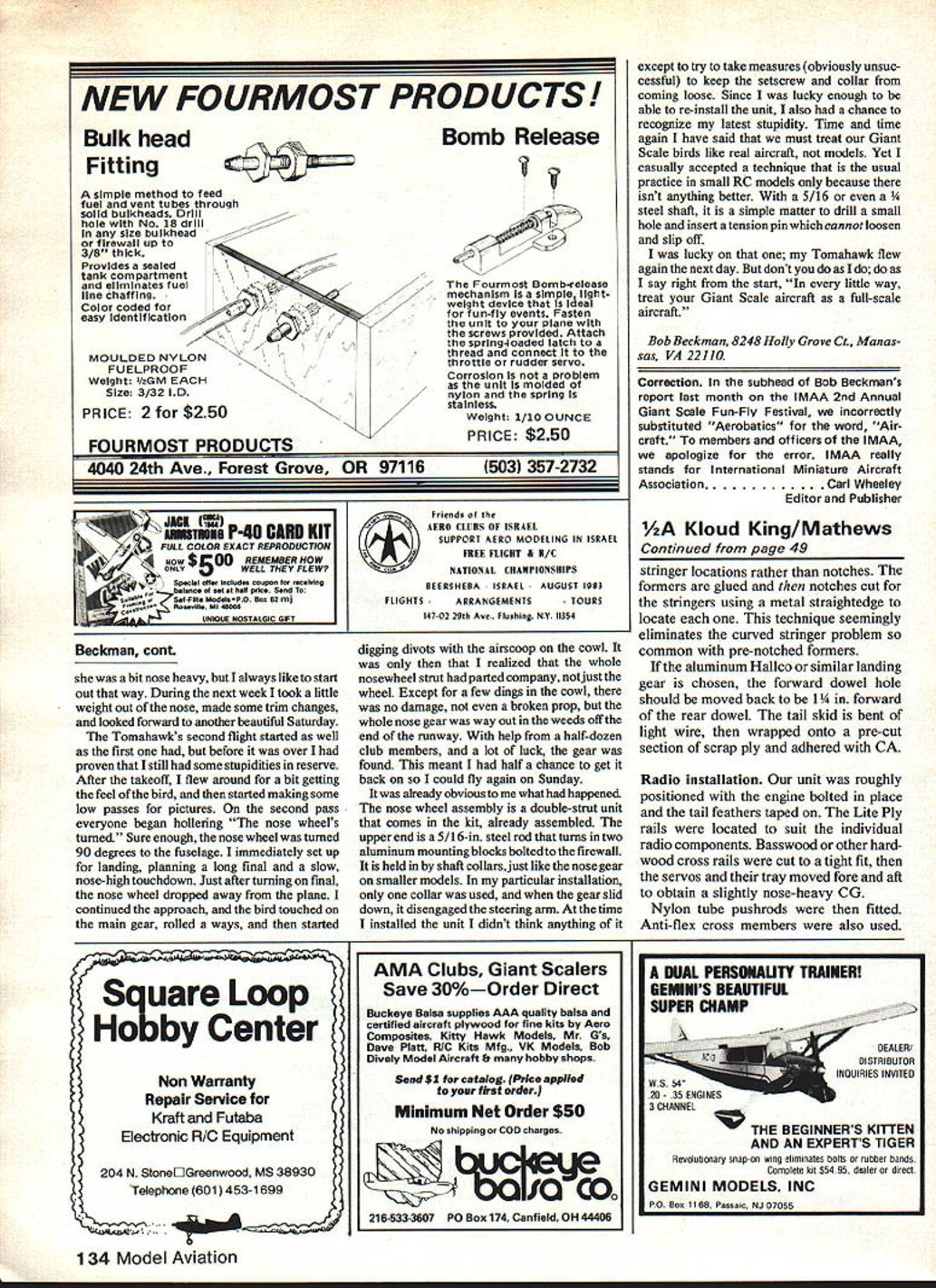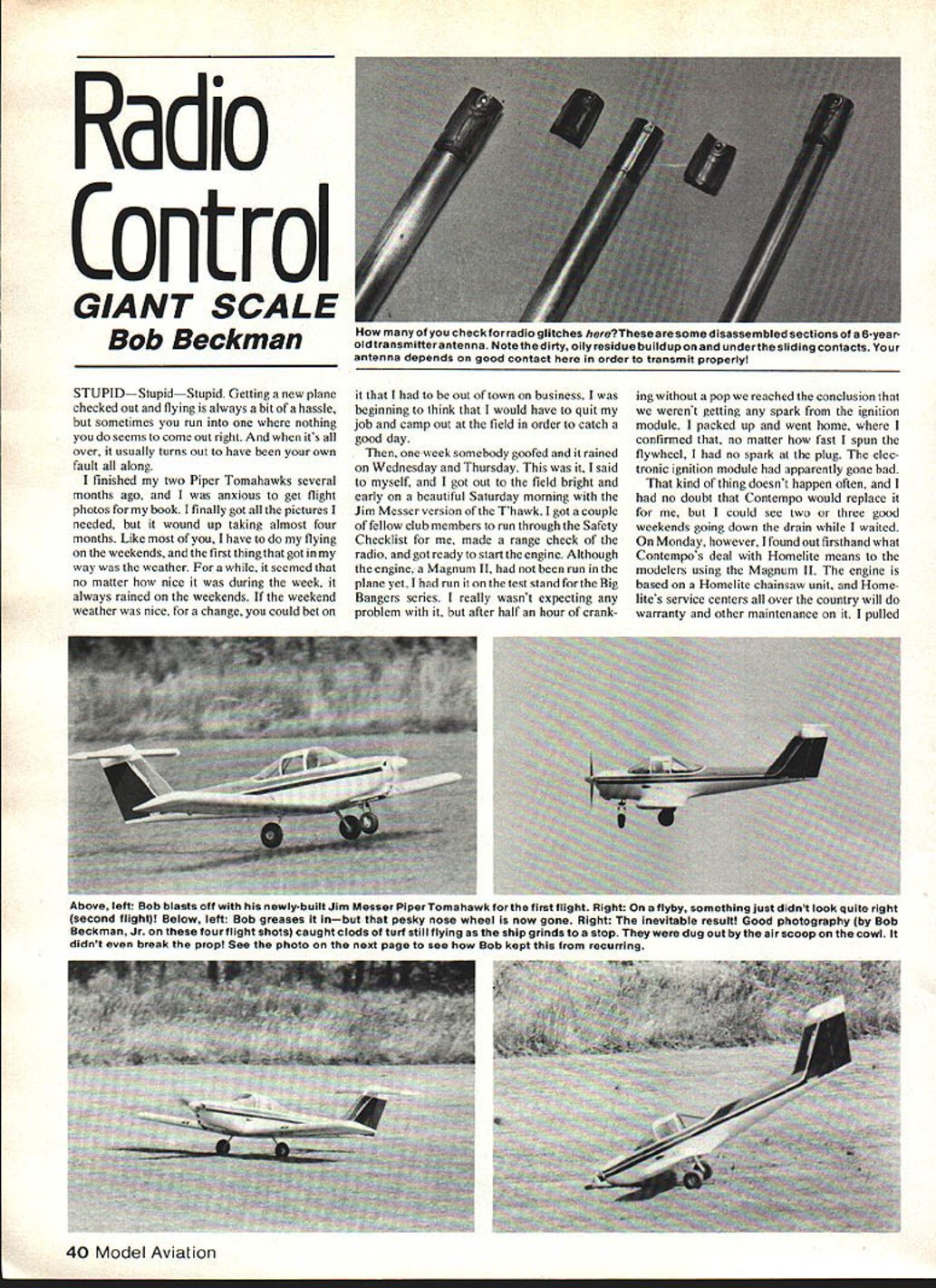 Radio Control GIANT SCALE Bob Beckman STUPIDStupidStupid Getting new plane checked out flying always bit hassle sometimes run nothing seems come out right its over usually turns Out have own fault along finished two Piper Tomahawks several months ago anxious get flight photos book finally got pictures needed wound up taking almost four months Like have flying weekends first thing got way weather seemed no matter nice during week always rained weekends weekend weather nice change could bet Out town business beginning think would have quit job camp Out field order catch good day week somebody goofed rained Wednesday Thursday said myself got out field bright early beautiful Saturday morning Jim Messer version Thawk got couple fellow club members run through Safety Checklist made range check radio got ready start engine Although engine Magnum II run plane yet run test stand Big Bangers series really wasnt expecting problem after half hour cranking pop reached conclusion werent getting spark ignition module packed up went home confirmed no matter fast spun flywheel no spark plug elec tronic ignition module apparently gone bad kind thing doesnt happen often no doubt Contempo would replace could see two three good weekends going down drain waited Monday however found Out firsthand what Contempos deal Homelite means modelers using Magnum II engine based Homelite chainsaw unit Home lites service centers over country will warranty other maintenance pulled 40 Model Aviation HOW check radio glitches hereThese some disassembled sections 6-yearoldtransmitterantenna Notethedirty oily residue buildupon underthesliding contacts antenna depends good Contact order transmit properly Above left Bob blasts oft newly-built Jim Messer Piper Tomahawk first flight Right flyby something just didnt look quite right second flight Below left Bob greases inbut pesky nose wheel now gone Right inevitable result Good photography Bob Beckman Jr four flight shots caught clods turf still flying ship grinds stop dug out air scoop cowl didnt break prop See photo next page see Bob kept recurring module off engine leaving engine plane headed Homelite site Alexandria VA explained problem within 10 minutes way home new module place lots fat spark plug problem out way time others start showing up Between some health problems trying get few major Giant Scale Fly-Ins weekends started slipping away fast About time pull engine out plane test runs will reported next installment Big Bangers Big Birds finally got act together engine andyou guessed itthe radio started giving trouble First noticed some glitches transmitter close plane starting engine can sometimes due overload ing receiver cleared up soon moved few feet away made range check antenna collapsed goed s gotten last check several weeks ago time wasnt good used getting same equipment other aircraft extended antenna found increased range six feet No way going fly under conditions another set frequency modules changed over tried again Things looked good put aircraft back together made range check relinquished pin other fliers fueled bird relaxed bit nice warm sunshine About half hour later got pin again prepared start engine immediately painfully obvious radio absolutely dead few quick checks determined batteries right transmitter putting out receiver Inoperative packed up went home again beginning very embarrassing since people field starting say things like Oh brought out again During next week found replaced heat-sensitive transistor second receiver checked tuning operation both sets frequency modules next weekend went confidently field have same sequence events take place change receiver didnt quit completely although point seemed continued operate unacceptably low lange tried re-orienting receiver antenna some slight changes operation enough make things usable beginning think might getting zapped rudder elevator drive cables and/or long servo leads aileron servos split-battery system shielded servo leads have never kind trouble before always first time last desperate effort pulled receiver cut another plane tried Same problem insufficent range same receiver has giving solid performance Sig Kavalier past three years did die put Giant Scale aircraft Welljust heck lets see what transmitter use Kavalier does controls arent set up same example rudder worked elevator can least see radio working ofcourse now perfectly adequate range Control solid block away antenna hown time doing range checking home wasnt about go Out field again until worked finally got through thick skull problem trans rnitternot receiver Thursday Drill hole nose wheel assembly shaft use 1/16in tension pin instead usual shaft-collarand-set-screw arrange ment retain nose wheel assembly its mounting bracket Its much reliable evening still chance tix things Saturday being forecast beautiful day Friday took both transmitters work have some useful test equipment avail able set up spectrum analyzer look transmitted output good transmitter Continued page 131 January 1983 41 Professionals Choice - ANT Quality hobby Products Fiber-Glass Tapes Fiber-Glass Cloths Polyester Resin Air-O-Fill Micro-Balloons Primers Thinner Engine Oil Engine Cleaner Protective Gloves Dust Masks Sponge & Applicator Kits Ask products local hobby shop send self-addressed stamped envelope free catalogue discount KIN-CRAKr MFG INC Box 481E Ashland Kentucky 41101 606 928-4763 ecu-Charger THE QUALITY LINE Th OF RIC ELECTRONICS tRflnmw MULTi CHINUI Multi Charger L Pozee acez T1iThwer PacerPower QUALITY EQUIPMENT THAT FILLS ALL OF THE ELECTRICAL NEEDS OF YOUR R/C ACCESSORIES L R Taylor & Co e~1er20831 oe Blvd~xe Park California 91306 Canoga 213 360-1178 join possibly forming SAM chapteror least get together some fun-fly activities phone 504 774-9647 Dee B Mathews 506 South Walnut Greensburg KS 67054 RC Aerobatics/Van Putte Continued page 37 misplaced Regardless heres slightly edited version Genes letter As B-47 operator stationed Topeka KS circa 1960 me
