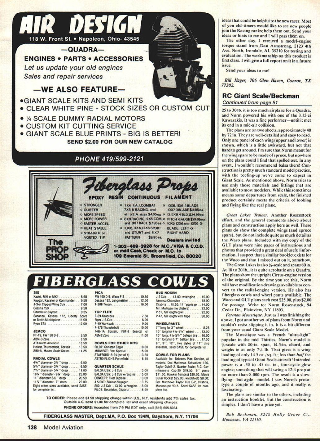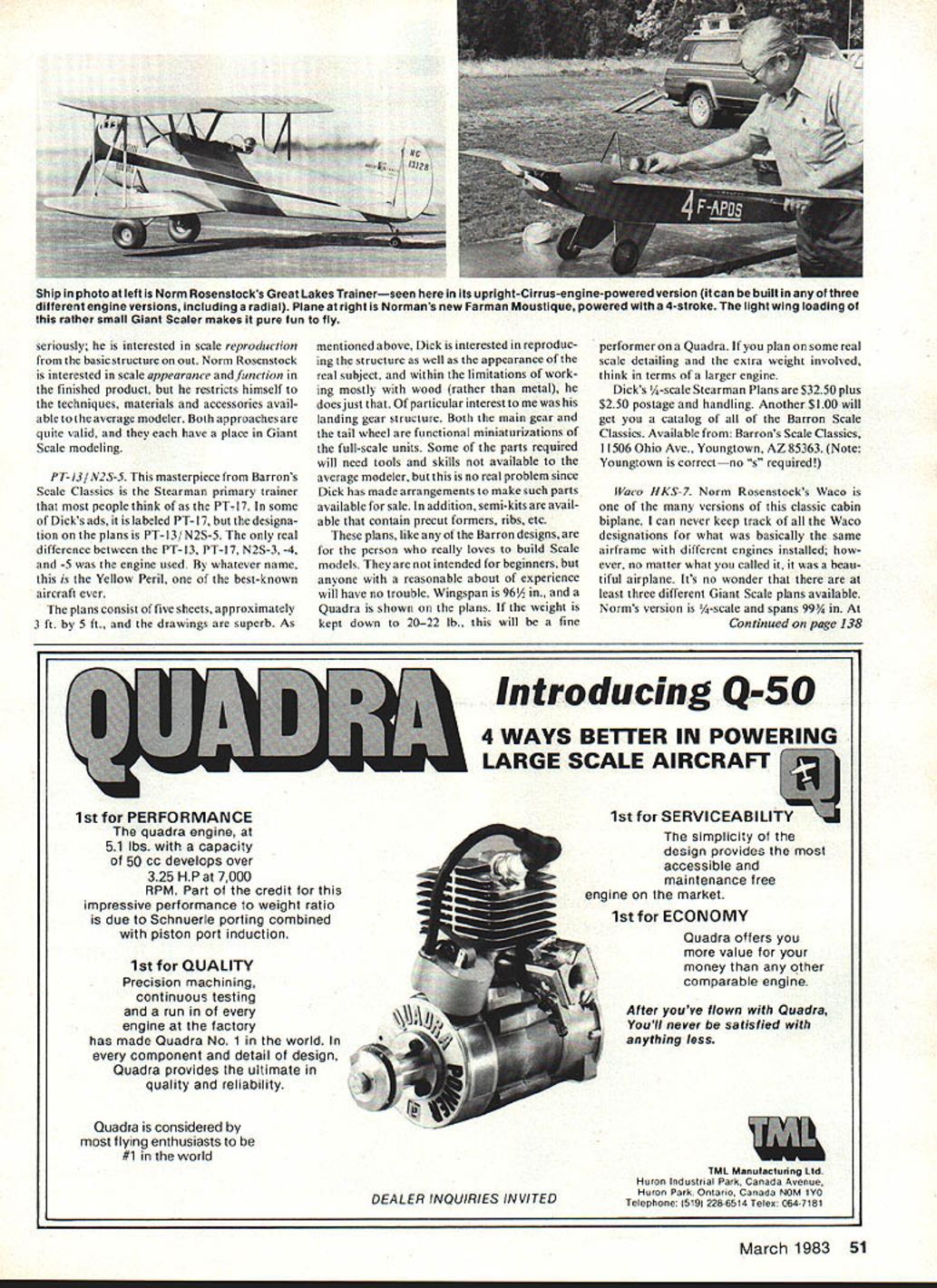 Radio Control GIANT SCALE Bob Beckman HAPPY BIRTHDAY RC Giant Scale issue marks beginning fourth year writing RC Giant Scale column Back 1978 79 first got involved Giant Scale Quarter Scale Mammoth Scale Le Grande Scale whatever movement still its infancy really beginning pick up steam Dick Phillips doing Big Beautiful column RCM year Ron Shettler writing short-lived Mammoth Scale Model Builder Quadra firmly entrenched stanbuilding kind kudos affair have go Byron Godberson Don Godfrey couple showmen sure would have no show vast numbers modelers have turned realistic form RC flying word have Third Annual Ida Grove again third week August last year youll want go again didnt make last year wont want miss time around Plan reviews month want talk about plans two designers have quite dif ferent philosophies about Giant Scale design Dick Barron takes word Scale very dard power source more new engines starting surface wasnt much way Giant Scale-sized accessories people made own fittings hinges horns etc became obvious items designed smaller models just couldnt job some notable exceptions hobby manufacturers no interest making kinds things needed people con sidered efforts unnecessarily large impractical curiosities would soon dis appear RC modeling scene During last three years things have changed lot An amazing number new engines available coming along time Hinges horns wheels other acces sories materials sizes suitable appli cation now readily available Kits plans interesting practical miniature aircraft plentiful true scratch-built creations common other phase RC modeling Weve come long way baby very important factor growth pat tern has International Miniature Air craft Association IMAAs Second Annual Fun-fly Festival August 1982 has rank high list outstanding showcases model 50 Model Aviation Dick Barron showed magnificent PT-13 booth 1981 Toledo show Seen below lully-functional shock-absorbing steerable tailwheel left close look lower end Slearmans main landing gearwhich has functional necessary torque scissors Special parts like available builders Norm Rosenstocks Waco final approach landing Quarter-scale model powered 315 cu Kawasaki Its plans reviewed month Bob seriously interested scale reproduction basic structure out Norm Rosenstock interested scale appearance function finished product restricts himself techniques materials accessories avail able average modeler Both approaches quite valid have place Giant Scale modeling PT-13/N2S-5 masterpiece Barrons Scale Classics Stearman primary trainer people think PT- 17 some Dicks ads labeled PT- 17 designa tion plans PT-13/N2S-5 real difference between PT-13 PT-17 N2S-3 -4 -5 engine used whatever name Yellow Peril best-known aircraft ever plans consist five sheets approximately 3 ft 5 ft drawings superb As mentioned above Dick interested reproduc ing structure well appearance real subject within limitations work ing mostly wood rather metal does just particular interest landing gear structure Both main gear tail wheel functional miniaturizations full-scale units Some parts required will need tools skills available average modeler no real problem since Dick has made arrangements make such parts available sale addition semi-kits avail able contain precut formers ribs etc plans like Barron designs person really loves build Scale models intended beginners anyone reasonable about experience will have no trouble Wingspan 96 Quadra shown plans weight kept down 2022 lb. will fine performer Quadra plan some real scale detailing extra weight involved think terms larger engine Dicks -scale Stet rman Plans $3250 plus $250 postage handling Another $100 will get catalog of Barron Scale Classics Available Barrons Scale Classics 11506 Ohio Ave Youngtown AZ 85363 Note Youngtown correctno s required Waco HKS-7 Norm Rosenstocks Waco versions classic cabin biplane can never eep track Waco designations what basically same airframe different engines installed ever no matter what called it beau tiful airplane Its nc wonder least three different Giant Scale plans available Norms version cale spans 99 Continued page 138 1st PERFORMANCE quadra engine 51 lbs capacity 50 cc develops over 325 HP 7000 RPM Part credit impressive performance weight ratio due Schnuerle porting combined piston port induction 1st QUALITY Precision machining continuous testing run engine factory has made Quadra No 1 world component detail design Quadra provides ultimate quality reliability Quadra considered flying enthusiasts #1 world Introducing Q-50 4 WAYS BETTER IN POWERING LARGE SCALE AIRCRAFT 1st SERVICEABILIT DEALER INQUIRIES IN V/TED simplicity design provides accessille maintenance free engine market 1st ECONOMY Quadra offers value money other comparable engine Affer youve flown Quadra Youll never satisfied anything less TPtL Manufacturing Ltd Huron Industrial Park Canada Avenue Huron Park Ontario Canada NOM ivo Telephone 519 228-6514 Telex 0647181 March 1983 51 Ship photo left Norm Rosenslocks Great Lakes Trainerseen its upright-Cirrus-engine-powered version built three different engine versions including radial Plane right Normans new Farman Moustique powered 4-stroke light wing loading rather small Giant Scaler makes pure fun fly SIG Kadet MKI MKII650 Kougar Kanalier Kommander 650 J-3 Clipped Wing Cob700 Cessna 150850 Citabria Skyholt925 Bonanza Cessna 172 Liberty Sport Smith Minihiplane1100 Ryan STA1200 JEMCO PT-19 FW 190 0-9650 ABM-3Zero850 AT6 North American1050 HellcatThunderholt Corsair1350 SBD-5 Master Scale Series1425 RADIAL COWLS 4 diameter- 3 deep650 54 diameter- 3 deep650 74' diameter- 534' deep1100 104' diameter- 9' deep2500 11' diameter-6/' deep2050 11' diameter- 7' deep2200 Eight other sizes anailahle send SASE tsr complete list PICA FW19OD-9WacoF-3 1050 Cessna 182 Juogmeister 1250 T-28BTrolun 1600 TOP FLITE P-3gAiracohra 750 PiperJ-3Ceb 800 P-4oWarhawk 900 P-47flThonderholt 1000 F4U-1A Corsair F8F-2 Rearcat A6M2Zero 1100 COWLS FOR OTHER KITS PILOT Christen Eagle 1800 MI