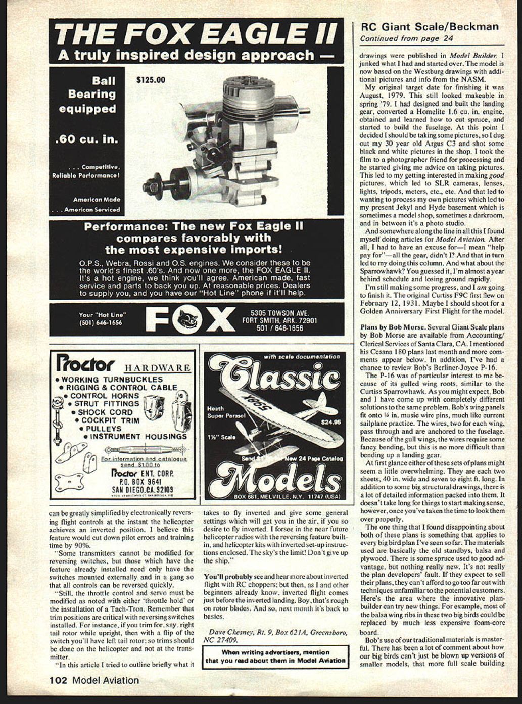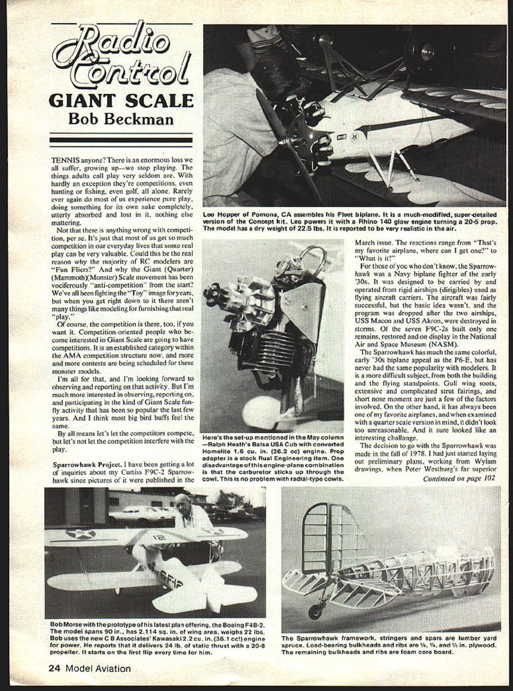 GIANT SCALE Bob Beckman TENNIS anyone enormous loss suffer growing upwe stop playing things adults call play very seldom hardly exception theyre competitions hunting fishing golf alone Rarely ever again us experience pure play doing something its own sake completely utterly absorbed lost nothing else mattering anything wrong competi tion per Se Its just us get much competition everyday lives some real play can very valuable Could real reason majority RC modelers Fun Fliers Giant Quarter MammothMonster Scale movement has vociferously anti-competition start Weve fighting Toy image years get right down arent things like modeling furnishing real play course competition too want Competition-oriented people come interested Giant Scale going have competitions established category within AMA competition structure now more contests being scheduled monster models Im Im looking forward observing reporting activity Im much interested observing reporting participating kind Giant Scale funfly activity has popular last few years think big bird buffs feel same means lets let competitors compete lets let competition interfere play Sparrowhawk Project have getting lot inquiries about Curtiss F9C-2 Sparrowhawk since pictures published March issue reactions range Thats favorite airplane can get What dont know Sparrowhawk Navy biplane fighter early 30s designed carried operated rigid airships dirigibles used flying aircraft carriers aircraft fairly successful basic idea wasnt program dropped after two airships USS Macon USS Akron destroyed storms seven F9C-2s built remains restored display National Air Space Museum NASM Sparrowhawk has much same colorful early 30s biplane appeal P6-E has never same popularity modelers difficult subject both building flying standpoints Gull wing roots extensive complicated strut fairings short nose moment just few factors involved other hand has always favorite airplanes examined quarter scale version mind didnt look too unreasonable sure looked like interesting challange decision go Sparrowhawk made fall 1978 just started laying out preliminary plans working Wylam drawings Peter Westburgs far superior Continued page 102 24 Model Aviation Leo Hopper Pomona CA assembles Fleet biplane much-modifiedsuperdetailed version Concept kit Leo powers Rhino 140 glow engine turning 20-5 prop model has dry weight 225 lbs reported very realistic air Ralph Heaths Balsa USA Cub wh onverted Homelite 16 Cu 262 cc engine Prop adapter stock Rual Engineering item disadvantage engine-plane combination carburetor sticks up through cowl no problem radial-type cowls Bob Morse prototype latest plan offering Boeing F4B2 model spans go has 2114 sq wing area weighs 22 lbs Bob uses newC BAssociates Kawasaki22cu 361 ccl engine Sparrowhawk framework stringers spars lumber yard power reports delivers 24 lb static thrust 20-8 spruce Load-bearing bulkheads ribs 1/8 1/4 1/2 plywood propeller starts first flip time him remaining bulkheads ribs foam core board IwIEtxE z9ruui 4I1 0- S0S0gS can greatly simplified electronically revers ing flight controls instant helicopter achieves inverted position believe feature would cut down pilot errors training time 90% Some transmitters cannot modified reversing switches have feature already installed need have switches mounted externally gang controls can reversed quickly Still throttle control servo must modified noted either throttle hold installation Tach-Tron Remember trim positions critical reversing switches installed instance trim say right tail rotor upright flip switch youll have left tail rotor trims should done helicopter trans mitter article tried outline briefly what takes fly inverted give some general settings will get air desire fly inverted forsee near future helicopter radios reversing feature builtin helicopter kits inverted set-up instruc tions enclosed skys limit Dont give up ship Youll probably see hear about inverted flight RC choppers other beginners already know inverted flight comes just before inverted landing Boy thats rough rotor blades next month its back basics Dave Chesney Rt 9 Box 621A Greensboro NC 27409 IWhen writing advertisers mention reed about Model Aviation RC Giant Scale/Beckman Continued page 24 drawings published Model Builder junked what started over model now based Westburg drawings addi tional pictures info NASM original target date finishing August 1979 still looked makeable spring 79 designed built landing gear converted Homelite 16 cu engine obtained learned cut spruce started build fuselage point decided should taking some pictures dug out 30 year old Argus C3 shot some black white pictures shop took film photographer friend processing started giving advice taking pictures led getting interested making good pictures led SLR cameras lenses lights tripods meters etc etc led wanting process own pictures led present Jekyl Hyde basement sometimes model shop sometimes darkroom between its photo studio somewhere along line found myself doing articles Model Aviation After have excuse forI mean help pay forall gear didnt turn led doing column what about Sparrowhawk guessed Im almost year behind schedule losing ground rapidly Im still making some progress Jam going finish original Curtiss F9C first flew February 12 1931 Maybe should shoot Golden Anniversary First Flight model Plans Bob Morse Several Giant Scale plans Bob Morse available Accounting Clerical Services Santa Clara CA mentioned Cessna 180 plans last month com ments appear below addition Ive chance review Bobs Berliner-Joyce P-16 P-16 particular interest cause its gulled wing roots similar Curtiss Sparrowhawk As might expect Bob have come up completely different solutions same problem Bobs wing panels fit Onto wire pins much like current sailplane practice wires two wing pass through anchored fuselage Because gull wings wires require some fancy bending no difficult bending up landing gear first glance either sets plans might seem little overwhelming two sheets 40 wide seven