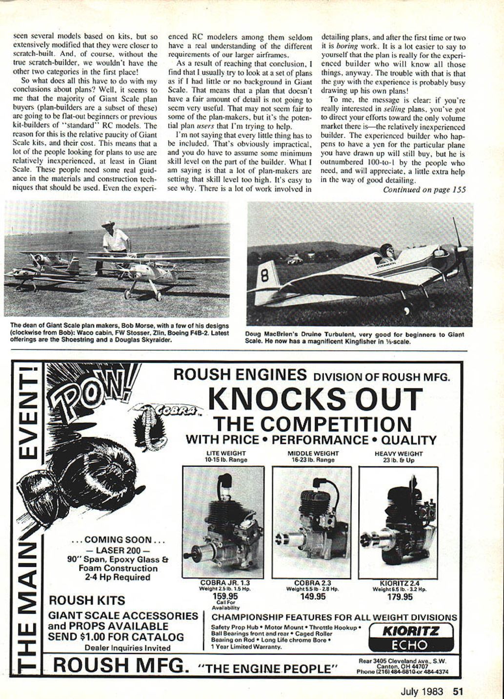 Radio Control GIANT SCALE Bob Beckman WHEN plan PLAN Over past three years have looked atand reported ona lot Giant Scale plans proc ess find have reached some con clusions about plans general conclusions finding way reviews fairness both plan users actual potential plan producers think its time tried pass con clusions First Ive got talk little about philosophy building own mind identify three basic categories building kit-building plan-building scratchbuilding Most modelers seem recognize two categories use term scratch-built mean anything built kit lot reasons think catch-all term should split two reasons feel person designs documents model others can reproduce plans de serves some credit talk about such such model being built Nosen kit Balsa USA kit often information volunteered model made someones plans Time time again have people tell scratch-built model ask few questions find used plans produced someone else Now before start hissing booing please understand Im say ing anything wrong planbuilding just think guy put work designing original drawing plans should get share credit another reason think appropriate distinguish between planbuilding scratch-building RC modeling wellestablished construction-type hobby par ticipant usually follows well-defined pat tern skill development starts kit contains materials needed some cases some parts preformed and/or pre-assembled Once basic construction mastered usually goes better assembly finishing techniques Some people never build anything kits produce some beautiful fine-performing aircraft Some people however find arent satisfied kits available Maybe interested par ticular full-scale design hasnt kitted often case Giant Scale isnt available size want people ready next step find plans model want proceed procure process materials required Its very big difference skill level kit-building potentially very important now likely consider substituting different materials trying new techniques opinion planbuilding just tad creative straight kit-building plan-builders can justly proud efforts next step true scratch-building much bigger kit-building plan-building modeler becomes designer envisaging final product taking steps convert vision tangible operational reality Wait say Someone building Scale semi-Scale model real airplane already has design done him True sense outlines appearance dont kid yourselvesthere lot de sign involved working out aero dynamics structure successful min iature aircraft Im saying three building methods better other two over years Ive certainly used three myself also recognize can some fuzzy areas between Ive 50 Model Aviation Norm Rosenstock tachs big Kawasaki Waco Norm has plans also Great Lakes Trainer Farman Moustique oos camera managea w catcn premier oulider plan-producer Darlo Brisighella middle blink Darlo has plans Starduster Waco cabin biplane Steen Skybolt lell liostetler neeos no ntroaucIIon iianx caiers since ne first come out plans Big Birds Liberty Sport Others include gorgeous Art Chester Jeep plans opwnn riplane Larsair ana Ri -0 seen several models based kits extensively modified closer scratch-built course true scratch-builder wouldnt have other two categories first place So what does have conclusions about plans Well seems majority Giant Scale plan buyers plan-builders subset going flat-out beginners previous kit-builders standard RC models reason relative paucity Giant Scale kits cost means lot people looking plans use relatively inexperienced least Giant Scale people need some real guid ance materials construction tech niques should used experi enced RC modelers among seldom have real understanding different requirements larger airframes As result reaching conclusion find usually try look set plans little no background Giant Scale means plan doesnt have fair amount detail going seem very useful may seem fair some plan-makers its poten tial plan users Im trying help Im saying little thing has included Thats obviously impractical have assume some minimum skill level part builder What am saying lot plan-makers setting skill level too high Its easy see lot work involved detailing plans after first time two boring work lot easier say yourself plan really experi enced builder will know things anyway trouble that guy experience probably busy drawing up own plans message clear youre really interested selling plans youve got direct efforts toward volume market isthe relatively inexperienced builder experienced builder hap pens have yen particular plane have drawn up will still buy outnumbered 100-to-I people need will appreciate little extra help way good detailing Continued page 155 ROUSH ENGINES DIVISION OFROUSH MFG KNOCKS OUT THE COMPETITION 5TH PRICE ORMANCE ITY GIANT SCALE ACCESSORIES PROPS AVAILABLE SEND $100 FOR CATALOG Dealer Inquiries Invited MIDDLE WEIGHT 1623 lb Range HEAVY WEIGHT 23 lb & Up Waighi 15 Hp call Availability CHAMPIONSHIP FEATURES FOR ALL WEIGHT DIVISIONS Safety Prop Hub r Mount ttle Hookup Ball Bearings front rear Caged Roller Bearing Rod Life chrome Bore 1 Year Limited Warranty July 1983 51 dean Giant Scale plan makers Bob Morse few designs clockwise Bob Waco cabin FW Stosser Zlin Boeing F4B-2 Latest offerings Shoestring Douglas Skyraider Doug MacBriens Druine Turbulent very good beginners Giant Scale now has magnificent Kingfisher V5-scale .COMING SOON. LASER200 90 Span Epoxy Glass & Foam Construction 2-4 Hp Required z w IROUSH KITS COBRA 23 Weight 55 lb -28 Hp 14995 IUUIII ight 65 lb -32 Hp 17995 ROUSH MFG THEENGINE PEOPLE Rear 3405 Cleveland Ave. SW Canton OH 44707 Phone 1218 48481Oo 4844374 Engines RadIos Mufflers Custom Carburetors Gyros SUPER MINI-BOY VIDEO MINIATURE AIRCRAFT SUPPLY BRINGS YOU ANOTHER HELICOPTER FIRST ProfessIonally produced video takes workshop professionally build set up flight trim mini-boy Includes step step building parts Iden tification mechanical operational walk through radio installation balancing bench setup operational flight trimming aerobatics video be