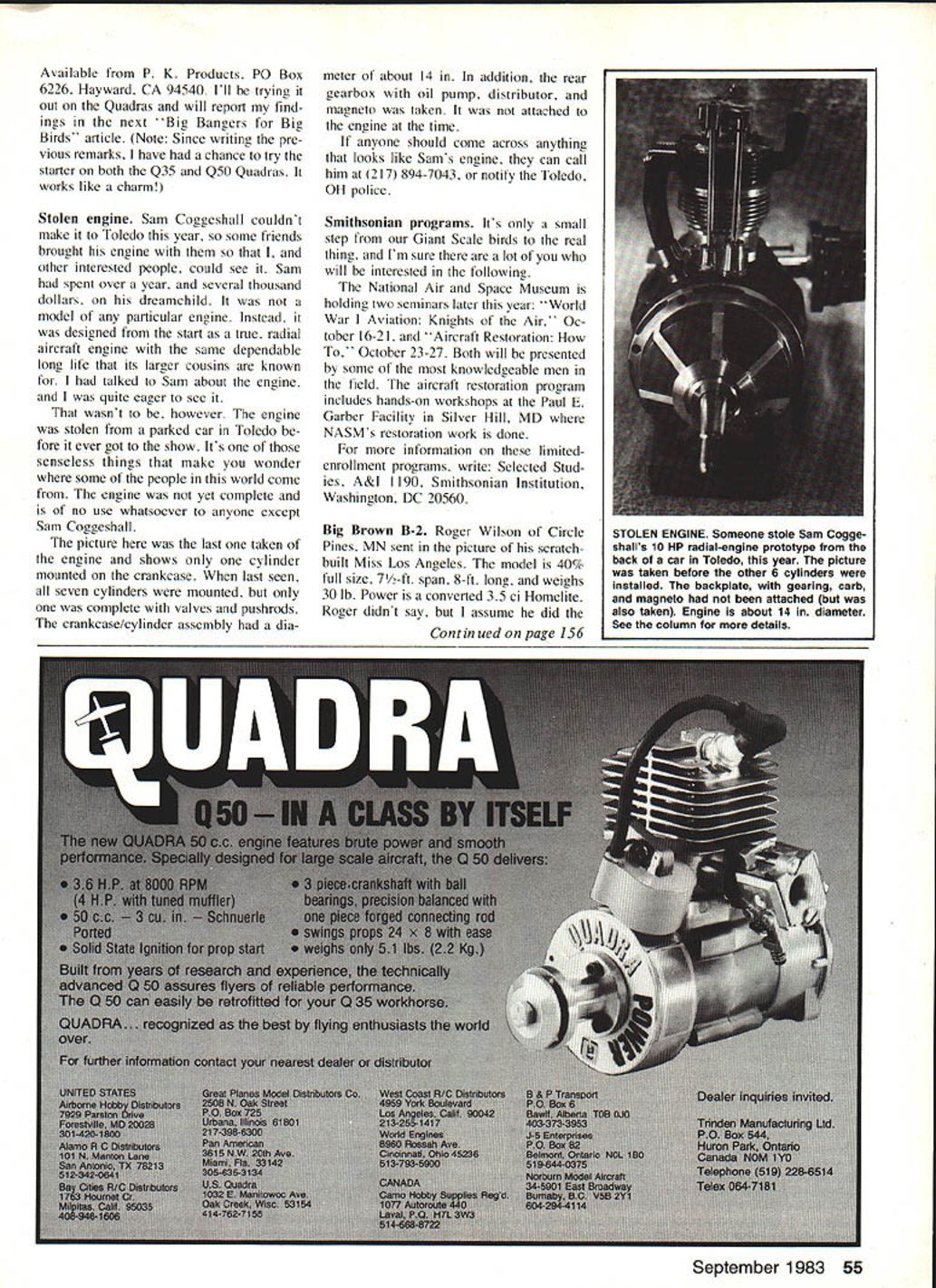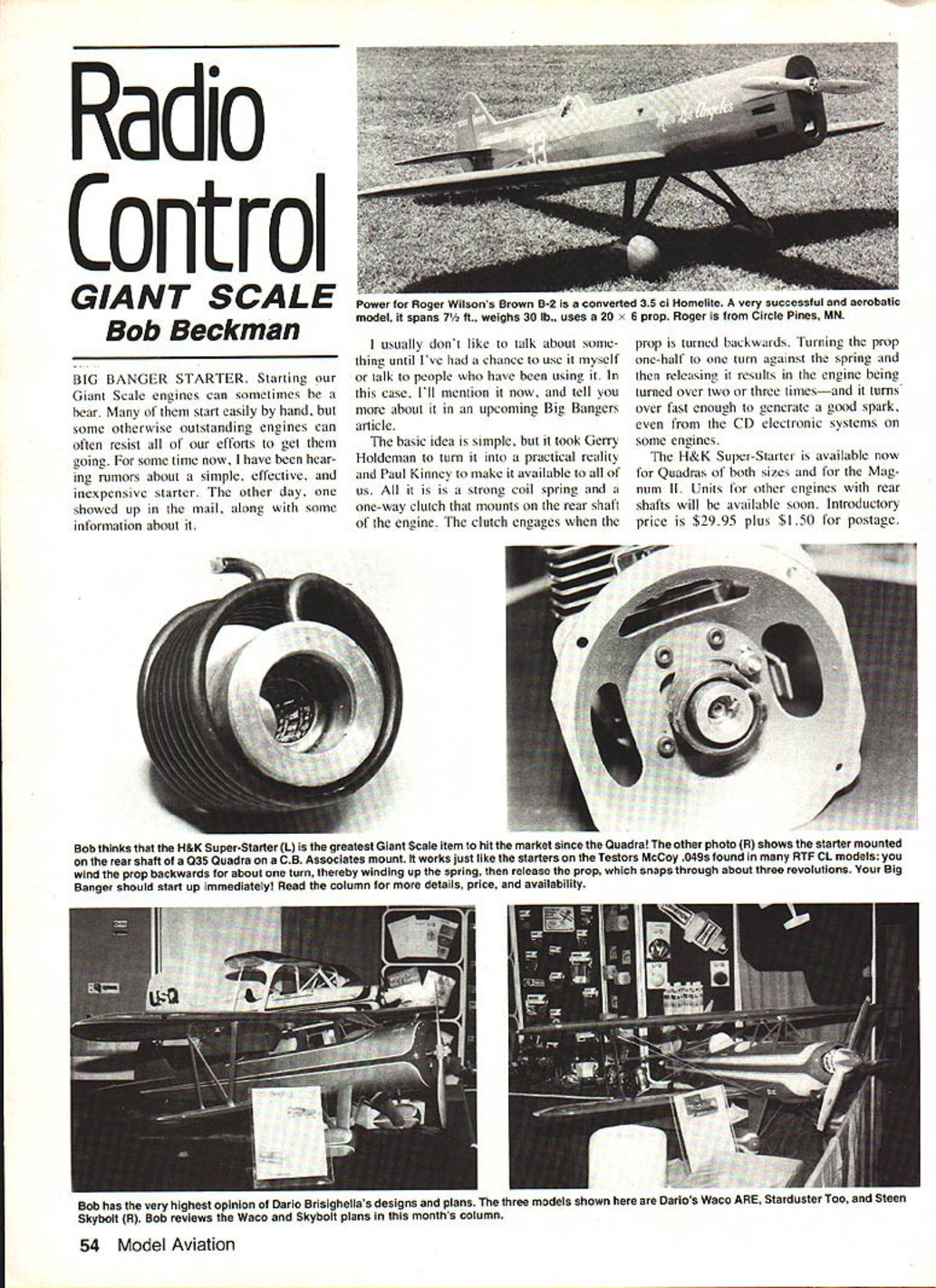 Radio Control GIANT SCALE Bob Beckman BIG BANGER STARTER Starting Giant Scale engines can sometimes bear start easily hand some otherwise outstanding engines can often resist efforts get going some time now have hear ing rumors about simple effective inexpensive starter other day showed up mail along some information about usually dont like talk about some thing until Ive chance use myself talk people have using case Ill mention now tell about upcoming Big Bangers article basic idea simple took Gerry Holdeman turn practical reality Paul Kinney make available us is strong coil spring one-way clutch mounts rear shaft engine clutch engages prop turned backwards Turning prop one-half turn against spring releasing results engine being turned over two three timesand turns over fast enough generate good spark CD electronic systems some engines H&K Super-Starter available now Quadras both sizes Mag num II Units other engines rear shafts will available soon Introductory price $2995 plus SI 50 postage Bob thinks H&K Super-Starter L greatest Giant Scale item hit market since Quadra other photo R shows starter mounted rear shaft 035 Quadra CB Associates mount works just like starters Testors McCoy 049s found RTF CL models wind prop backwards about turn thereby winding up spring release prop snaps through about three revolutions Big Banger should start up immediately Read column details price availability Bob has very highest opinion Darlo Brisighellas designs plans three models shown Darios Waco ARE Starduster Too Steen Skybolt R Bob reviews Waco Skybolt plans months column 54 Model Aviation Iower ror oger wilsons Brown B-2 converted 35 ci Homelite very successful aerobatic model spans 7 ft weighs 30 lb uses 20 x 6 prop Roger Circle Pines MN Available P K Products P0 Box 6226 Hayward CA 94540 Ill trying out Quadras will report find ings next Big Bangers Big Birds article Note Since writing pre vious remarks have chance try starter both Q35 Q50 Quadras works like charm Stolen engine Sam Coggeshall couldnt make Toledo year some friends brought engine other interested people could see Sam spent over year several thousand dollars dreamchild model particular engine Instead designed start true radial aircraft engine same dependable long life its larger cousins known talked Sam about engine quite eager see wasnt however engine stolen parked car Toledo fore ever got show Its senseless things make wonder some people world come engine yet complete no use whatsoever anyone except Sam Coggeshall picture last taken engine shows cylinder mounted crankcase last seen seven cylinders mounted complete valves pushrods crankcase/cylinder assembly dia meter about 14 addition rear gearbox oil pump distributor magneto taken attached engine time anyone should come across anything looks like Sams engine can call him 217 894-7043 notify Toledo OH police Smithsonian programs Its small step Giant Scale birds real thing Im sure lot will interested following National Air Space Museum holding two seminars later year World War Aviation Knights Air' Oc tober 16-21 Aircraft Restoration October 23-27 Both will presented some knowledgeable men field aircraft restoration program includes hands-on workshops Paul E Garber Facility Silver Hill MD NASMs restoration work done information limitedenrollment programs write Selected Stud ies A&l 1190 Smithsonian Institution Washington DC 20560 Big Brown B-2 Roger Wilson Circle Pines MN sent picture scratchbuilt Miss Los Angeles model 40% full size 7-ft span 8-ft long weighs 30 lb Power converted 35 ci Homelite Roger didnt say assume did September 1983 55 Continued page 156 STOLEN ENGINE Someone stole Sam Cogge shalls 10 lIP radial-engine prototype back car Toledo year picture taken before other 6 cylinders installed backplate gearing carb magneto attached also taken Engine about 14 diameter See column details SiTongly recommend fuel its consistency dependability weather condition Orlando G Ruiz EXPERT PATTERN WINNER 1982 TANGERINES INT THIS RiEI FEATURES RUST PRR/EN11ON AGENTS eDEIERGENTS OLUBRICAllON WrTH HIGH FLASH POINTS OWEfliNG AGENTS FOR MORE EFFICIENT AND DEPENDABLE FUEL FLOW eANTI-FOAMING AGENTS TO PREVENT LEAN RUNS KEEPS YOUR ENGINE RUNNING COOL SAN ODORLESS HIGHLY REFINED FUEL CHILDPROOF UDS Available FAI 5 10 15 25 & 40% Nilro-Methane Contents Foirnulated synthetic lubricants AJso availate castor DEALERS WANTED This competition fuel fast becoming THE CHOICE Mth top profesionals tint cash product Contact us price structures Ordering information Major Brand Distributors Model Engines Kits Radios accessories SUPER K Fuels brand KiNGS RADIO CONTROL HOBBIES INTERNATIONAL 3960 West 16 Ave Hialech Florida 33012 305 557-2024 get hot fail DONT oil motoroil bad brushes DONT store battery pack totallydischarged conditionit may take charge later DONT show off too much bench runsthings can overheat Finally DO get started O-T electric flying will enjoy clean quiet propulsion system starts flip throttle lever Nete en Ni-Cd batteries want fly once twice per flying session Ni-Cds must able accept fast charge beauty fast-charge cells may charged rate standard quick fast damage charging rates defined below C I-hour charge current Ni-Cd cell charge current cio C/20 c/3 C/S C 4C charging Time hr iOta 20 3 5 1 illustrate Lets use 600 mAli 06 Ah celL charge Rating Standard Quick Fast charge current mA 60 30 200 120 600 2400 charging Time hr 10 20 3 5 1 /4 thanks Dick Huang efforts Now lets go out have good time flying Electric Old-Timers PS thanks wrote offered plans Phil Krafts Ri Fli have set needed now Dee B Mathews 506 South Walnut Greensburg KS 67054 RC Giant Scale/Beckman Continued page 55 engine conversion himself Roger using split-battery system have described past servos powered 12 Ah battery receiver its own 500 mAh pack says hasnt glitch yet did report problem radio originally 5-in spun aluminum spinner commercially-available item installed During some engine runs ground spinner apparently pulle