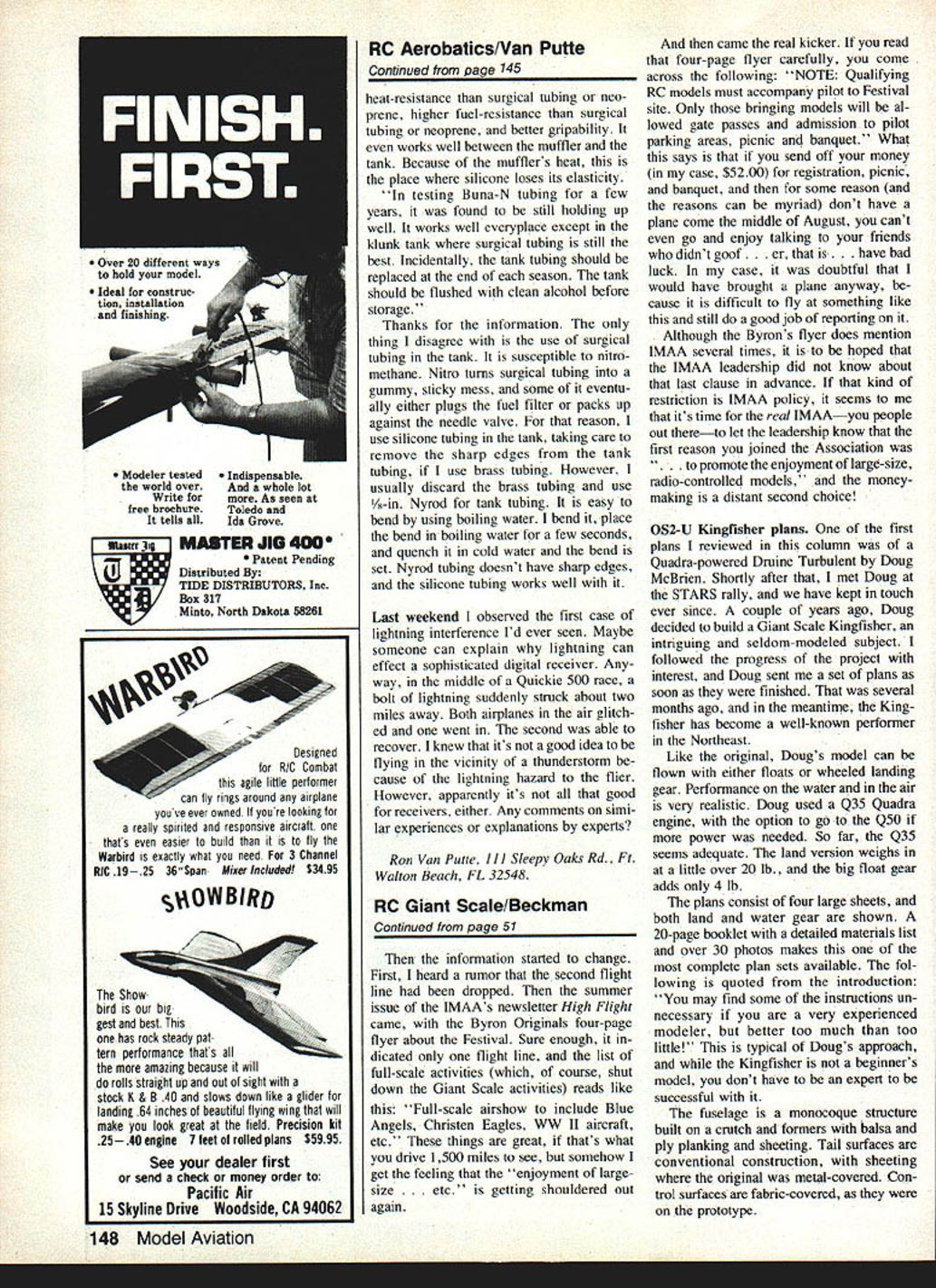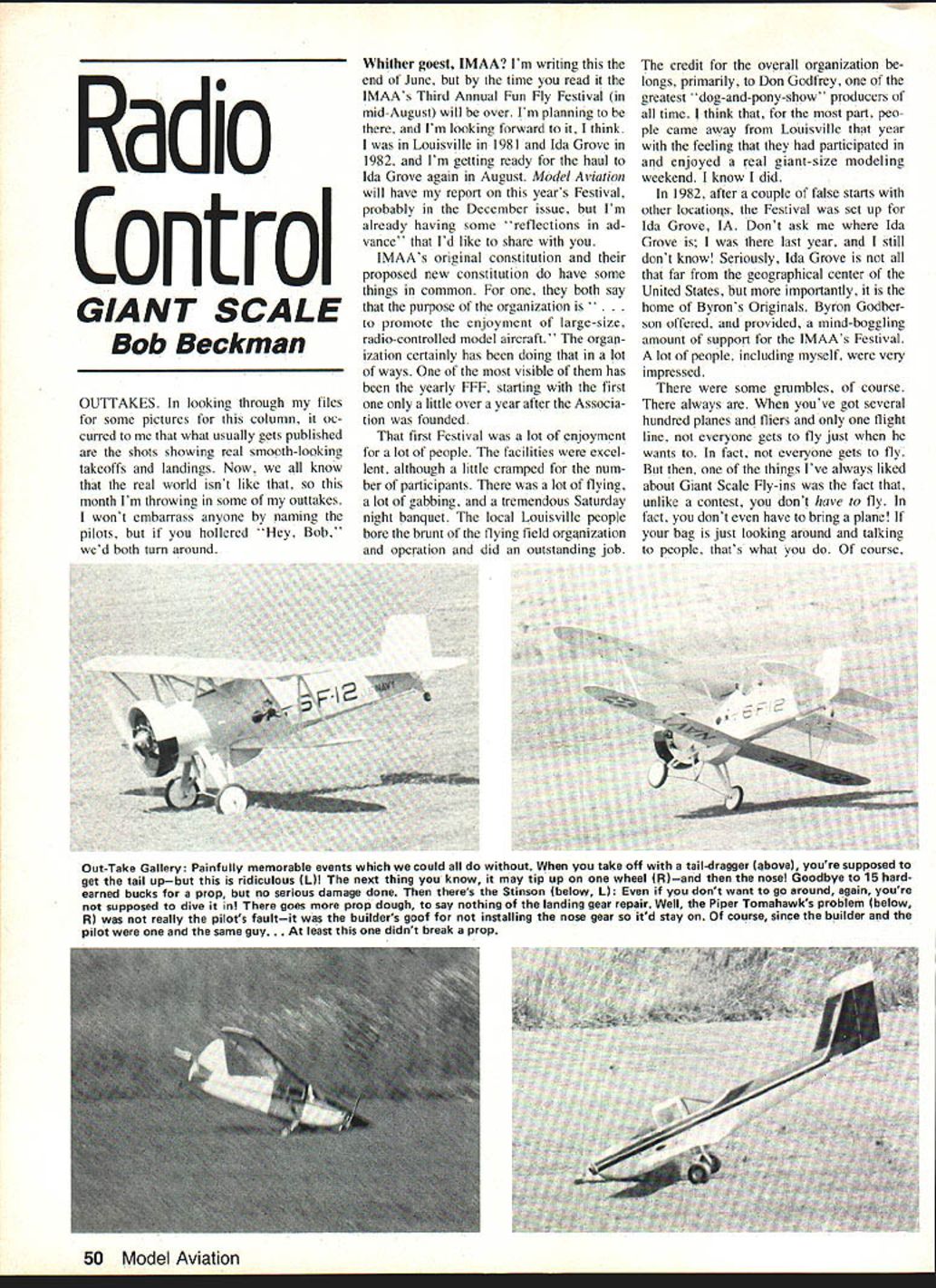 Radio Control GIANT SCALE Bob Beckman OUTTAKES looking through files some pictures column oc cuffed what usually gets published shots showing real smooth-lonking takeoffs landings Now know real world isnt like month Im throwing some outtakes wont embarrass anyone naming pilots hollered Hey Bob wed both turn around Whither goest IMAA Im writing end June time read IMAAs Third Annual Fun Fly Festival mid-August will over Im planning Im looking forward think Louisville 1981 Ida Grove 1982 Im getting ready haul Ida Grove again August Model Aviation will have report years Festival probably December issue Im already having some reflections ad vance Id like share IMAAs original constitution proposed new constitution have some things common both say purpose organization promote enjoyment large-size radio-controlled model aircraft organ ization certainly has doing lot ways visible has yearly FFF starting first little over year after Associa tion founded first Festival lot enjoyment lot people facilities excel lent although little cramped num ber participants lot flying lot gabbing tremendous Saturday night banquet local Louisville people bore brunt flying field organization operation did outstanding job credit overall organization longs primarily Don Godfrey greatest dog-and-pony-show producers time think part peo ple came away Louisville year feeling participated enjoyed real giant-size modeling weekend know did 1982 after couple false starts other locations Festival set up Ida Grove IA Dont ask Ida Grove last year still dont know Seriously Ida Grove far geographical center United States importantly home Byrons Originals Byron Godber son offered provided mind-boggling amount support IMAAs Festival lot people including myself very impressed some grumbles course always youve got several hundred planes fliers flight line everyone gets fly just wants fact everyone gets fly2 things Ive always liked about Giant Scale Fly-ins fact unlike contest donI have fly fact dont have bring plaiie bag just looking around talking people thats what course Out-Take Gallery Painfully memorbIe events could take off tail-dragger boveI youre supposed get tail upbut i ridiculous LII next thing know may tip up wheel RIand nose Goodbye 15 hardearned bucks prop no serious damage done theres Stinson below LI dont want go around again youre supposed dive goes prop dough say nothing landing gear repair Well Piper Tomahawks problem below RI really pilots faultit builders goof installing nose gear itd stay course since builder pilot same guy. least didnt break prop 50 Model Aviation want fly should given maximum opportunity fliers grumbled about Ida Grove could understand problems involved controlling hundreds pilots transmitters went expecting long waits fly What didnt appreciate having wait extended hour two some never getting fly because full-scale flybys aerobatic exhibitions parachute jumps etc Most IMAA members present would have preferred watching Giant Scale model making dead-stick land ing watching professional air show pilot doing same thing course lot people IMAA members biggest lest biggest entertainment events ever come north western Iowa Anyway Byron Godberson way biggest thousands people came miles see show once got paid get wasnt unreason able Byron Originals went lot ex pense set things up theres no reason shouldnt try recover moneyeven make little deal did rankle bit though found expected registered participant pay something like $4 time brought wife got straightened out everybody just left bad taste fact after IMAA people began feel like trained bears used excuse attract crowds Im pressive 82 Fun Fly Festival reflection seems have fallen short really meeting expressed purpose promoting enjoyment large-size radio-controlled models still thought quite show said heard 83 Festival again Ida Grove wasnt overjoyed made tentative plans attend started hearing things going improved over last year Among other things going two flight lines meant expected larger attendance people would get fly sounded encouraging day added fewer full-scale demonstrations sounded like enjoyment large-size radio-controlled models creeping back So wife put calendar sent check off IMAA cover registration fee banquet tickets Continued page 148 * KIT BUILDERS Lighten strengthen nest proiect factory processed graphite glass balsa laminates * SCRATCH BUILDERS Design high-tech composites tsr ultimate strength weight components II you already familiar MAGNALITE composites tryl sample dO includes CF 007 CR 0t4 Rigid graphite sheets CF 250 t /4 ens grain Salsa graphite laminate GB t 25- t /8 end grain balsa glass laminate G 8250- t/4 end grain balsa glass laminate Graphite gods 1375 t /4 diameter Brochure Shows louse composite Parliol islieg sizes prices available CF DOe24. 0 CF Or4 5 e24StOOd C F 250 60 t25t3gO GB t25 t$ 700 Promotional G B 250 2 $ 850 sale price Graphite f/4x24Sf800 gods075 e30$ 450 MilledFiber$750 GlassBalloons t gal $ 6 SD New Sample Kit t5 DO Brochure tOO VISA MASTERtARD COD CHECK OR MONEY ORDER Florida Residents Add 5% Sales Tao Add $300 Poseoge & Handling Sales information CENTRAL FLQRIEA HOBBIES 40f State Rd 434Altamonte Springs Florida 3270r Phone 305 780-3710 Sam Leonard Proprietor Nor AVIONIUS TAGHOES3MoNITOR get cottinuod.eTe CNARG ate RPM re~rgof NI CadMakes pO55lblery accurelect Idl~rubatterI with-safely peak V bat- Aj5tching tinY volt jth dual scaleCheck ok fast charge bY out S d oost top-en age drop 51gnalS r 1 capabiliWtOsi precl ter comboS full 0arge QualW b electronic ORDER YOURS NOW 79Id Send check money order no coDs NorOal AVIONIcS Inc PO Box 70956 Sunnyvale CA 94086 california residents add 60/0 tax Add $300 shipping outside continental USA Dealer inquiries invited October 1983 51 / Doug McBriens beautiful 0S2-U Kingfisher certainly no out-take Beautiful 1/5-scale craft flies just like real Plans Excellent reviewed column Designed RIC Combat agile little performer can fly rings around airplane youve ever owned y