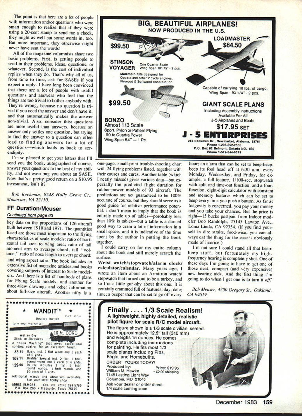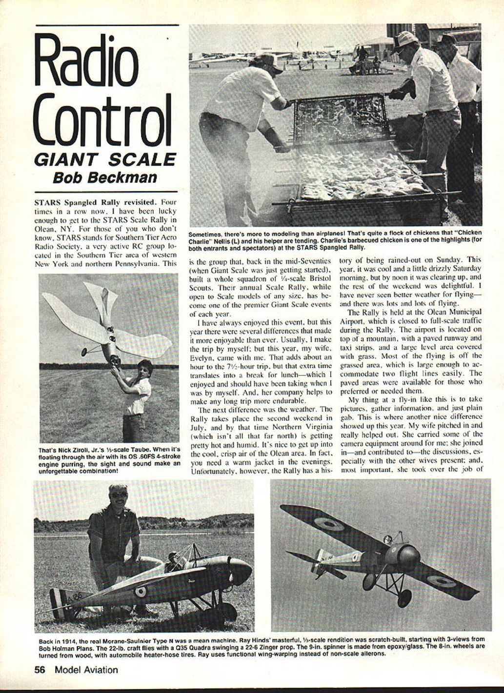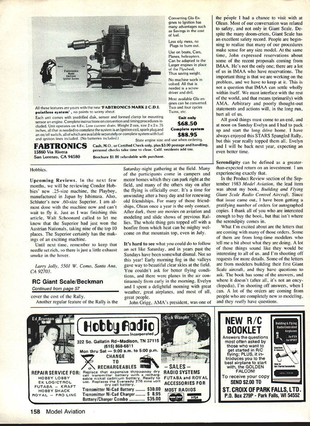 Radio Control GIANT SCALE Bob Beckman STARS Spangled Rally revisited Four times row now have lucky enough get STARS Scale Rally Olean NY dont know STARS stands Southern Tier Aero Radio Society very active RC group lo cated Southern Tier area western New York northern Pennsylvania group back mid-Seventies Giant Scale just getting started built whole squadron /4-scale Bristol Scouts annual Scale Rally open Scale models size has come premier Giant Scale events year have always enjoyed event year several differences made enjoyable ever Usually make trip myself year wife Evelyn came adds about hour 77-hour trip extra time translates break lunchwhich enjoyed should have taking myself company helps make long trip endurable next difference weather Rally takes place second weekend July time Northern Virginia isnt far north getting pretty hot humid Its nice get up cool crisp air Olean area fact need warm jacket evenings Unfortunately however Rally has history being rained-out Sunday year cool little drizzly Saturday morning noon clearing up rest weekend delightful have never seen better weather flyingand lots lots flying Rally held Olean Municipal Airport closed full-scale traffic during Rally airport located top mountain paved runway taxi strips large level area covered grass Most flying off grassed area large enough ac commodate two flight lines easily paved areas available preferred needed thing fly-in like take pictures gather information just plain gab another nice difference showed up year wife pitched really helped out carried some camera equipment around joined inand contributed tothe discussions es pecially other wives present important took over job Back 1g14 real MoraneSaulnier Type N mean machine Ray Hinds masterful 1/3-scale rendition scratch-built starting 3views Bob Holman Plans 22-lb craft flies Q35 Quadra swinging 22-6 Zinger prop 9-in spinner made epoxy/glass 8-in wheels turned wood automobile heater-hose tires Ray uses functional wing-warping instead non-scale ailerons 56 Model Aviation Sometimes theres modeling airplanes Thats quite flock chickens Chicken Charlie Nellis L helper tending Charlies barbecued chicken highlights both entrants spectators STARS Spangled Rally Thats Nick Ziroli Jrs 1/s-scale Taube Wflen its floating through air its OS 6OFS 4stroke engine purring sight sound make unforgettable combination getting needed information about air craft people photographing Some may remember last year Olean got pictures some beautiful models didnt get detailed information should have Evelyn following along behind get data able concentrate finding photographing pretty girlsoops better make pretty air planes lot pretty ones too girls airplanes dont know what final official count Sunday noon some 150 models George Priva teer doing counting cant guar antee aircraft models pits handful Giant Scale participants aircraft bound some waiting fly two flight lines operating always about half-dozen planes air waits excessive no demonstrations full-scale flybys other special events time devoted what people came enjoyment large-size model aircraft talked lot pilots heard no complaints nicer regular features Rally barbecued chicken dinner right field past has served noon Saturday year after scheduled flying ended 500 pm cooking chicken always handled STARS member Charles Nellis affectionately known obvious rea sons Chicken Charlie year charcoal pit seems get biggerit now measures about four ft 15 ft Half barbecued chicken plus vegetables sal ads rolls etc made STARS Ladies Auxiliary makes welcome meal end great day flying great chicken dinner great bar gain too Spectators get about $250 participants its reason able free Since no registration fee participants its hard see STARS secret spectators flock mountain top year see show charged modest parking fee split two ways Part goes local charities rest helps Continued vaze 158 December 1983 57 Nick Ziroli Sr has nice touch triplanestake Sopwith L example scale 2 ft its tad under 1/4-scale Nick sells plans also Fokker DR-i Wendell Hostetler R looks quite pleased latesta Piper Vagabond sells Giant Scale plans Woody Haggerty L finally broke out smile instant after Bob snapped picture 1/3-scale Jungman Pilot kit weigfls 20 lb Joel Wcelas 1/3-scale Corben Super Ace nice size uses 035 power Ralph Bruners 1/3-scale Howard Ike based 3-view book Air Racer uses 035 power Zinger 20-8 prop weighs 191/2 lb Flight performance outstanding Wendell Hostetlers Jungmeister R touches down after beautiful flight know its landing Check elevator angle takeoff get tail up high would require noticeable amount down-elevator Converting Gb En gines Ignition has advantages such Savings cost fuel Less oily mess no Plugs burn Out Use boats Cars Planes helicopters Can adapted Larger engines place Flywheel Thus saving weight No machine work volved needed screw driver drill Most available Gb en gines can converted features youi w four cycles pointless sstens oints worry ouTwins etc unit comes predrilled disk sensor formed clamp mounting Unit sensor engine Complete instructions convertion timing procedures cluded Unit operates 48 v Low current drain Weight 2 ozs size 2 x 2x 75 $6850 inches needed complete system Ignition coil spark plug Complete system on/off switch available separately complete system fuel $8895 ignition lines included No batteries included State engine size use ordering FABTIIONICSCash MO Certified Check plus $300 postage handling 15860 Via Riverapersonal checks take time clear Calif residents add sax San Lorenzo CA 94580 Hobbies Upcoming Reviews next few months will reviewing Condor Hob bies new 25-size machine Playboy manufactured Japan Ishimasa Also Schluters new 60-size Superior am al done machine now cant wait fly Just finishing article Walt Schoonard called let know Superior just won Austrian Nationals taking nine top 10 places Superior certainly has mak ings exciting machine Until next time remember keep needle set rich just little exhaust smoke hover L