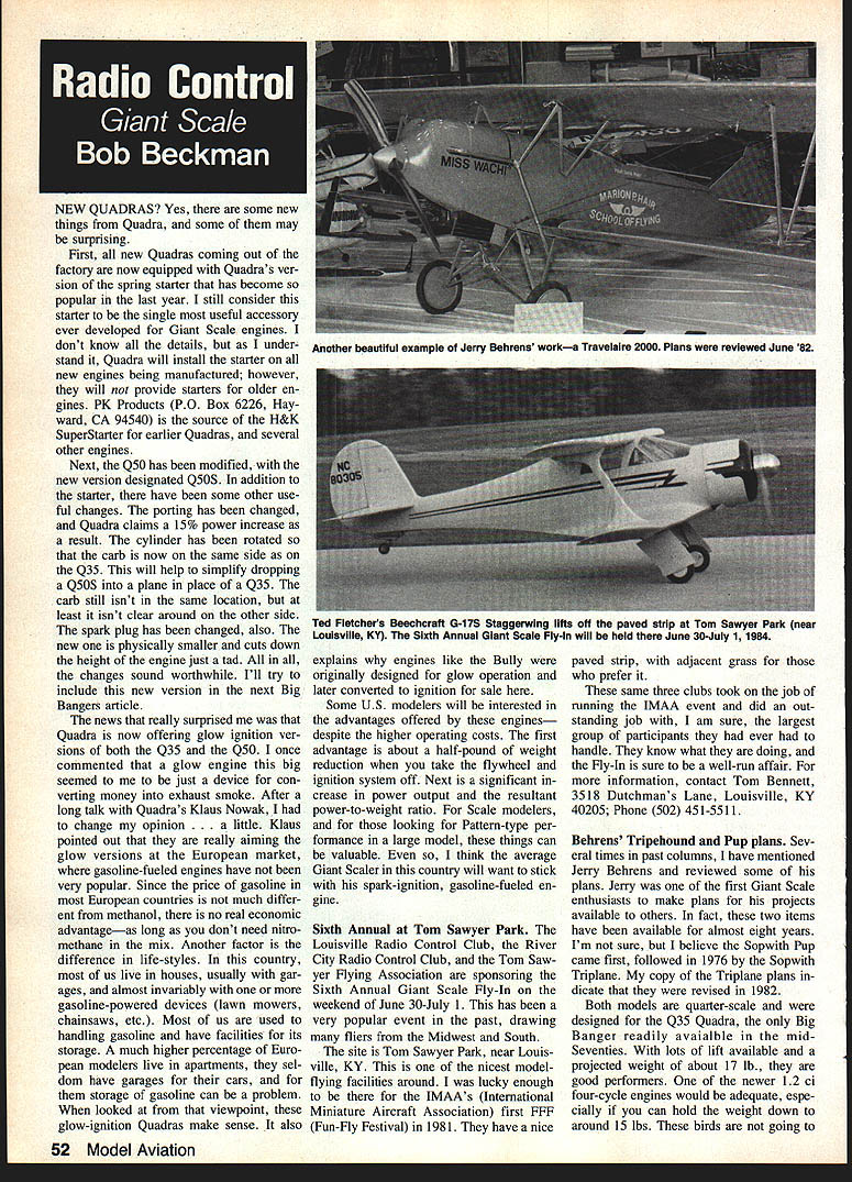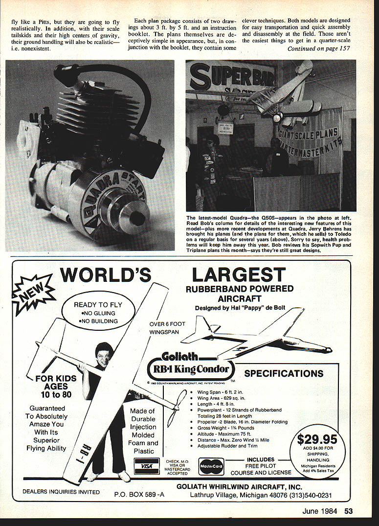 NEW QUADRAS Yes some new things Quadra some may surprising First new Quadras coming out factory now equipped Quadras ver sion spring starter has become popular last year still consider starter single useful accessory ever developed Giant Scale engines dont know details under stand Quadra will install starter new engines being manufactured however will provide starters older en gines PK Products PO Box 6226 Hay ward CA 94540 source H&K SuperStarter earlier Quadras several other engines Next Q50 has modified new version designated Q5OS addition starter have some other use ful changes porting has changed Quadra claims 15% power increase result cylinder has rotated carb now same side Q35 will help simplify dropping Q50S plane place Q35 carb still isnt same location least isnt clear around other side spark plug has changed also new physically smaller cuts down height engine just tad changes sound worthwhile Ill try include new version next Big Bangers article news really surprised Quadra now offering glow ignition ver sions both Q35 Q50 once commented glow engine big seemed to just device con verting money exhaust smoke After long talk Quadras Klaus Nowak change opinion ttle Klaus pointed out really aiming glow versions European market gasoline-fueled engines have very popular Since price gasoline European countries much differ ent methanol no real economic advantageas long dont need nitro methane mix Another factor difference life-styles country us live houses usually gar ages almost invariably gasoline-powered devices lawn mowers chainsaws etc Most us used handling gasoline have facilities its storage much higher percentage Euro pean modelers live apartments sel dom have garages cars storage gasoline can problem looked viewpoint glow-ignition Quadras make sense also explains engines like Bully originally designed glow operation later converted ignition sale Some US modelers will interested advantages offered engines despite higher operating costs first advantage about half-pound weight reduction take flywheel ignition system off Next significant crease power output resultant power-to-weight ratio Scale modelers looking Pattern-type per fonnance large model things can valuable think average Giant Scaler country will want stick spark-ignition gasoline-fueled en gine Sixth Annual Tom Sawyer Park Louisville Radio Control Club River City Radio Control Club Tom Saw yer Flying Association sponsoring Sixth Annual Giant Scale Fly-In weekend June 30-July 1 has very popular event past drawing fliers Midwest South site Tom Sawyer Park near Louis ville KY nicest modelflying facilities around lucky enough IMAAs International Miniature Aircraft Association first FFF Fun-Fly Festival 1981 have nice paved strip adjacent grass prefer same three clubs took job running IMAA event did out standing job am sure largest group participants ever handle know what doing Fly-In sure well-mn affair information contact Tom Bennett 3518 Dutchmans Lane Louisville KY 40205 Phone 502 451-5511 Behrens Tripehound Pup plans Sev eral times past columns have mentioned Jerry Behrens reviewed some plans Jerry first Giant Scale enthusiasts make plans projects available others fact two items have available almost eight years Im sure believe Sopwith Pup came first followed 1976 Sopwith Triplane copy Triplane plans dicate revised 1982 Both models quarter-scale designed Q35 Quadra Big Banger readily avaialble midSeventies lots lift available projected weight about 17 lb good performers newer 12 ci four-cycle engines would adequate espe cially can hold weight down around 15 lbs birds going 52 Model Aviation Another beautiful example Jerry Behrens worka Treveleire 2000 Plans revIewed June 82 Ted Fletchera Beechoraft G-17S Staggerwlng lifts off paved strip Tom Sawyer Park near Louisville KY SIxth Annual Giant Scale Fly-In will held June 30-July 11984 fly like Pitts going fly realistically addition scale tailskids high centers gravity ground handling will also realistic ie nonexistent plan package consists two draw ings about 3 ft 5 ft instruction booklet plans themselves de ceptively simple appearance con junction booklet contain some clever techniques Both models designed easy transportation quick assembly disassembly field arent easiest things get quarter-scale Continued page 157 latest-model Quadrathe Q505appears photo left Read Bobs column details interesting new features modelplus recent developments Quadra Jerry Behrens has brought planes plans sells Toledo regular basis several yaars above Sorry say health prob lems will keep him away year Bob reviews Sopwith Pup Triplane plans monthsays theyre still great designs LARGEST RUBBERBAND POWERED AIRCRAFT WORLDS READY TO FLYDesigned Hal Pappy de Bolt ONO BUILDINGOVER 6 FOOT 46 Gollath _________________ ii King Condor SPECIFICATIONS S S S 0 FOR KIDS AGES 10 80 Guaranteed Absolutely Amaze Its Superior Flying Ability DEALERS INQUIRIES INVITED WINGSPAN S l3GOLI*TH WHISIWINO AIRCRAFT INC PATENT STNAINO 4/ Made Durable Injection Molded Foam Plastic CHECK MO lI4I ACCEPTED z.xMASTERCARD PO BOX 589 -A Wing Span -6 ft 2 Wing Area -629 sq Length -4 ft Bin Powerpant 12 Strands Rubberband Totaling 28 feet Length Propeller -2 Blade 16 Diameter Folding Gross Weight 1 Pounds Altitude Maximum 75 ft Distance Max Zero Wind Adjustable Rudder Trim $2995 ADD $400 FOR SHIPPING INCLUDESHANDLING IIFREE PILOTMichigan Residents LJ COURSE AND LICENSEAdd 4% Sales Tax GOLIATH WHIRLWIND AIRCRAFT INC Lathrup Village Michigan 48076 313540-0231 June 1984 53 flair correctly autorotate safely As far reliability concerned Su perior really holds up blades tend stay track after hardest pullouts would recommend machine anyone looking high-quality general sportcompetition Helicopter careful atten tion should give hours flight before parts start wear As final comment disap pointed aerobatic qualities Superior find ironic machine has done well several contests around world Although Ewald Heim wins Helicopter competitions Europe St