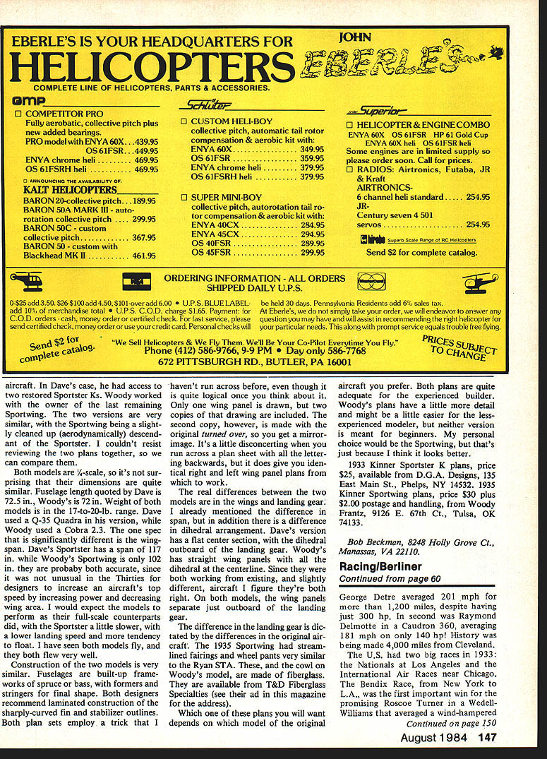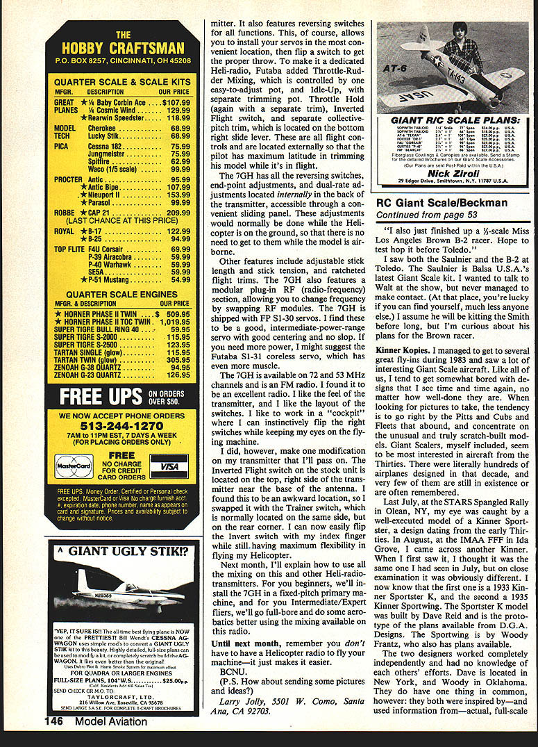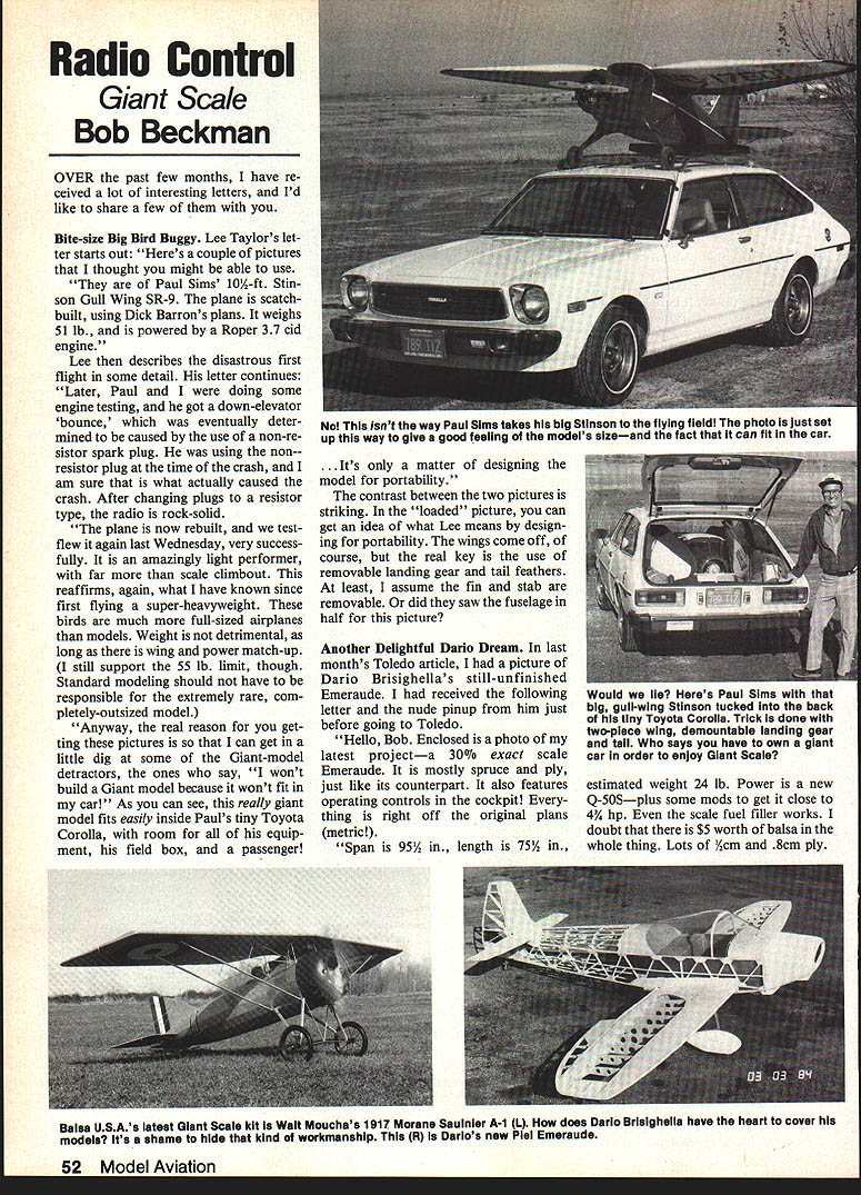 Radio Contml Giant Scale Bob Beckman OVER past few months have re ceived lot interesting letters Id like share few Bite-size Big Bird Buggy Lee Taylors let ter starts out Heres couple pictures thought might able use Paul Sims 101A-ft Stin son Gull Wing SR-9 plane scatch built using Dick Barrons plans weighs 51 lb powered Roper 37 cid engine Lee describes disastrous first flight some detail letter continues Later Paul doing some engine testing got down-elevator bounce eventually deter mined caused use non-re sistor spark plug using non-resistor plug time crash am sure what actually caused crash After changing plugs resistor type radio rock-solid plane now rebuilt testflew again last Wednesday very success fully amazingly light performer far scale climbout reaffirms again what have known since first flying super-heavyweight birds much full-sized airplanes models Weight detrimental long wing power match-up still support 55 lb limit though Standard modeling should have responsible extremely rare com pletely-outsized model Anyway real reason get ting pictures can get little dig some Giant-model detractors ones say wont build Giant model because wont fit car As can see really giant model fits easily inside Pauls tiny Toyota Corolla room equip ment field box passenger . Its matter designing model portability contrast between two pictures striking loaded picture can get idea what Lee means design ing portability wings come off course real key use removable landing gear tail feathers least assume fin stab removable did saw fuselage half picture Another Delightful Dario Dream last months Toledo article picture Dario Brisighellas still-unfinished Emeraude received following letter nude pinup him just before going Toledo Hello Bob Enclosed photo latest projecta 3OVo exact scale Emeraude mostly spruce ply just like its counterpart also features operating controls cockpit thing right off original plans metric Span 95% length 75% Balsa USA5 latest Giant Scale kit Walt Mouchas 1917 Morane Saulnier A-i L does Darlo Brisigheila have heart cover models its shame hide kind workmanship R Darlos new Piel Emeraude 52 Model Aviation No isnt way Paul Sims takes big Stineon flying field photo just set up way give good feeling models sizeand fact can fit car Would ii Heres Paul Sims big gull-wing Stinson tucked back tiny Toyota Corolla Trick done two-piece wing demountabie landing gear tail says have own giant car order enjoy Giant Scale estimated weight 24 lb Power new Q-505plus some mods get close 4% hp scale fuel filler works doubt $5 worth balsa whole thing Lots Acm 8cm ply Progress really slow broke shoulder two days before Christmas operated on February 14 ann left still restraint until March 26 bird will Toledo Itll covered Colortex no paint lacking hundred small details has greatest project really enjoyed doing Scale thing inside out left comment about Darios acci dent because has bearing Emeraude its future Dario lucky didnt lose armor worse As may some permanent impairment use left arm affects building course whats worse makes difficult him work drawing board As result will long time ever before see set beautiful Brisighella plans latest masterpiece Im sure Darios fans join wishing him speedy complete recovery Mouchas Mighty Models Another letter got just before Toledo Walt Moucha Jr Dear Bob Enclosed pictures two latest efforts WW Morane Saulnier A- 1 other bones Smith Miniplane Both A-scale Specs below 1917 Morane Saunier A-I scale span 103 weight 25 lb power 23 Cobra 18/ Zinger prop turns 7500 rpm Chord 19 fuselage diameter 12 fuselage length 68 Smith Miniplane scale power 37 Cobra estimated weight 28 lb Saulnier flies just great very aerobatic loops spins rolls very nicely flew perfectly test flight no trims needed modeled after Cole Palens original Old Rhinebeck Aerodrome New York model taped has simulated rib stitching sure looks good flies just great will sending finished pictures Smith soon can Continued page 146 Another trick two photos same piane Well almost Istheyre both Kinner sport planes Golden mid-Thirties left Dave Reids model 1933 Kinner Sportater K right Ii Woody Frantzs 1935 Kinner Sportwlng ob vious difference between two craft ianding gear fairings Sportwing Lees obvious differences wingspan dihedral onset Sob revIews plans month modei based stiii-xisting prototype WORLDS V FOR KIDS AGES 10 80 Guaranteed Absolutely Amaze Its Superior Flying Ability OVER 6 FOOT WINGSPAN / / Molded Foam Plastic Il LARGEST RUBBERBAND POWERED AIRCRAFT Designed Hal Pappy Bolt GIIath ________________ King Condor / / TM C lfl300LI*rHwHILWINOAIACn*Fr1NC PATENT PENONC / 0 0 Made Durable Injection CHECK M0 VISA OR MASTERCARD ACCEPTED SPECIFICATIONS Wing Span -6 ft 2 Wing Area -629 sq Length -4 ft 8 Powerplant 12 Strands Rubberband Totaling 28 feet Length Propeller -2 Blade 16 Diameter Folding Gross Weight 1 Pounds Altitude Maximum 75 ft Distance Max Zero Wind Adjustable Rudder Trim $2995 ADD $400 FOR SHIPPING INCLUDESHANDLING FREE PILOTMichigan Residents LJ COURSE AND LICENSEAdd 4% Sales Tax DEALERS INQUIRIES INVITED GOLIATH WHIRLWIND AIRCRAFT INC PO BOX 589 -A Lathrup Village Michigan 48076 313540-0231 Aunust 1 984 53 GMAT *1* Baby Corbin Ace 10799 MANES % Cosmic Wind12999 *Rurwln Speedster11899 NOEL Cherokee6899 TECHLucky StIk6899 PICACessna 1827599 Jungowleter7509 6299 PROCTER Antic9599 *Antlc Ups10799 *Nlsupctt II15399 *Psrasol9999 NONE *CAP2120999 LAST CHANCE AT THIS PRICE ROYAL *3-1712299 *3-259499 TOP FLITE F4U Corsair6999 P39 Alruobm5999 P40 Warhawk5999 SESA5999 *P-51 Mustang5499 QUARTER SCALE ENGINES UNI DESCRIPTIONOUR PRICE * HOANER PHASE II TWIN . 995 * HORNER PHASE II TOC TWIN 101995 RING 40 5995 11595 SUPER hONE 5-25K12395 TARTAN SINGLE glow11595 TARTAN iWIN glow30595 ZENOAH 946 QUARTZ9495 ZENOAN 9-23 QUARTZ12695 WE NOW ACCEPT PHONE ORDERS 513-244-1270 7AMto 11PM EST 7DAYSAWEEK FOR PLACING ORDERS ONLY FREE MasteCardl NO CHARGE II _FOR CREDIT LJ CARD ORDERS 145 Model Aviation mitter also features r