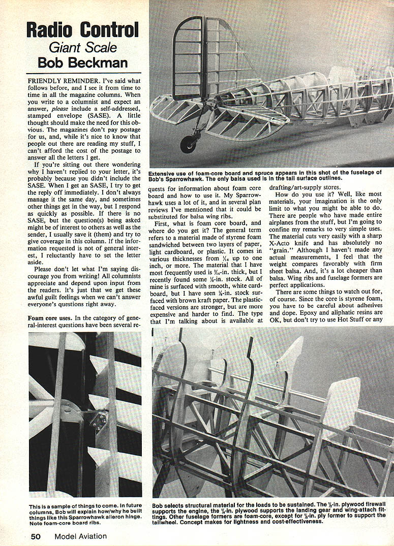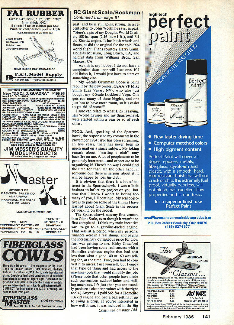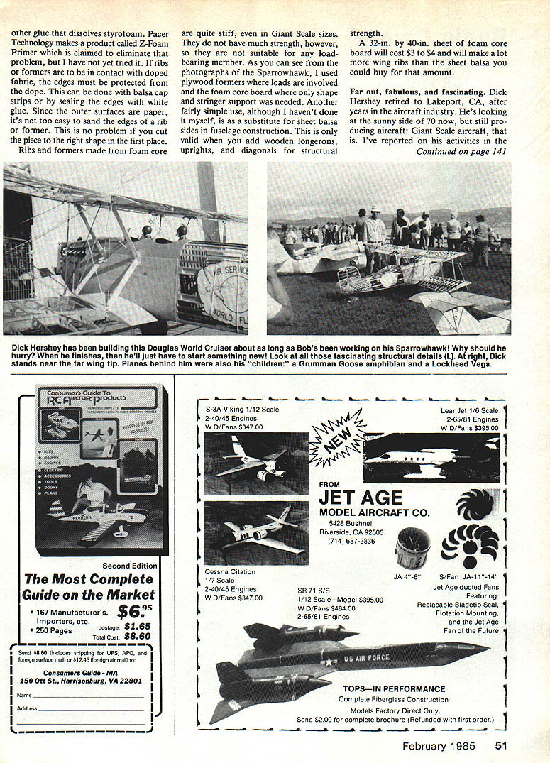 Radio Control Giant Scale Bob Beckman FRIENDLY REMINDER Ive said what follows before see time time magazine columns write columnist expect answer please include self-addressed stamped envelope SASE little thought should make need ob vious magazines dont pay postage us its nice know people out reading stuff cant afford cost postage answer letters get youre sitting out wondering havent replied letter its probably because didnt include SASE get SASE try get reply off immediately dont always manage same day sometimes other things get way respond quickly possible no SASE questions being asked might interest others well sender usually save try give coverage column infor mation requested general inter est reluctantly have set letter aside Please dont let what Im saying dis courage writing columnists appreciate depend upon input readers Its just get awful guilt feelings cant answer everyones questions right away Foam core uses category gene ral-interest questions have several re quests information about foam core board use Sparrowhawk uses lot several plan reviews Ive mentioned could substituted balsa wing ribs First what foam core board get general term refers material made styrene foam sandwiched between two layers paper light cardboard plastic comes various thicknesses /16 up inch material have frequently used %6-in thick recently found some A-in stock surfaced smooth white card board have seen 1-in stock sur faced brown kraft paper plasticfaced versions stronger expensive harder find type Im talking about available II drafting/art-supply stores use Well like materials imagination limit what might able people have made entire airplanes stuff Im going confine remarks very simple uses material cuts very easily sharp X-Acto knife has absolutely no grain Although havent made actual measurements feel weight compares favorably firm sheet balsa its lot cheaper balsa Wing ribs fuselage formers perfect applications some things watch out course Since core styrene foam have careful about adhesives dope Epoxy aliphatic resins OK dont try use Hot Stuff isa sample things come future columns Bob will explain how/why built things like Sparrowhawk aileron hinge Note foam-core board ribs Bob selects structural material f loads sustained 1/2-in plywood firewall supports engine /4in plywood supports landing gear wing-attach f tings Other fuselage farmers foam-core except /8-in ply former support tal lwheel Concept makes lightness cost-effectiveness 50 Model Aviation Extensive use foam-core board spruce p pears shot fuselage Bobs Sparrowhawk balsa used tall surface outlines other glue dissolves styrofoam Pacer Technology makes product called Z-Foam Primer claimed eliminate problem have yet tried ribs formers contact doped fabric edges must protected dope can done balsa cap strips sealing edges white glue Since outer surfaces paper its too easy sand edges rib former no problem cut piece right shape first place Ribs formers made foam core quite stiff Giant Scale sizes have much strength however suitable loadbearing member As can see photographs Sparrowhawk used plywood formers loads involved foam core board shape stringer support needed Another fairly simple use although havent done myself substitute sheet balsa sides fuselage construction valid add wooden longerons uprights diagonals structural strength 32-in 40-in sheet foam core board will cost $3 $4 will make lot wing ribs sheet balsa could buy amount Far out fabulous fascinating Dick Hershey retired Lakeport CA after years aircraft industry Hes looking sunny side 70 now still pro ducing aircraft Giant Scale aircraft Ive reported activities Continued page 141 Consumers Guide MA 150 ott st HarrIsonburg VA 22801 Address r Ii r 3A Viking 1/12 Scale 2 40/45 En nes L lb I Cessna Citation 1/7 Scale 2-40/45 Engines W D/Fans $34700 SR 71 5/5 1/12 Scale Model $39500 W D/Fans $46400 2-65/81 Engines 1 El ti1 JA4-6 S/Fan JA-11-14 Jet Age ducted Fans Featuring Replacable Bladetip Seal Flotation Mounting Jet Age Fan ot Future 1 1 TOPSIN PERFORMANCE Complete Fiberglass Construction Send $200 Models Factory Direct Only complete brochure Refunded first order February 198551 4 Dick Hershey has building Douglas World Cruiser about long Bobs working Sparrowhawkl should hurry finishes hell just have start something newl Look fascinating structural details L right Dick stands near far wing tip Planes behind him also children Grumman Goose amphibian Lockheed Vega Lear Jet 1/6 Scale 2-65/81 Engines W D/Fans $39500 FROM MODEL AIRCRAFT CO 5428 Bushnell Riverside CA 92505 714 687-3836 Second Edition Most Complete Guide Market 167 Manufacturers Importers etc 250 Pages postage $165 Total Cost $860 Send $880 includes shipping fot ups APO foreign surface maul $1245 foreign air maul I I PO Box 3957 TORRANCE CA 90510 DIVISION OF BAR/RICH SALES CO *2 FAIRWAY HANNIBAL MO 63401 314 221-8803 aster it MANUFACTURERS OF SPORT PATTERNSTINGER II PEPPERMINT PATTIE 60SPARTAN PEPPERMINT PATTIE 4OSPORT/SCALE PEPPERMINT PATTIE 15HIPERBIPE RC Giant Scale/Beckman Continued page 51 past still going strong re cent letter John Worth says part Heres pic Douglas World Cruis er 108-in span 216 61 cid Kioritz engine has both wheels floats did original epic 1924 world flight Plans courtesy Harry Gann Douglas Museum Long Beach CA helpful data Williams Bros San Marcos CA As hobby have completion datenor will set did finish would just have start something else /4-scale Grumman Goose being rebuilt new owner QSAA VP Mike Smith Las Vegas NV also just bought Y4-Scale Lockheed Vega gets too biggies just has have room its easier get rid some sure can relate what Dick saying World Cruiser Sparrowhawk started within year other F9C-2 speaking Sparrowhawk response comments November 1984 issue has surprising five years has never much mail single subject joking remark about starting club may backfire lot people seem genuinely interestedand expect organizing Theres no way could find time other hand someone out serious about will hap