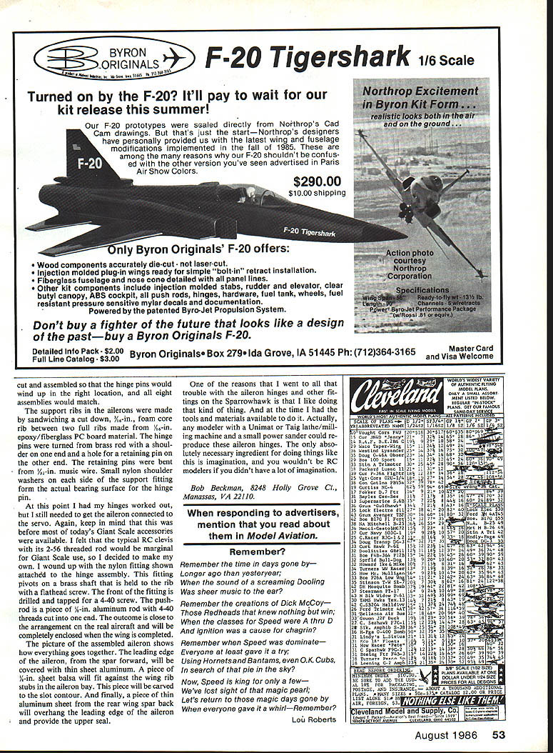 Radio Control Giant Scale Bob Beckman SPARROWHAWK aileron hinges Several times past have published pictures A-scale Curtiss F9C-2 Sparrowhawk have working since Hector pup get lot well-deserved kidding about model time taking get finished Actually its Im such slow builder its matter just working example last time did anything two years ago last January may three years ago havent lost interest project fact Im eager get back finish off before finishes off However seems time turn around something comes up claim time keep working blasted thing reason bring up now still get letters asking questions about specific bits pieces model question keeps coming about aileron hinges somewhat unusual month Ill try answer questions about made made Lets start since have have reason doing something before think about several parts answer first ing wanted reproduce Frise-type ailerons used original alrplane dont know what Frise aileron didnt started Sparrowhawk read next two paragraphs know about skip ahead Most us aware need differ ential throw ailerons An aileron deflected down given distance will produce drag opposite aileron deflected up same distance drag produces yawing moment direction opposite desired turn extreme case could wind up turning left apply right alleron building dif ferential throws aileron linkage make Up aileron travel Down aileron equalize drag components side Frise aileron invented Eng lishman first name have forgotten last name Frise idea seal upper surface Down aileron reduce its drag minimum same time open slot lower surface upper sur face Up aileron thus increasing its effec tiveness drag sounds complicated solution ac tually rather simple involves combination proper shapes leading edge aileron trailing edge aileron bay proper location aileron hinge line hinge line near lower surface well back leading edge aileron deflected down its leading edge re mains close overhanging upper surface wing keeping gap very narrow deflected up leading edge drops down below lower surface airfoil slot opened deflects alrflow lower surface wing onto upper surface aileron sounded great 1930 Curtiss engineers thought just thing new little biplane As turned out Spar rowhawks ailerons still needed significant amount differential Given wanted Frise-type aileron going make hinge Remem ber about eight years ago Yes its long since started Sparrowhawk lot things take granted now werent available doing now would probably use some CB Associ ates strap hinges time ex isted didnt know about needed come up hinge support would ex tend almost two inches rear spar wing take considerable forces could expect large aileron nice things about Giant Scale can often reproduce full-scale way doing something Thats essentially what did case took look Westburg drawings Sparrowhawk include some detail aileron hinge real F9C-2 bolted fitting back rear spar fitting extended through slot leading edge aileron sand wiched between two ribs pivot pin through ribs fitting formed hinge Four assemblies used aileron addition aileron control pushrod tached assemblies final hinge very similar identical full-size alrcraft leading edge aileron lead-filled steel tube acts counterweight tube cut hinge locations allow passage hinge fitting model used brass tube filled solder didnt want weaken lead ing edge cutting designed hinge fitting come down above leading edge fitting cut 0090-in alumi num sheet brackets 0050-in alumi num sheet riveted side Four 2-56 machine screws hold fitting rear spar three pieces fitting carefully control horn hinge L right alieron Bobs still-unfinished Sparrowhawk month teiis hinges disassembied R brackets have riveted support fitting hoies brackets machine screws wiil hold bracket rear wing spar 52 Model Aviation Curtis F9C-2 Spanownuwk InST 500 flaS Deen working longerthan has writing coiumnl wants tell us about alieron hinges month hinge assembied can see far behind aiierons leading edge hinge iine located reiationship pushrod fitting pivot-point hinge line will resuit desired differential throw between ieft right aiierons side R can see access hole ets get screwdriver secure machine screwwhich hoids pushrod pivot pin composite PC-board/foam-core-board sandwich structure aileron rib also obvious view cut assembled hinge pins would wind up right location eight assemblies would match support ribs ailerons made sandwiching cut down Y18-in foam core rib between two full ribs made 5-in epoxy/fiberglass PC board material hinge pins turned brass rod shoul der end hole retaining pin other end retaining pins bent - from A2-in music wire Small nylon shoulder washers side support fitting form actual bearing surface hinge pin point hinges worked out still needed get aileron connected servo Again keep mind before todays Giant Scale accessories available felt typical RC clevis its 2-56 threaded rod would marginal Giant Scale use decided make own wound up nylon fitting shown attached hinge assembly fitting pivots brass shaft held rib flathead screw front fitting drilled tapped 4-40 screw pushrod piece A-in aluminum rod 4-40 threads cut end outcome close arrangement real aircraft will completely enclosed wing completed picture assembled aileron shows everything goes together leading edge aileron spar forward will covered thin sheet aluminum piece 1A-in sjxeet balsa will fit against wing rib stubs alleron bay piece will carved slot contour finally piece thin aluminum sheet rear wing spar back will overhang leading edge aileron provide upper seal reasons went trouble aileron hinges other fit tings Sparrowhawk like doing kind thing time tools materials available Actually modeler Unimat Taig lathe/mill ing machine small power sander could re produce aileron hinges abso lutely necessary ingredient doing things like imagination wouldnt RC modelers didnt have lot imagination Bob Beckman 8248 Holly Grove Cf Manassas VA 22110 responding advertisers mention read about Model Aviation Remember Remember time days gone Longer ago yesteryear soun