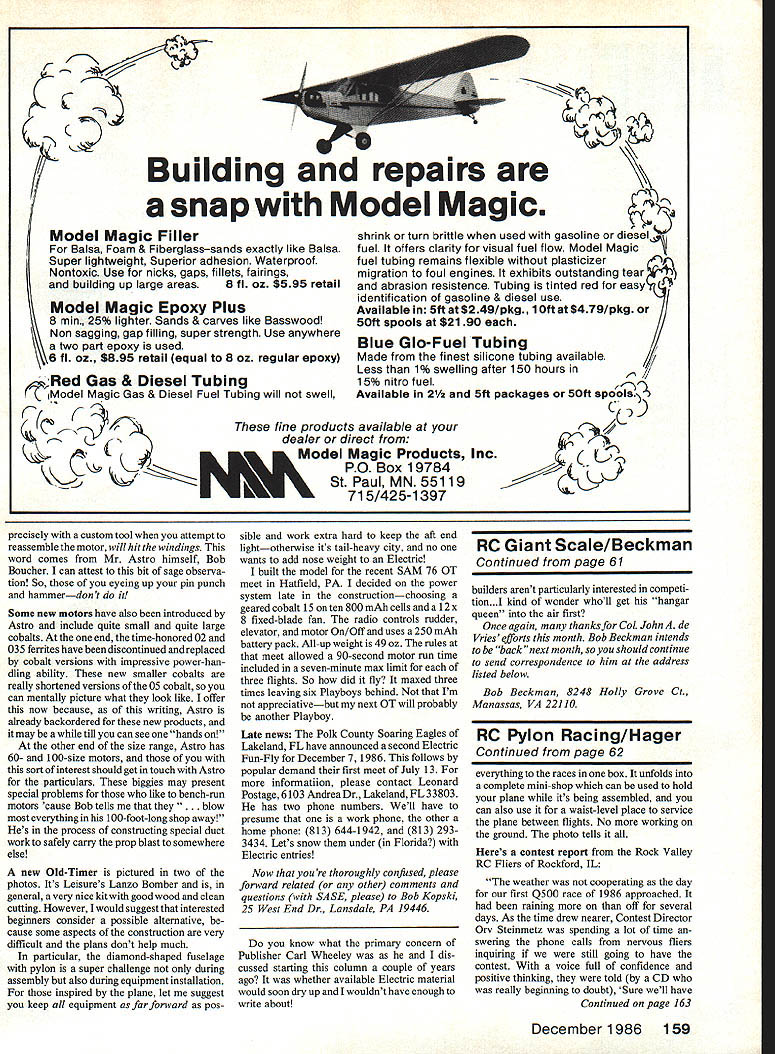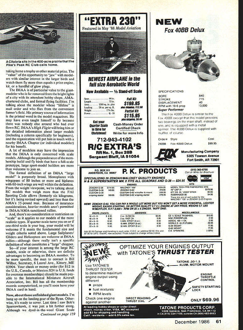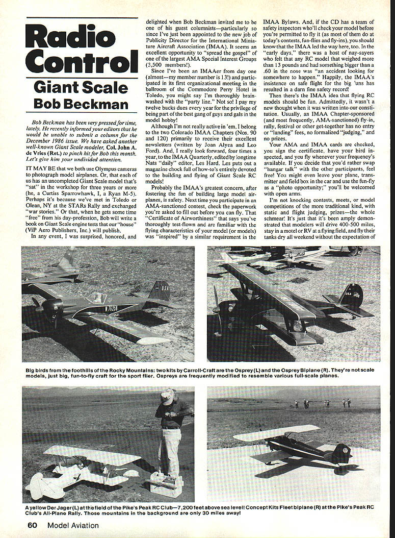 Radio Control Giant Scale Bob Beckman Bob Beckman has very pressed time lately recently informed editors would unable submit column December 1986 issue have asked another well-known Giant Scale modeler Col John de Vries Ret pinch hit Bob month Lets give him undivided attention IT MAYBE both use Olympus cameras photograph model airplanes us has uncompleted Giant Scale model thats sat workshop three years Curtiss Sparrowhawk Ryan M-5 Perhaps its because weve met Toledo Olean NY STARS Rally exchanged war stories gets some time free day-profession Bob will write book Giant Scale engine tests house ViP Aero Publishers Inc will publish event surprised honored delighted Bob Beckman invited guest columnistsparticularly since Ive just appointed new job Publicity Director International Minia ture Aircraft Association IMAA seems excellent opportunity spread gospel largest AMA Special Interest Groups 3500 members Since Ive IMAAer day almostmy member number 13 partic ipated its first organizational meeting ballroom Commodore Perry Hotel Toledo might say Im thoroughly brain washed party line pay twelve bucks dues year privilege being part best gang guys gals model hobby Although Im really active em belong two Colorado IMAA Chapters Nos 90 120 primarily receive excellent newsletters written Joan Alyea Leo Ford really look forward four times year IMAA Quarterly edited longtime Nats daily editor Les Hard Les puts out magazine chock full how-tos entirely devoted building flying Giant Scale RC models Probably IMAAs greatest concern after fostering fun building large model air planes safety Next time participate AMA-sanctioned contest check paperwork youre asked fill out before can fly Certificate Airworthiness says youve thoroughly test-flown familiar flying characteristics model models inspired similar requirement LMAA Bylaws CD has team safety inspectors wholl check model before youre permitted fly todays contests fun-flies fly-ins should know IMAA led way too early days host nay-sayers felt RC model weighed 13 pounds something bigger 60 nose accident looking somewhere happen Happily IMAAs insistence safe flight big uns has resulted darn fine safety record theres IMAA idea flying RC models should fun Admittedly wasnt new thought written consti tution Usually IMAA Chapter-sponsored frequently AMA-sanctioned fly-in rally festival other get-together has no entry landing fees no formalized judging no prizes AMA IMAA cards checked sign certificate have bird spected fly whenever frequencys available decide youd rather swap hangar talk other participants feel free might leave plane trans mitter field box car use fun-fly photo opportunity youll welcomed open arms Im knocking contests meets model competitions traditional kind static flight judging prizesthe whole schmear Its just its amply demon strated modelers will drive 400-500 miles stay motel RV flying field fly tanks dry weekend expectation BIg birds foothills Rocky Mountains two kits Carroll-Craft Osprey L Osprey Biplane R Theyre scale models just big fun-to-fly craft sport flier Ospreys frequently modified resemble various full-scale planes Ayellow DerJagerL atthefield Pikes Peak RC Club7200feet above sea level Concept Kits Fleet biplane R atthe Pikes Peak RC Clubs All-Plane Rally mountains background 30 miles away 60 Model Aviation taking home trophy other material prize value opportunity jaw model ers similar interest larger birds watch fly equals prize engine kit handful glow plugs IMAA particular value giantmodeler far removed bright lights city its attendant hobby shops AMAchartered clubs formal flying facilities Im talking about modeler lifeline mail order flies convenient farmers field primary source information printed word model magazines may have taught himself fly because nobody else around ever flown RC IMAAsHigh Flight will bring him detailed information about larger models including column specifically beginners organization will put him touch nearby IMAA Chapter individual modeler benefit lot modelers may have impression IMAA concerned scale models Although preponderance mem bership build fly birds have full-scale prototype large sport-model builders welcome join us formal definition IMAA large model purposely broad Monoplanes wingspans 80 inches biplanes 60-inch wings well within definition weight viewpoint talking about RC models weigh FAI Sporting Code allows formerly six kilograms its being revised upward less AMAs 55-pound max Because insurance considerations heavier models arent permitted IMAA/AMA-sanctioned rallies theres no consideration restriction scale applies models realistic types quarter-scale turns one-third scale bag model will welcome meets fundamental size weight criteria noted above Large Sailplanes/ Gliders Helicopters welcome IMAA ralliesalthough really isnt specific definition what constitutes large chopper Soif interest among large RC models scale otherwise definite advantages becoming IMAA member specific man contact Bill Wilbur Secretary 6 Laurel Ave Kittery ME 03904 check money order $12 US Canada Mexico $24 US funds overseas memberships should made pay able International Miniature Aircraft Association Inc Bill has membership records computerized youll soon have IMAA card hand Now about unfinished giant models Im hung up landing gear Ryan Other wise its ready cover Last time saw Bobs Sparrowhawk just bit further along Although dyed-in-the-wool Giant Scale Continued page 159 EXTRA 230 Featured rn May 86 Model Aviation Now Avullahim Standiff Scale Span99in Length 72 Areal300sqisspluo Leading28 az per sq ft Weight 17 Iba PowerQ35 Gut mur Quarter Scale Intimater Christiliasl Full Kit $19995 abs shimIn 312Ie Partial Kit $11595 ubssUinb SIN Cash-Money Order Certified Check Write Info ZENOAH 0-38511495 CUSTOM 0-3814995 CUSTOM 0-39 wlapnsg starter16995 MALONEY 100 ZENOAM 13-82 CUSTOM 0-62 wfmatte & meant CUSTOM G92 wfspiing starte NEW Fox 4OBB Delux SPEC IF CAT ONS BORE STROKE DISPLACEMENT RPM 10-6 prop Super Performer Fox