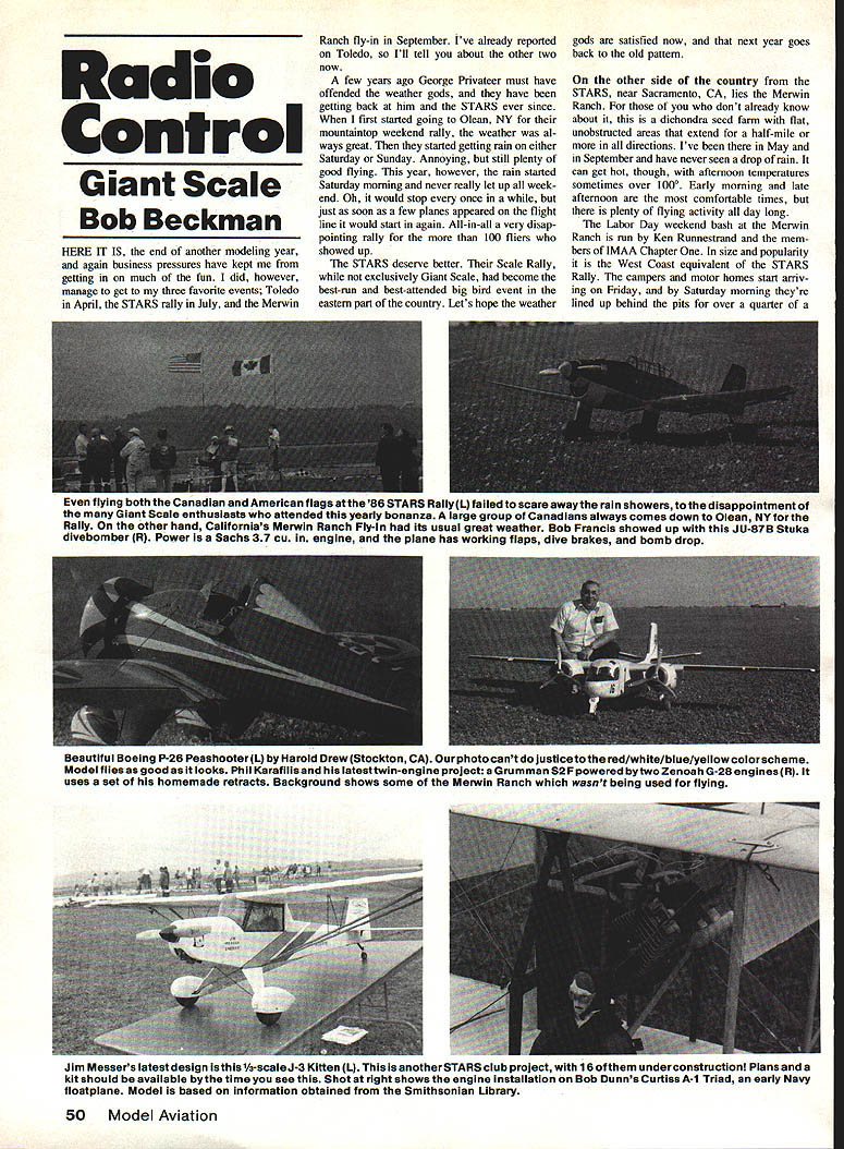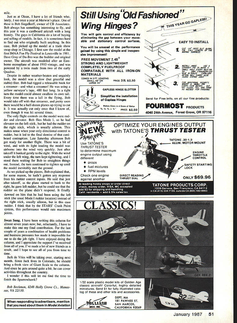 Radio Control Giant Scale Bob Beckman HERE IT IS end another modeling year again business pressures have kept getting much fun did however manage get three favorite events Toledo April STARS rally July Merwin Ranch fly-in September Ive already reported Toledo Ill tell about other two now few years ago George Privateer must have offended weather gods have getting hack him STARS ever since first started going Olean NY mountaintop weekend rally weather al ways great started getting rain either Saturday Sunday Annoying still plenty good flying year however rain started Saturday morning never really let up week end Oh would stop once just soon few planes appeared flight line would start again All-in-all very disap pointing rally 100 fliers showed up STARS deserve better Scale Rally exclusively Giant Scale become best-mn best-attended big bird event eastern part country Lets hope weather gods satisfied now next year goes back old pattern other side country STARS near Sacramento CA lies Merwin Ranch dont already know about dichondra seed farm flat unobstructed areas extend half-mile directions Ive May September have never seen drop rain can get hot though aftemoon temperatures sometimes over 1000 Early morning late afternoon comfortable times plenty flying activity day long Labor Day weekend bash Merwin Ranch run Ken Runnestrand mem bers IMAA Chapter size popularity West Coast equivalent STARS Rally campers motor homes start amy ing Friday Saturday morning theyre lined up behind pits over quarter ven iying DOtfl Tfl tanaaian ana American TiagS atthe 86 STARS Rally CL failed scare awaythe rain showers disappointment Giant Scale enthusiasts attended yearly bonanza large group Canadians always comes down Olean NY Rally other hand Californias Merwin Ranch Fly-In its usual great weather Bob Francis showed up JU-87B Stuka divebomber R Power Sachs 37 Cu engine plane has working flaps dive brakes bomb drop Beautiful Boeing P-26 Peashooter L Harold Drew Stockton CA photo cant justiceto red/white/blue/yellow colorscheme Model flies good looks Phil Karafills latesttwin-engine project Grumman 52F powered bytwo Zenoah G-28 engines CR uses set homemade retracts Background shows some Merwin Ranch wasnt being used flying Jim Messers latest design isthis1/a-scaleJ-3 Kitten L anotherSTARS club project 16 underconstruction Plans kit should available time see Shot right shows engine installation Bob Dunns Curtiss A-i Triad early Navy floatplane Model based information obtained Smithsonian Library 50 Model Aviation mile Just Olean have lot friends lately see once year Merwins place Bob Siegelkoff owner CB Associates Bob always has something interesting fly year cardboard aricraft long history guys California lot buying selling models fact sometimes hard find out originally built anything case Bob picked up model trade show swap shop Chicago first saw model first IMAA Fun Fly Festival Louisville 1981 Dave Gray Du-Bro builder original owner aircraft modeled after Eastborne monoplane about 1910 vintage powered twin made two early Quadras Despite its rather weather-beaten ungainly look model slow graceful stable flier Bob rigged releasable hook streamerand what streamer using yellow surveyors tape 400 feet long tight turn model could almost swallow its own tail time lull flying Bob would take off streamer pretty soon would half-dozen planes up trying cut actually cut once know though hit several times flight controls model rud der elevator Bob flies Mode elevator left stick rudder right stick usually aileron makes sense directional control rudder led final demise card board contraption Late Saturday afternoon Bob got ready another flight bit wind its light loading model airborne wind very quickly Just after takeoff banked gently right wind under left wing turn kept tightening stood waiting Bob straighten things out Instead turn continued tighten up until model inevitably met ground As picked up pieces Bob explained some reason hadnt gotten response rudder control inputs said just after takeoff plane started bank right gave left rudder could see rudder plane didnt respond finally dawned him using left stick usual Mode rudder location instead right stick usually aileron case rudder think STARS Crash Point system performance would rate maximum points Swan Song have writing column almost seven years now reluctantly have make final contribution last couple years combination health problems business pressures has made impossible job right have enjoyed doing column appreciate support Ive received Ive made lot new friends result hope see time time Jack de Vries will taking over starting next month Since Jack lives Colorado should bring fresh view Giant Scale column since gets around quite bit can cover activities throughout country wonder will let find time finish Sparrowhawk Bob Beckman 8248 Holly Grove Ct Manas sos VA 22110 responding advertisers mention read about ModelAviation Still Using bid Fashioned I4/ing Hinges rts3 GO GAPL will gain control efficiency eliminating gap between moveable stationary control surfaces will amazed performance gained using simple inexpen sive improvementl FREE MOVEMENT 450 STRONG AND LIGHTWEIGHT COMPLETELY FUELPROOF COMPATABLE WITH ALL IRON-ON MATERIALS COMES IN 3 FT LENGTHS SMALL 118 ORPRICE 3 ft $250 LARGE 1/4 EASY TO INSTALL CUT I/4 DEEP SLIT ALONG TIE FLEiL LEA/erR O THE AIATRR NEFACES INSTALL IWE USE IGHT P/Al 10 MAKE SM4LL 11015 EVERY INCH OR SODRR CYAAI24CRTLATE GLUE 18/ 1101EGCAPILART 4C770/ 5451 CARRY GLUE AILiNG EAITRE 10/AlT 3 ONAO01TSAOARTI EVERY FEW NGHES CIIT OFF FLUSH FILL AM 54410 AS AESUED FOR FIINSHING Send Free info fine products FOURMOST PRODUCTS 4040 24th Avenue Forest Grove OR 97116 OPTIMIZE YOUR ENGINES OUTPUT IHJ TATONES THRUST TESTER 4flA/ Use TATON ES THRUST TESTER determine maximum engine output using different props fuel mixtures RPM levels Check engine another TATONE 30-13 M MOTOR MOUNT ENGINE THROTTLE CONTROL SAFETY STARTING LOCK January 1987 51 GAPLESS HiNGE SLO