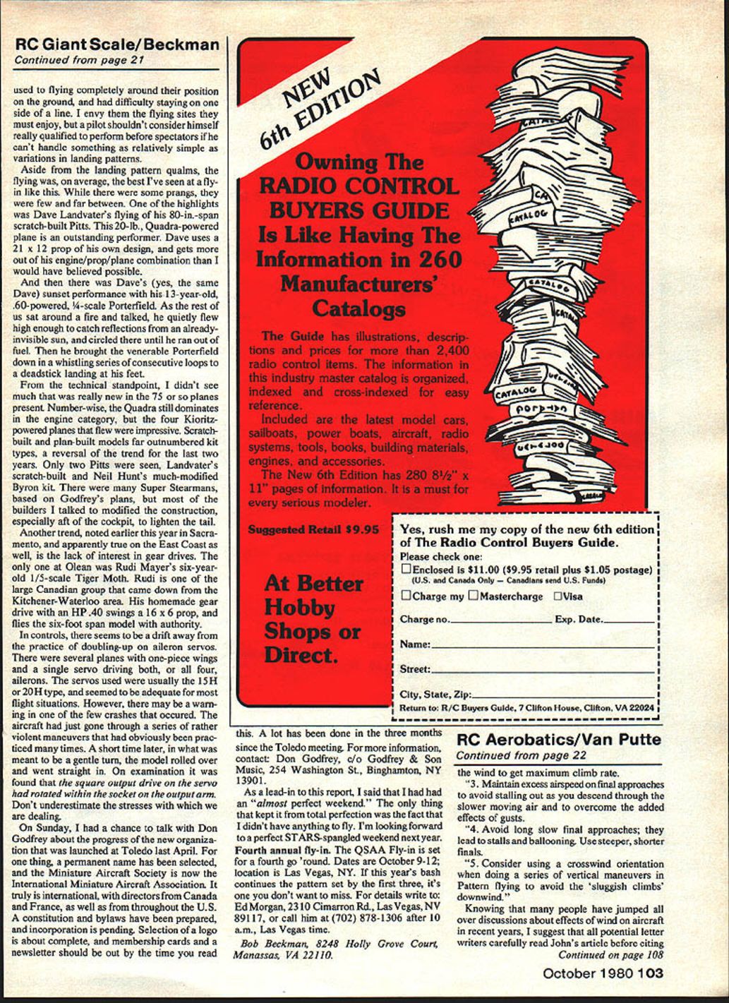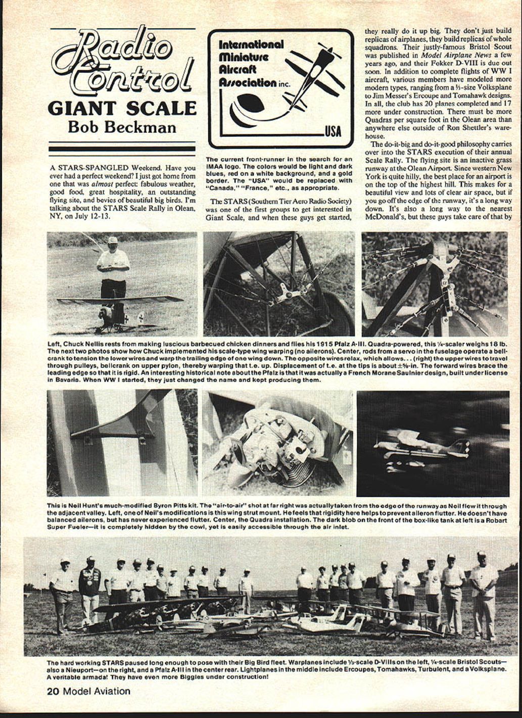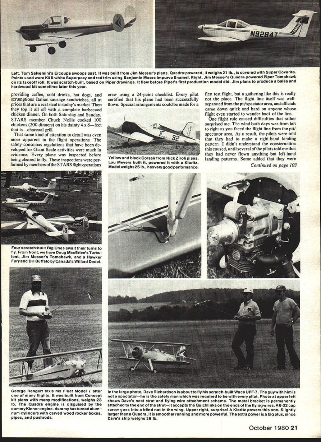 GIANT SCALE Bob Beckman STARS-SPANGLED Weekend Have ever perfect weekend Ijust got home almost perfect fabulous weather good food great hospitality outstanding flying site bevies beautiful big birds Im talking about STARS Scale Rally Glean NY July 12-13 current front-runner search IMAA logo colors would light dark blues red white background gold border USA would replaced Canada France etc appropriate STARS Southern Tier Aero Radio Society first groups get interested Giant Scale guys get started really up big dont just build replicas airplanes build replicas whole squadrons justly-famous Bristol Scout published Model Airplane News few years ago Fokker D-VIII due out soon addition complete flights WW aircraft various members have modeled modern types ranging 1A-size Volksplane Jim Messers Ercoupe Tomahawk designs club has 20 planes completed 17 under construction must Quadras per square foot Glean area anywhere else outside Ron Shettlers ware house do-it-big do-it-good philosophy carries over STARS execution annual Scale Rally flying site inactive grass runway Glean Airport Since western New York quite hilly best place airport top highest hilt makes beautiful view lots clear air space go off edge runway its long way down Its also long way nearest McDonalds guys take care Left Chuck Nellis rests making luscious barbecued chicken dinners flies 1915 Pfalz A-Ill Quadra-powered 14-scalerweighs 18 lb next two photos show Chuck implemented scale-type wing warping no ailerons Center rods servo fuselage operate bellcrank tension lowerwires warp trailing edge wing down opposite wires relax allows - right upperwires totravel through pulleys bellcrank upper pylon thereby warping te up Displacement te tips about %-in forward wires brace leading edge rigid An interesting historical note about Pfalz isthat actually French Morane Saulnier design built under license Bavaria WW started just changed name kept producing Neil Hunts much-modified Byron Pitts kit air-to-air shot far right actuallytaken edge runway Neil flew through adjacent valley Left Neils modifications isthis wing strut mount feels rigidity helpato prevent aileron flutter doesnt have balanced ailerons has never experienced flutter Center Quadra installation dark blob front box-like tank left Robart Super Fuelerit completely hidden cowl yet easily accessible through air inlet hard working STARS paused long enough pose ig uira neet warplanes incluoc v3-scale u-vIIls tne en /4-scale urissoi couTs also Nicuporton right Pfalz A-Ill center rear Lightplanes middle include Ercoupes Tomahawks Turbulent Volksplane veritable armada have Biggies under construction 20 Model Aviation r latmotlomI mlnlotut%% M AliciaftI Left Tom Salveminis Ercoupe swoops past built Jim Messers plans Quadra-powered weighs 21 lb covered Super Coverite Paints used K&B white Superpoxy red trim using Benjamin Moore Impurvo Enamel Right Jim Messers Quadra-powered PiperTomahawk its takeoff roll scratch-built based Piper drawings flew before Pipers first production model did Jim plans produce balsa hardwood kit sometime later year providing coffee cold drinks hot dogs scrumptious Italian sausage sandwiches prices real steal todays market top off complete barbecued chicken dinner both Saturday Sunday STARS member Chuck Nellis cooked 100 chickens 200 dinners dainty 4 x 8feet ischarcoal grill same kind attention detail apparent flight operations safety-conscious regulations have de veloped Giant Scale activities much evidence plane inspected before being cleared fly inspections per fonned members STARS flight operations crew using 24-point checklist pilot certified plane successfully flown Special arrangements could made first test flight gathering like really place flight line itself wellseparated pit/spectator area officials came down quick hard anyone flight started wander back line flight rule caused difficulties rather surprised wind both days left right faced flight line pit spectator area As result pilots told make tight-hand landing pattern didnt understand consternation caused until several pilots told never flown anything left-hand landing patterns Some added Continued page 103 large photo Dave Richardson isaboutto fly hisscratchbuilt Waco UPF-7 guywith him spectatorhe safety man required pilot Photo upper left shows Daves neat strut flying wire attachment scheme metal bracket permanently attached end strutit acceptsthe Quicklinks ends flying wires A6-32 cap screw goes blind nut wing Upper right surprise Kioritz powers Slightly largerthan Quadra smootherrunning powerful extra poweris big plus since Daves ship weighs 29 lb October 1980 21 YellowandblackCorsairfrom NickZiroliplans Lou Meyers built powered Kioritz Modelweighs25 lb hasverygood performance Four scratch-built Big Ones await turns fly front have Doug MacBriensTurbu lent Jim Messers Tomahawk Hawker FuryandDl4 BuffalobyCanadas Willard Dedel Ueorge Rengert taxis Fleet Model 7 after flights built Concept kit plans modifications weighs 23 lb Quadra engine disguised dummy Kinner engine dummy hasturned alumi num cylinders carved wood rocker boxes pipes pushrods RC Giant Scale/Beckman Continued page 21 used flying completely around position ground difficulty staying side line envy flying sites must enjoy pilot shouldnt consider himself really qualified perform before spectators cant handle something relatively simple variations landing patterns Aside landing pattern qualms flying average best Ive seen flyin like some prangs few far between highlights Dave Landvaters flying 80-in-span scratch-built Pitts 20-lb Quadra-powered plane outstanding performer Dave uses 21 x 12 prop own design gets out engine/prop/plane combination would have believed possible Daves yes same Dave sunset performance 1 3-year-old 60-powered -scale Porterfield As rest us sat around fire talked quietly flew high enough catch reflections alreadyinvisible sun circled until ran out fuel brought venerable Porterfield down whistling series consecutive loops