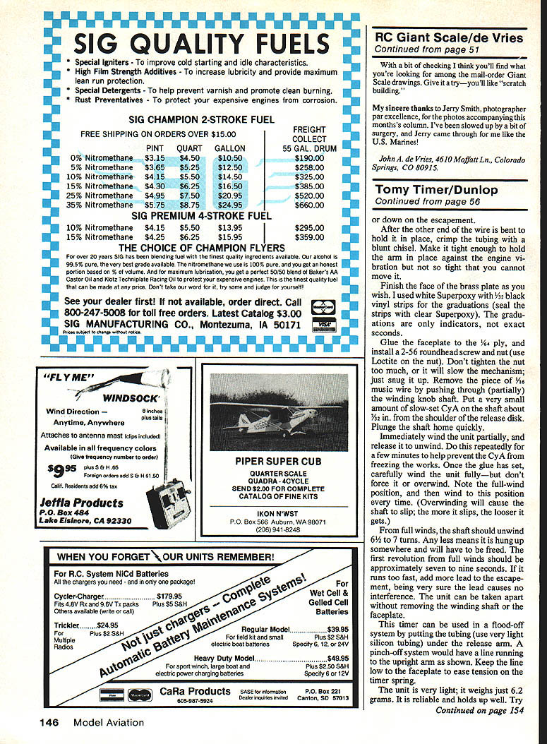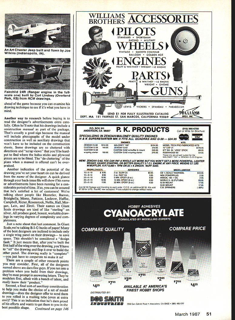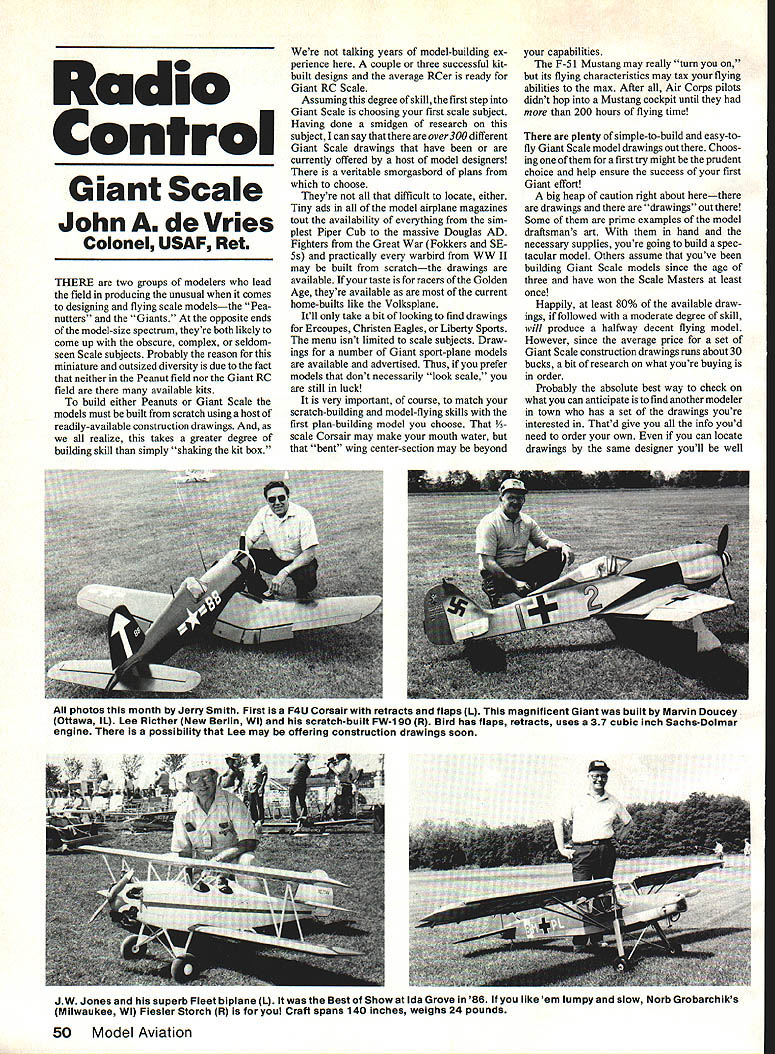 Radio Control Giant Scale John de Vries Colonel USAF Ret THERE two groups modelers lead field producing unusual comes designing flying scale modelsthe Pea nutters Giants opposite ends model-size spectrum theyre both likely come up obscure complex seldomseen Scale subjects Probably reason miniature outsized diversity due fact neither Peanut field nor Giant RC field available kits build either Peanuts Giant Scale models must built scratch using host readily-available construction drawings realize takes greater degree building skill simply shaking kit box talking years model-building ex perience couple three successful kitbuilt designs average RCer ready Giant RC Scale Assuming degree skill first step Giant Scale choosing first scale subject Having done smidgen research subject can say over 300 different Giant Scale drawings have currently offered host model designers veritable smorgasbord plans choose Theyre difficult locate either Tiny ads model airplane magazines tout availability everything sim plest Piper Cub massive Douglas AD Fighters Great War Fokkers SE 5s practically warbird WW II may built scratchthe drawings available taste racers Golden Age theyre available current home-builts like Volksplane Itll take bit looking find drawings Ercoupes Christen Eagles Liberty Sports menu isnt limited scale subjects Draw ings number Giant sport-plane models available advertised Thus prefer models dont necessarily look scale still luck very important course match scratch-building model-flying skills first plan-building model choose Ascale Corsair may make mouth water bent wing center-section may beyond capabilities F-5 1 Mustang may really turn its flying characteristics may tax flying abilities max After Air Corps pilots didnt hop Mustang cockpit until 200 hours flying time plenty simple-to-build easy-tofly Giant Scale model drawings out Choos ing first try might prudent choice help ensure success first Giant effort big heap caution right about herethere drawings drawings out Some prime examples model draftsmans art hand necessary supplies youre going build spec tacular model Others assume youve building Giant Scale models since age three have won Scale Masters least once Happily least 80% available draw ings followed moderate degree skill will produce halfway decent flying model However since average price set Giant Scale construction drawings runs about 30 bucks bit research what youre buying order Probably absolute best way check what can anticipate find another modeler town has set drawings youre interested Thatd glve info youd need order own can locate drawings same designer youll well photos month Jerry Smith First F4U Corsair retracts flaps L magnificent Giant built Marvin Doucey Ottawa IL Lee Ricther New Berlin WI scratch-built FW-1 90R Bird has flaps retracts uses 37 cubic inch Sachs-Dolmar engine possibility Lee may offering construction drawings soon JW Jones superb Fleet biplane 1 Best Show Ida Grove 86 like em lumpy slow Norb Grobarchiks Milwaukee WI Fiesler Storch R Craft spans 140 inches weighs 24 pounds 50 Model Aviation ahead game because can examine drawing technique see its what have mind Another way research before buying read designers advertisements extra care fully Often hell note drawings include construction manual part package Thats usually good sign because manual will include photographs model under construction well auxiliary drawings wont have included construction sheets Some drawings cluttered directions scrap views youll hardput find balsa sticks plywood pieces fitted de-cluttering plans manual offered cant overpraised Another indication potential drawing youve set heart can derived name designer quick glance through back-issue file will show name advertisements have running con siderable period time can assured hes satisfied lot customers talking about people like Hostetler Barron Brisighella Morse Pattison Lockrow Haffke Campbell Ricter Rosenstock Nellis Hall Mor gan Lein Ziroli names Giant Scale drawings kind like sterling silver produce good honest workable draw ings varying degrees complexity com pleteness Just note about last comment Giant Scalewere talking B-I-G hunks paper best designers inclined include single wing panel drawings save space shouldnt considered design fault just means after youve built first half wing over drawing youll have oil drawing flop over build other panel drawing really complete just have cooperate make couple other research points may consider First designers named above dam fine guys run problem build drawings theyre prompt answering letters Theyre modelers first albeit bunch talent really know product Second final sort-of auxiliary consideration help make choice set model drawingsdoes designer offer send rolled mailing tube extra cost indication hes dam proud efforts wants get best possible shape Continued page 146 WILHAMS ACCESSORIES 4 PILOTS STANDARD TSMAN RACING TARY 0 WHEEL AGE TH CONTOUR BALLOON EN AGE 4 ENGINES RATT & WHITNEY HT HONE PARTS Tj5 & WHITNEY HONEWRIGHT E TNJS ZENOAN 0-38$11495MALONEy 100$12495MODEL TECH P95-FABRICATED KIT5 CUSTOM 0-3814995ZENOAH 0-622199572 CAP 21$17995 CUSTOM 0-38CUSTOM 0-62 re/muffler & resent24995877 50 IN JOSS STICK8995 w/sprie5 starter16995CUSTOM 0-62 w/spring starter27995ROBINHOOD 805495 kts well surted MALONEY too ZENOAH G-23 Errgloes NEW ZENOAH G-62 YOU CAN PAYA WHOLE LOT MORE BUT YOU WONT GETA MORE POWERFUL LIGHTER WEIGHJ EASIER STAR17NG OR BETTER QUALITY 37 CL ENGINE ATANY PRICE WEIGHS 51 LBS WIMUFFL ER HR 8000 RPM ON 22 x B ZINGER WUFF SAID PROPS IZINGERIADHESIVESMISCELLANEOUS 16a 6-155 8952 oz SLOW CA$595$1395 19s 8-149952 oz FAST CA595250 25 6-tO10955 MIN EPOXY 19 no1650295 25 9-14tO9515 MIN EPOXY 9 no16562995 22 6-10119530 MIN EPOXY 19 sz6551795 1795 1-30151 Add $250 Postage Handlirrg order COO addihnal $250 Krts add 5755 UPS Visa/UC now accepted Prices sabiect change notrce 1S41 SMImFIHI ZNDUDWflZN8 7550 San Gabrrel Rand caders CA 53422 1 466-t7t7 CB E TAIIWNEEL NOK POWERPLUG 