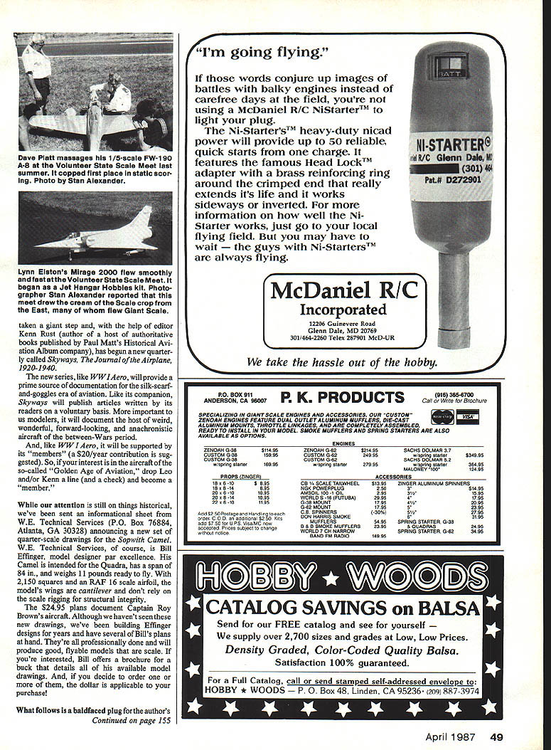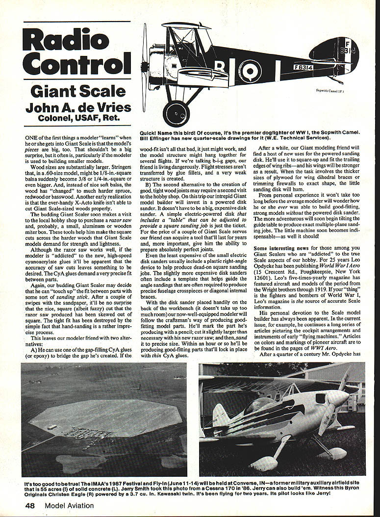 Radio Control Giant Scale John de Vries Colonel USAF Ret ONE first things modeler learns gets Giant Scale models pieces big too shouldnt big surprise often particularly modeler used building smaller models Wood sizes substantially larger Stringers 60-size model might 1/8-in-square balsa suddenly become 3/8 1/4-in-square bigger instead nice soft balsa wood has changed much harder spruce redwood basswood Another early realization ever-handy X-Acto knife isnt able cut Giant Scale-sized woods properly budding Giant Scaler soon makes visit local hobby shop purchase razor saw probably small aluminum wooden miter box tools help him make square cuts across harder woods Giant Scale models demand strength lightness Although razor saw works well modeler addicted new high-speed cyanoacrylate glues itll apparent accuracy saw cuts leaves something desired CyA glues demand avery precise fit between parts Again budding Giant Scaler may decide can touch up fit between parts some sort sanding stick After couple swipes sandpaper itll no surprise nice square albeit fuzzy cut razor saw produced has skewed out square tight fit has destroyed simple fact hand-sanding rather impre cise process leaves modeler friend two alter natives can use gap-filling CyA glues epoxy bridge gap hes created Quick Name bird course its premier dogflghter WW Sopwith Camei Diii Effinger has new quarter-scale drawings WE Technlcai Services wood-fit isnt bad just might work model structure might hang together several flights talking b-i-g gaps friend living dangerously Flight stresses arent transferred glue fillets very weak structure created B second alternative creation good tight wood joints may require second visit hobby shop trip intrepid Giant model builder will invest powered disk sander doesnt have big expensive disk sander simple electric-powered disk includes table can adjusted provide square sanding job just ticket price couple Giant Scale servos friend can acquire tool thatll last years important glve him ability prepare absolutely perfect joints least expensive small electric disk sanders usually include plastic right-angle device help produce dead-on square sanding jobs slightly expensive disk sanders often include template helps guide angle sandings often required produce precise fuselage crosspieces diagonal internal braces disk sander placed handily back workbench doesnt take up too much room now-well-equipped modeler will follow craftsmans way producing goodfitting model parts Hell mark part hes producing pencil cut slightly larger necessary new razor saw andthensand precise size Within hour hell producing good-fitting parts thatll lock place thin CyA glues After Giant modeling friend will find host new uses powered sanding disk Hell use square-up fit trailing edges wing ribsand wings will stronger result task involves thicker sizes plywood wing dihedral braces trimming firewalls exact shape little sanding disk will hum personal experience wont take too long before average modeler will wonder ever able build good-fitting strong models powered disk sander adventurous will soon begin tilting guide table produce exact multiple-plane sand ing jobs little machine soon becomes mdi spens ableas well should Some interesting news among Giant Scalers addicted true Scale aspects hobby 25 years Leo Opdycke has publishing World WarlAero 15 Crescent Rd Poughkeepsie New York 12601 Leos five-times-yearly magazine has featured aircraft models period Wright brothers through 1919 thing fighters bombers World War Leos magazine source accurate Scale information personal devotion Scale model builder has always apparent current issue example continues long series articles picturing cockpit arrangements instruments early flying machines Articles colors markings pioneer aircraft found pages WWI Aero After quarter century Mr Opdycke has its too good betruel iMAAs 1987 Festival Fly-in June11 -14 will held Converse iNa former miiitaryauxiiiaryairfieid site 55 acres soild concrete L Jerry Smith took photo Cessna 170 86 Jerry can aiso build em Witness Byron Originals Christen Eagle R powered 37 cu Kawasaki twin its flying two years its piiot looks like Jerry 48 Model Aviation Lynn Elatons Mirage 2000 flew smoothly andfastattheVolunteerStateScale Meet began Jet Hangar Hobbles kit Photo grapher Stan Alexander reported meet drew cream Scale crop East flew Giant Scale taken giant step help editor Kenn Rust author host authoritative books published Paul Matts Historical Avi ation Album company has begun anew quarter ly called Skyways Journal ofthe Airplane 1920-1940 new series like WWIAero will provide prime source documentation silk-scarfand-goggles era aviation Like its companion Skyways will publish articles written its readers voluntary basis important us modelers will document host weird wonderful forward-looking anachronistic aircraft between-Wars period like WWIAero will supported its members $20/year contribution sug gested So interest aircraft so-called Golden Age Aviation drop Leo and/or Kenn line check become member attention still things historical weve sent informational sheet WE Technical Services PO Box 76884 Atlanta GA 30328 announcing new set quarter-scale drawings Sopwith Camel WE Technical Services course Bill Effinger model designer par excellence Camel intended Quadra has span 84 weighs 11 pounds ready fly 2150 squares RAF 16 scale airfoil models wings cantilever dont rely scale rigging structural integrity $2495 plans document Captain Roy Browns aircraft Although havent seen new drawings weve building Effinger designs years have several Bills plans hand Theyre professionally done will produce good flyable models scale youre interested Bill offers brochure buck details available model drawings decide order dollar applicable purchase What follows baldfaeed plug authors Continued page 155 going flying words conjure up images battles balky engines instead carefree days field youre using McDaniel R/C NiStarterTM light plug NiStartersT