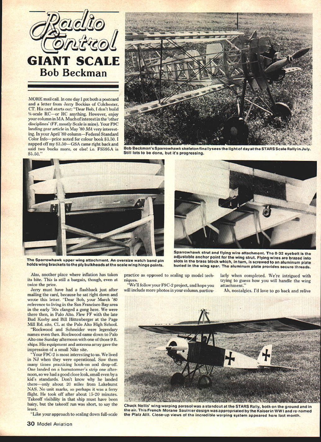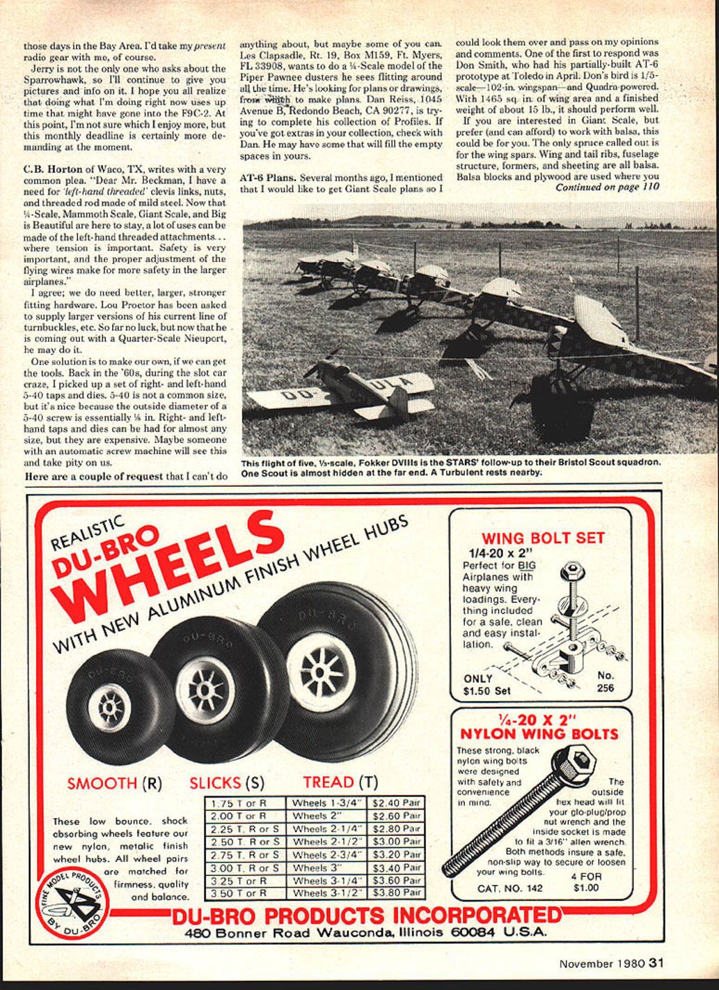 GIANT SCALE Bob Beckman MORE mail call day got both postcard letter Jerry Bockios Colchester CT card starts out Dear Bob dont build A-scale RCor RC anything However enjoy column MA Much interest other disciplines FF mostly Scale F9 C landing gear article May80 MA very interest ing April80 columnFederal Standard Color Infoprice noted colour book $350 zapped off $350GSA came right back said two bucks else ie F5595A $550 Alas another place inflation has taken its bite still bargain though twice price Jerry must have flashback just after mailing card because sat right down wrote letter Dear Bob March 80 reference living San Francisco Bay area early SOs clanged gong Palo Alto Flew FF late Bud Kosby Bill Hittenberger Page Mill Rd site CL Palo Alto High School Rockwood Schneider legendary names Rockwood came down Palo Alto Sunday afternoon 9 ft ships equipment antenna array gave impression small Nike site F9C-2 interesting us lived NJ operationaL Saw times practicing hook-on drop-off landed barnstormers strip after noon good close look small kids standards Dont know landed thereonly about 20 miles Lakehurst NAS No unit marks perhaps ferry flight took off after about 15-20 minutes Takeoff visibility ship must have hairy takeoff run short say least Like approach scaling down full-scale practice opposed scaling up model tech niques Well follow F9C-2 project hope will include photos column particu larly completed intrigued trying guess will handle wing attachment Ab nostalgics Id love go back relive 30 Model Aviation Bob Beckmans Sparrowhawk skeleton finallysees light dayatthe STARSScaIe Rally July Still lots done its progressing Sparrowhawk upper wing attachment An oversize watch band pin holds wing brackets ply bulkheads atthe scale wing hinge points SparrownawK strut ana rlying wire attachment 8-32 eyebolt adjustable anchor point wing strut Flying wires brazed slots brass block turn screwed aluminum plate buried wing spar aluminum plate provides secure threads Chuck Nellis wing warping parasol standout STARS Rally both ground air French Morane Saulnierdesign appropriated bythe Kaiser WW land re-named Pfalz AIIi Close-up views incredible warping system appeared last month days Bay Area Id take present radio gear course Jerry asks about Sparrowhawk Ill continue give pictures info hope realize doing what Im doing right now uses up time might have gone F9C-2 point Im sure enjoy monthly deadline certainly de manding moment CB Horton Waco TX writes very common plea Dear Mr Beckman 1 have need lefth threaded clevis links nuts threaded rod made mild steel Now -Scale Mammoth Scale Giant Scale Big Beautiful stay lot uses can made left-hand threaded attachments. tension important Safety very important proper adjustment flying wires make safety larger airplanes agree need better larger stronger fitting hardware Lou Proctor has asked supply larger versions current line turnbuckles etc So far no luck now coming out Quarter-Scale Nieuport may solution make own can get tools Back 60s during slot car craze picked up set right- left-hand 5-40 taps dies 5-40 common size its nice because outside diameter 5-40 screw essentially l/ Right- lefthand taps dies can almost size expensive Maybe someone automatic screw machine will see take pity us couple request cant anything about maybe some can Les Clapsadle Rt 19 Box M159 Ft Myers FL 33908 wants -Scale model Piper Pawnee dusters sees flitting aroun4 th time Hes looking plans drawings s4Uh make plans Dan Reiss 1045 Avernie B7lkedondo Beach CA 90277 try ing complete collection Profiles youve got extras collection check Dan may have some will fill empty spaces yours AT-6 Plans Several months ago mentioned would like get Giant Scale plans r 44 SMOOTH R low bounce shock obsorbing wheels feoture new nylon metolic finish 1 75T or8Wheels1 -3/4$240Pair 200T or8Wheels2$260Parr 225T 8or SWheels2-1/4$280Pair 2 50T 8or SWheels2-1/2$300Pair 2 75T 8or SWheels2-3/4$320Pair 300T 8or SWheels3$340Pair 325T or8Wheels3-1/4$360Pair 350T or8Wheels3-1/2$380Pair could look over pass opinions comments first respond Don Smith partially-built AT-6 prototype Toledo April Dons bird 1/5scale102-in wingspanand Quadra-powered 1465 sq wing area finished weight about 15 lb should perform well interested Giant Scale prefer can afford work balsa could spruce called out wing spars Wing tail ribs fuselage structure formers sheeting balsa Balsa blocks plywood used Continued page 110 -20 X 2 NYLON WING BOLTS ong b ack r& nyonwngbots e des gned onwy w th safety andThe conven enceoutside n m ndhes head will fit gIn plug/prop nut wrench side socket made fit 3/16 allen wrench Both methods insure safe slip secure loosen wing bolts L CAT NO 142 wheel hubs wheel pa ______________ matched _______________ @ oo4 FOR balance ______ ______ __________________ f mness qual y$1 00 DU-BRO PRODUCTS INCORPORATED 0480 Bonner Road Wauconda Illinois 60084 USA November 198031 flight five 1/3-scale Fokkeris the3110w-up Scout almost hidden far end Turbulent rests nearby r WING BOLT SET 1/4-20 x 2 Perfect BIG lanes heavy wing loadings thing included // /i safe clean easy instalat ion $150 Set- SLICKS 5TREAD CT Frank also scored best flight meet aided 15% bonus last round Standoff flown late fourth day after F4C round wind magically died flights expected trend toward complex planes take advantage bonuses has yet developed Only two F4C biplanes Knowles Tiger Moth Lennas Curtiss XSBC-4 re ceived 15% bonus others 5 10% class relatively simple planes Two years ago Woodvale twin appeared Ottawa two twins Standoff Complex twins require power fly safely pair of30 engines 60 total maximum F4C until 1983 does attract modelers George Roses Curtiss Hawk P6-E leader after first day flying Planes severely damaged wind included folding-wing Westland Widgeon Australia flown Ross Woodcock Cessna Bird Dog L-19 Gerry Fingler Bird Dogs complete exterior constructed molded ABS plastic sheetwhich included much detail such rivets though badly damaged flown 