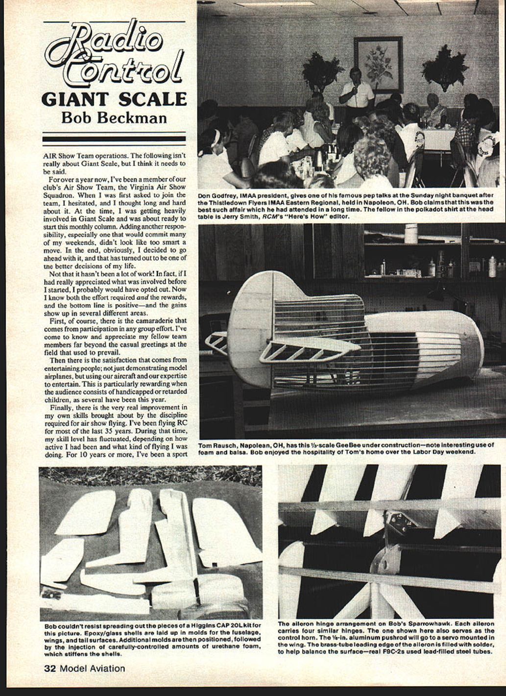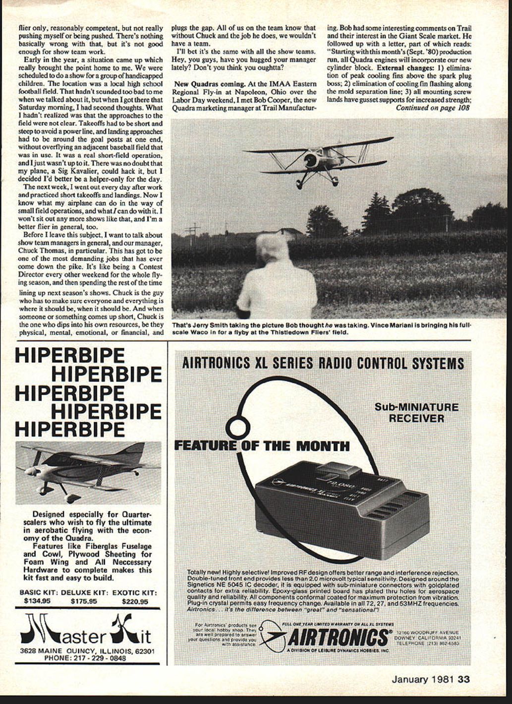 GIANT SCALE Bob Beckman AIR Show Team operations following isnt really about Giant Scale think needs said over year now Ive member clubs Air Show Team Virginia Air Show Squadron first asked join team hesitated thought long hard about time getting heavily involved Giant Scale about ready start monthly column Adding another respon sibility especially would commit weekends didnt look like too smart move end obviously decided go ahead has turned out tue better decisions life hasnt lot work fact really appreciated what involved before started probably would have opted out Now know both effort required rewards bottom line positiveand gains show up several different areas First course camaraderie comes participation group effort Ive come know appreciate fellow team members far beyond casual greetings field used prevail satisfaction comes entertainingpeople notjust demonstrating model airplanes using aircraft expertise entertain particularly rewarding audience consists handicapped retarded children several have year Finally very real improvement own skills brought about discipline required air show flying Ive flying RC last 35 years During time skill level has fluctuated depending active what kind flying doing 10 years Ive sport 32 Model Aviation Don Godfrey IMAA president gives famous pep talks Sunday night banquet after Thistledown Flyers IMAA Eastern Regional held Napoleon OH Bob claimsthatthis wasthe best such affair attended longtime fellow polkadot shirt head table Jerry Smith RCMs Heres editor Tom Rausch Napolean OH has Ia-scale aceBee underconstructionnote interesting use foam balsa Bob enjoyed hospitality Toms home over Labor Day weekend Boo couiant resist spreaaing out pieces Higgins CAP 20L kit picture Epoxy/glass shells laid up molds fuselage wings tail surfaces Additional molds positioned followed injection carefully-controlled amounts urethane foam stiffens shells aileron hinge arrangeni Sparrowhawk acn aileron carries four similar hingesone shown also serves control horn 1/s-in aluminum pushrod will go servo mounted wing brass-tube leading edge aileron filled solder help balance surfacereal F9C-2s used lead-filled steel tubes flier reasonably competent really pushing myself being pushed Theres nothing basically wrong its good enough show team work Early year situation came up really brought point home scheduled show fora group handicapped children location local high school football field hadnt sounded too bad talked about got Saturday morning second thoughts What hadnt realized approaches field clear Takeoffs short steep avoid power line landing approaches around goal posts end overflying adjacent baseball field use real short-field operation Ijust wasnt up no doubt plane Sig Kavalier could hack decided Id better helper-only day next week went out day after work practiced short takeoffs landings Now know what alrplane can way small field operations whatlcan wont sit out shows like Im better flier general too Before leave subject want talk about show team managers general manager Chuck Thomas particular has got demanding jobs has ever come down pike Its like being Contest Director other weekend whole fly ing season spending rest time lining up next season s shows Chuck guy has make sure everyone everything should should someone something comes up short Chuck dips own resources physical mental emotional financial plugs gap us team know Chuck job does wouldnt have team Ill bet its same show teams Hey guys have hugged manager lately Dont think oughtta ing Bob some interesting comments Trail interest Giant Scale market followed up letter part reads Starting months Sept80 production run Quadra engines will incorporate new cylinder block External changes 1 elimina tion peak cooling fins above spark plug boss 2 elimination cooling fin flashing along mold separation line 3 mounting screw lands have gusset supports increased strength Continued page 108 HIPERBIPE HIPERBIPE HIPERBIPE HIPERBIPE HIPERBIPE Designed especially Quarterscalers wish fly ultimate aerobatic flying econ omy Quadra Features like Fiberglas Fuselage Cowl Plywood Sheeting Foam Wing Neccessary Hardware complete makes kit fast easy build BASIC KIT DELUXE KIT EXOTIC KIT $13495$17595$22095 asterit 3628 MAINE QUINCY ILLINOIS 62301 PHONE217229-0848 January 1981 33 New Quadras coming IMAA Eastern Regional Fly-in Napoleon Ohio over Labor Day weekend met Bob Cooper new Quadra marketing manager Trail Manufactur Thats Jerry Smith taking picture Bob thought taking Vince Mariani bringing fullscale waco flyby Thistledown Filers field NEW FOURMOST PRODUCTS Fuselage Fixture Th POIJRMOST FUSELAGE FIXTURE designed Aiefo.heIIy uhgs fuoelage structures built strings inesouring eyeballing Simply slide four centering brack eta truck until align firewall tail joint two bulkheads Clamp fuoeloge together lightly rubber baudo structure will straight track eiee pj nonsedotess.spfosof. FOURMOST PRODUCTS Bomb Release flourtasot Bomb Itelcue nism oiwple hobtoright nhst ideul foe fun fly eceota unit tour Muse provided attach spring larch thread connect throttle roddeeseero Coerosion out prohieso unit nnlded spins g stainless Icti UNit WfiCtit~WU 4040 24th Ave Forest Grove OR 97116503 357-2732 GEE BEE RI / ORGANIZED R/C SCALEHeesaset of4ststdy ties hues see 42 Span & For4 peam uf foot fasomie Ss s 11 magesises 35 40 Eng 4 MAG FILES $495 Send 54 96 pIus SI 50 ABUILDERSKiHiuuuo add $5 Shipping mIas TIC R/C PRODUCTS P0 BOX 388-K Rt 1 Box 282 Prospect VA 23901 ER NH 03820 RC Old-Timers/Mathews Continued page 31 Worlds Fair would appear opposite case truly egg preceded chicken thanks Ira interesting historical sidelight Doings Davis Diesel about something youve read years Would believe Bob Davis has lowered prices diesel fuel gallon size has recently repriced downward has also reduced list price conver sion heads Cox units better reflect savings quantity production conversion head has made available OS Max 25 FSR unit should used engines produced last 18 mon