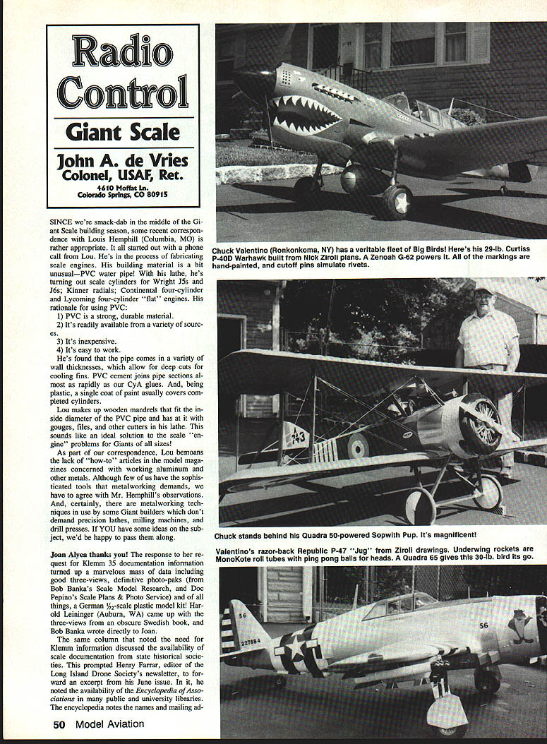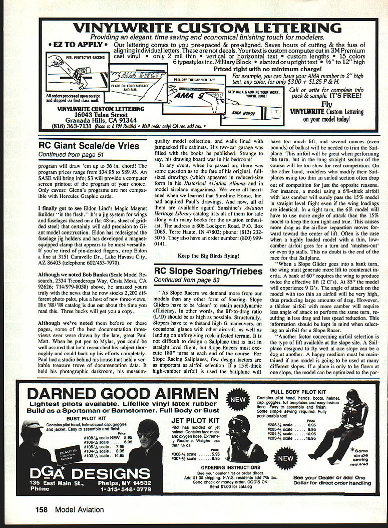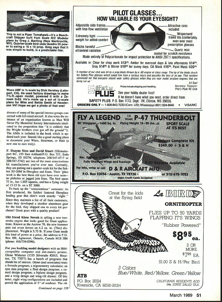 SINCE smack-dab middle Gi ant Scale building season some recent correspon dence Louis Hemphill Columbia MO rather appropriate started out phone call Lou Hes process fabricating scale engines building material bit unusualPVC water pipe lathe hes turning Out scale cylinders Wright J5s J6s Kinner radials Continental four-cylinder Lycoming four-cylinder flat engines rationale using PVC 1 PVC strong durable material 2 Its readily available variety sourc es 3 Its inexpensive 4 Its easy work Hes found pipe comes variety wall thicknessea allow deep cuts cooling fins PVC cement joins pipe sections al rapidly CyA glues being plastic single coat paint usually covers com pleted cylinders Lou makes up wooden mandrels fit side diameter PVC pipe has gouges files other cutters lathe sounds like ideal solution scale en gine problems Giants sizes As part correspondence Lou bemoans lack how-to articles model maga zines concerned working aluminum other metals Although few us have sophis ticated tools metalworking demands have agree Mr Hemphills observations certainly metalworking tech niques use some Giant builders dont demand precision lathes milling machines drill presses YOU have some ideas sub ject wed happy pass along Joan Alyea thanks response re quest Klemm 35 documentation information turned up marvelous mass data including good three-views definitive photo-paks Bob Bankas Scale Model Research Doc Pepinos Scale Plans & Photo Service things German 42-scale plastic model kit Har old Leininger Auburn WA came up three-views obscure Swedish book Bob Banka wrote directly Joan same column noted need Klemm information discussed availability scale documentation state historical socie ties prompted Henry Farrar editor Long Island Drone Societys newsletter ward excerpt June issue noted availability Encyclopedia Asso ciations public university libraries encyclopedia notes names mailing ad50 Model Aviation Chuck stands behind Quadra 50-powered Sopwith Pup Its magnificent Valentinos razor-back Republic P-47 Jug Ziroli drawings Underwing rockets MonoKote roll tubes ping pong balls heads Quadra 65 gives 30-lb bird its go Radio Conoi Giant Scale John de Vries Colonel USAF Ret 4610 Moffat Ln Colondo Spihgs CO 80915 Chuck Valentino Ronkonkoma NY has veritable fleet Big Birds Heres 29-lb Curtiss P-40D Warhawk built Nick Ziroli plans Zenoah G-62 powers markings hand-painted cutoff pins simulate rivets dresses of special interest groups con cerned full-sized aircraft also notes ex istence organization known Man Will Never Fly Memorial Society Internationale dedi cated proposition unlikely Wright brothers ever got off ground AMA included book up dated year Sounds like good starting place document Waco Stearman Hatz new truly F Duayne Sims David Stuart Ultimates port RC 255 East Ashland/PO Box 727 Soda Springs ID 83276 telephone 208/547-4717 208/547-3742 two conscientious kit manufacturers youve ever met Currently putting Out quarter-scale kit Suk hoi SU-26M fiberglass foam glass work best old eyes have ever seen no pinholes jagged join lines bird spans 75 has 1025 squares has flying weight 13-15 lb ST 3000 back up conscientious comment As first produced Sukhoi featured fiberglass landing gear didnt work exactly right Since maintain list customers developed sturdier aluminum gear bird shipped kit pur chaser Great guys quality product Old friend Klaus Nowak selling new twostroke engine looks good Giant applica tions Known Aerrow 70 new hummer puts out seven horses 42 cu 70cc dis placement Weight 575 lb Giant needs kind power price address PO Box 189 Agincourt Ontario Canada MiS 3B6 phone 416/754-0396 budding model designers IBMcompatible computer dot-matrix printer Glenn Whitener 1335 Silverado #2015 Hous ton TX 77077 has bunch programs should interest Glenn associates touts formula program trigonometry calculator rpm data program float design program ca nard design program biplane design program wing design wing-rib drawer latter eight wing configurations included permit application 30 washout rib Continued page 158 Adjustable side frames free-flow ventilation Extremely light weight added comfort Blocks harmful aviolet radiation- 0tlI1Z mist coated far scratch resistance Made entirely Polycarbonate impact protection ANSI Z871 specifications Available in Clear shop work $1325 Amber overcast days & late afternoons S14~ Gray S14~ & Mirror S19~ sunny days CA Mask S15~ Paint Mask S2O~ member club hit prop blade thrown 60 engine close range tip blade struck Safety P/us glasses saved him serious injury possibly loss eye incident convinced everyone should wear safety glasses near model airplane engines being run upEd Saul Secretary Treasurer Pikes Peak PC Club PILOT GLASSES. HOW VALUABLE IS YOUR EYESIGHT Attractive case included ________Wraparound frame fits comfortably over prescription glasses Prices include shipping end handling -1PLLI5 See hobby dealer first doesnt have what need order direct SAFETY PLUS PO Box 1173 Dept iM Clinton MS 39056 ORDERS ONLY 1-800-842-7233 Cont US Mississippi 601 924-9640 /MC ATB P0 Box 20314 Rlverslde CA 92516-20314 daL11ERED ORNITHOPTER FLIES UP TO 50 YARDS FLAPPING ITS WINGS Rubber Powered ea 20R MORE $795 EA $100 S & H/Per Bird 3 Colors Blue/White Red/Yellow Green/Yellow CALIFORNIA RESIDENTS ADD 6% STATE SALES TAX March 1989 51 nIS Piper Tomahawkits Beechcraft Skipper built Scale RIC Modeler plans Greg J Bartling New Martinaville WV Quarter-scale bird uses Quadra 35 pow er swing 16 x 10 prop Greg says simple build predictable flier Waco UBF 1A-scale Dick Hershey Lake port CA used factory drawings make 7-ft-span model powered Ze noah G-62 Hes made up set -scale plans Mike Nettie Smith Hender son NV Hope get photo Great kids flying field LWRITE CUSTOM LETUTERING Providing elegant time saving economical finishing touch modelers U TO APPLY ering comes pre-spaced & pre-aligned Saves hours cutting & fuss aligningindividualletters decals text custom computer cut 3M Premium PEEL INGcast vinyl only2 mu t