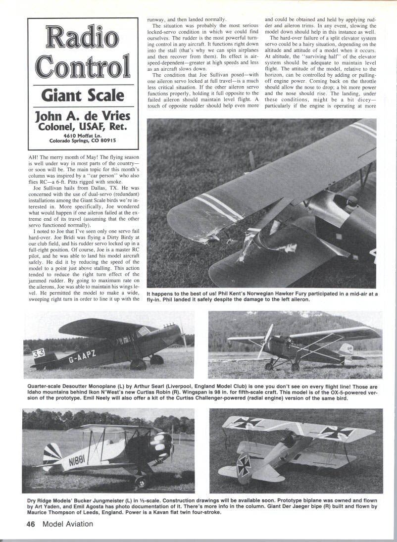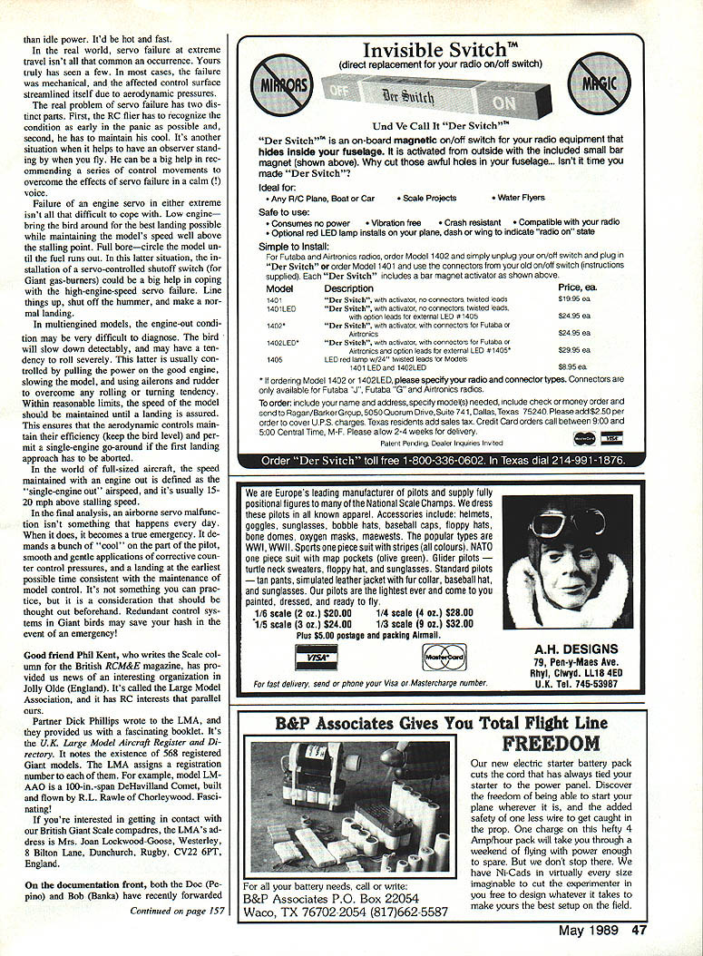 AH merry month May flying season well under way parts country soon will main topic months column inspired car person also flies RCa 6-ft PiUs rigged smoke Joe Sullivan hails Dallas TX concerned use dual-servo redundant installations among Giant Scale birds terested specifically Joe wondered what would happen aileron failed ex treme end its travel assuming other servo functioned normally noted Joe Ive seen servo fail hard-over Joe Bridi flying Dirty Birdy club field rudder servo locked up full-right position course Joe master RC pilot able land model aircraft safely did reducing speed model point just above stalling action tended reduce right turn effect jammed rudder going maximum rate ailerons Joe able maintain wings le vel permitted model make wide sweeping right turn order line up runway landed normally situation probably serious locked-servo condition could find ourselves rudder powerful turn ing control aircraft functions right down stall thats can spin airplanes recover Its effect air speed-dependentgreater high speeds less aircraft slows down condition Joe Sullivan posedwith aileron servo locked full travelis much less critical situation other aileron servo functions properly holding full opposite failed aileron should maintain level flight touch opposite rudder should help could obtained held applying rud der aileron trims event slowing model down should help instance well hard-over failure split elevator system servo could hairy situation depending altitude attitude model occurs altitude surviving half elevator system should adequate maintain level flight attitude model relative horizon can controlled adding pullingoff engine power Coming back throttle should allow nose drop bit power nose should rise landing under conditions might bit dicey particularly engine operating 46 Model Aviation Radio Control Giant Scale John de Vries Colonel USAF Ret 4610 Moffat Ln Colorado Springs CO 80915 happens best us Phil Kents Norwegian Hawker Fury participated mid-air fly-in Phil landed safely despite damage left aileron Quarter-scale Desoutter Monoplane L Arthur Sean Liverpool England Model Club dont see flight line Idaho mountains behind Ikon NWssts new Curtiss Robin R Wingspan 1s98 fifth-scale craft model OX-5-powered ver sion prototype Emil Neely will also offer kit Curtiss Challenger-powered radial engine version same bird Dry Ridge Models Bucker Jungmelster L -scale Construction drawings will available soon Prototype biplane owned flown Art Yaden Emil Agosta has photo documentation Theres info column Giant Der Jaeger bipe R built flown Maurice Thompson Leeds England Power Kavan flat twin four-stroke idle power Itd hot fast real world servo failure extreme travel isnt common occurrence Yours truly has seen few cases failure mechanical affected control surface streamlined itself due aerodynamic pressures real problem servo failure has two dis tinct parts First RC flier has recognize condition early panic possible second has maintain cool Its another situation helps have observer stand ing fly can big help rec ommending series control movements overcome effects servo failure calm voice Failure engine servo either extreme isnt difficult cope Low engine bring bird around best landing possible maintaining models speed well above stalling point Full borecircle model un til fuel runs Out latter situation stallation servo-controlled shutoff switch Giant gas-burners could big help coping high-engine-speed servo failure Line things up shut off hummer make nor mal landing multiengined models engine-out condi tion may very difficult diagnose bird will slow down detectably may have ten dency roll severely latter usually con trolled pulling power good engine slowing model using ailerons rudder overcome rolling turning tendency Within reasonable limits speed model should maintained until landing assured ensures aerodynamic controls main tain efficiency keep bird level per mit single-engine go-around first landing approach has aborted world full-sized alrcraft speed maintained engine out defined single-engine out airspeed its usually 1520 mph above stalling speed final analysis airborne servo malfunc tion isnt something happens day does becomes true emergency de mands bunch cool part pilot smooth gentle applications corrective coun ter control pressures landing earliest possible time consistent maintenance model control Its something can prac tice consideration should thought out beforehand Redundant control sys tems Giant birds may save hash event emergency Good friend Phil Kent writes Scale col umn British RCM&E magazine has pro vided us news interesting organization Jolly Olde England Its called Large Model Association has RC interests parallel Partner Dick Phillips wrote LMA provided us fascinating booklet Its UK Large Model Aircraft Register Di rectory notes existence 568 registered Giant models LMA assigns registration number example model LM AAO 100-in-span DeHavilland Comet built flown RL Rawle Chorleywood Fasci nating youre interested getting contact British Giant Scale compadres LMAs ad dress Mrs Joan Lockwood-Goose Westerley 8 Bilton Lane Dunchurch Rugby CV22 6PT England docinnentation front both Doc Pe pino Bob Banka have recently forwarded Continued page 1S7 battery needs call write B&P Associates PO Box 22054 Waco TX 76702-2054 817662-5587 new electric starter battery pack cuts cord has always tied starter power panel Discover freedom being able start plane wherever added safety less wire get caught prop charge hefty 4 Amp/hour pack will take through weekend flying power enough spare dont stop have Ni-Cads virtually size imaginable cut experimenter free design whatever takes make yours best setup field May 1989 47 Invisible SvitchTM direct replacement radio on/off switch Und Ye Call Der Svitch" Der Svitch" on-board magnetic on/off switch radio equipment hides inside fuselage activated outside included small bar magnet shown above cut awful holes fuselage. Isnt time made Der Svitch Ideal Any