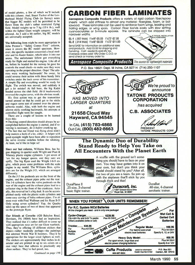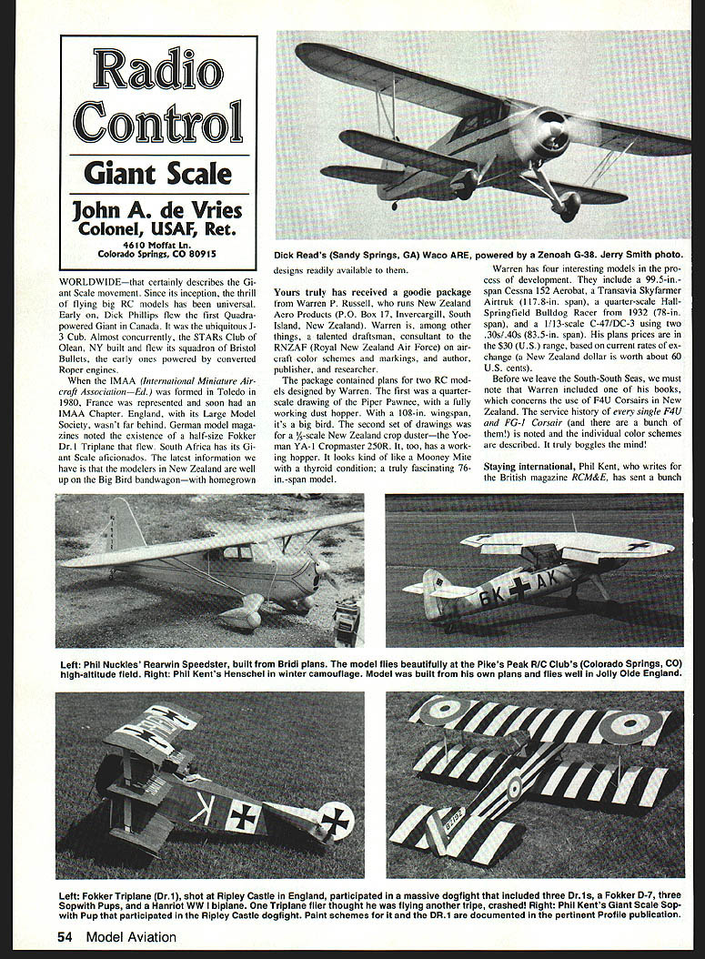 WORLDWIDEthat certainly describes Gi ant Scale movement Since its inception thrill flying big RC models has universal Early Dick Phillips flew first Quadrapowered Giant Canada ubiquitous J 3 Cub Almost concurrently STARs Club Olean NY built flew its squadron Bristol Bullets early ones powered converted Roper engines IMAA Itoernaional Miniature Air craft AssociationEd formed Toledo 1980 France represented soon IMAA Chapter England its Large Model Society wasnt far behind German model maga zines noted existence half-size Fokker Dr Triplane flew South Africa has its Gi ant Scale aficionados latest information have modelers New Zealand well up Big Bird bandwagonwith homegrown designs readily available Yours truly has received goodie package Warren P Russell runs New Zealand Aero Products PO Box 17 Invercargill South Island New Zealand Warren among other things talented draftsman consultant RNZAF Royal New Zealand Air Force air craft color schemes markings author publisher researcher package contained plans two RC mod els designed Warren first quarterscale drawing Piper Pawnee fully working dust hopper 108-in wingspan its big bird second set drawings -scale New Zealand crop dusterthe Yoe man YA-l Cropmaster 250R too has work ing hopper looks kind like Mooney Mite thyroid condition truly fascinating 76In-span model Warren has four interesting models pro cess development include 995-inspan Cessna 152 Acrobat Transavia Skyfarmer Airtruk 1178-in span quarter-scale HallSpringfield Bulldog Racer 1932 78-in span 1/13-scale C-47/DC-3 using two 30s/40s 835-in span plans prices $30 US range based current rates ex change New Zealand dollar worth about 60 US cents Before leave South-South Seas must note Warren included books concerns use F4U Corsairs New Zealand service history single F4U FG-J Corsair bunch noted individual color schemes described truly boggles mind Staying international Phil Kent writes British magazine RCM&E has sent bunch 54 Model Aviation Radio Control Giant Scale John de Vries Colonel USAF Ret 4610 Moffat Ln Colorado Springs CO 80915 Dick Reads Sandy Springs GA Waco ARE powered Zenoah G-38 Jerry Smith photo Left Phil Nuckles Rearwin Speedster built Bridi plans model flies beautifully Pikes Peak RIC Clubs Colorado Springs CO high-altitude field Right Phil Kents Henschel winter camouflage Model built own plans flies well Jolly Olde England Left Fokker Triplane Dr1 shot Ripley Castle England participated massive dogfight included three Drls Fokker D-7 three Sopwith Pups Hanriot WW biplane Triplane flier thought flying another tripe crashedl Right Phil Kents Giant Scale Sopwith Pup participated Ripley Castle dogfight Paint schemes DR1 documented pertinent Profile publication model photos few well include column Stuart Tucker Lea therhead Model Flying Club Surrey notes bigger RC models will permitted flown clubs rather restricted flying field Model weights up 7 kg 15 lb well within lighter Giant weight category will allowed As said bit earlier big RC models universally accepted following item might appropriate John Prestons Safety Comes First column since covers RC model spectrum ever specific incident concerned local mod eler Kadet Senior takes arena unfortunate fellow got everything ready flight started engine Like us before headed runway gave controls usual checkto make sure operating proper direction Oops aile rons working backwards No sweat could reverse action handy little switches under back cover transmitter simple flip everything would ready flight switch moved suddenly got lot noisier full bore big Kadet headed across club field d inadvertently reversed engine servo obvious result first action get transmitter turned around could get sticks regain some sort control over almostairborne model Alas both engine aileron sticks working backwards attempts controlled flight naught couple lessons learned Checking control direction should always ac complished before engine started re versing necessary before cranking up fact friend flying alone didnt help matters heck lot either helper good eyesight might have able reposition servo reverse switches before rekitting least wed like hope Since last column Williams Bros has gun shipping its quarter-scale Wright Pratt & Whitney plastic engine cylinders got seven em hangar queen sure spiffy big Ryan used Wright J-6-9 en gine poses some problems scale engine model Williams Bros cylin ders Wright J-5 arranged differently J-5 pushrods front engine exhaust pipes poke out rear J-6 cylinders have valve pushrods rear engine exhaust pipes lead collector ring front crankcase Actu ally reversal isnt big deal can accom plished easily plastic scale cylinders some easy carving balsa exhaust pipes Im al Fred Wallman Ryan B-5 Only using seven cylinders Yep Quadra takes up space two appeared prototype Ryan friends Coverite 420 Babylon Road Horsham PA 19044 have inspiration realized its rather difficult come up appropriate nose art Giant warbirds Thus theyre offering 15 different stickers depictrather modestly perhapsthe paintings adorned World War II bombers Theyd appropriate larger sized fighters well stickers approximately four inches di ameter printed up six colors cast vinyl base adheres practically clean surface Theyre fuel-proof too Continued page 146 h CARBON FIBER LAMINATES Aerospace Composite Products offers variety rigid carbon fiber/epoxy sheets add stiffness almost material- fiberglass foam bal sawood laminates can used reinforce foam wings leading trailing edges wing spars Carbon Fiber bonds easily slow setting cyanoacrylates 5-minute epoxies laminate can stripped nto narrower widths TYPICAL IN5TAL[ATION CL-i 007 thick 1x48-$500 1x72-$700 CL-2 014 thick 1x48-$800 1x72-$1100 Send SASE information additional sizes producfs Add $300 shipping handling Calif residents add 6% fax Overseas orders add 15%-Order COD send check money order source lightweight materials 2 PO Box 16621 Dept M Irvine CA 92714 714 250-1107 HAS MOVED INTO LARGER QUARTERS 21658 Cl