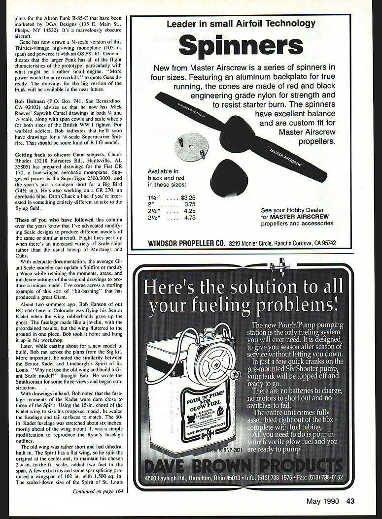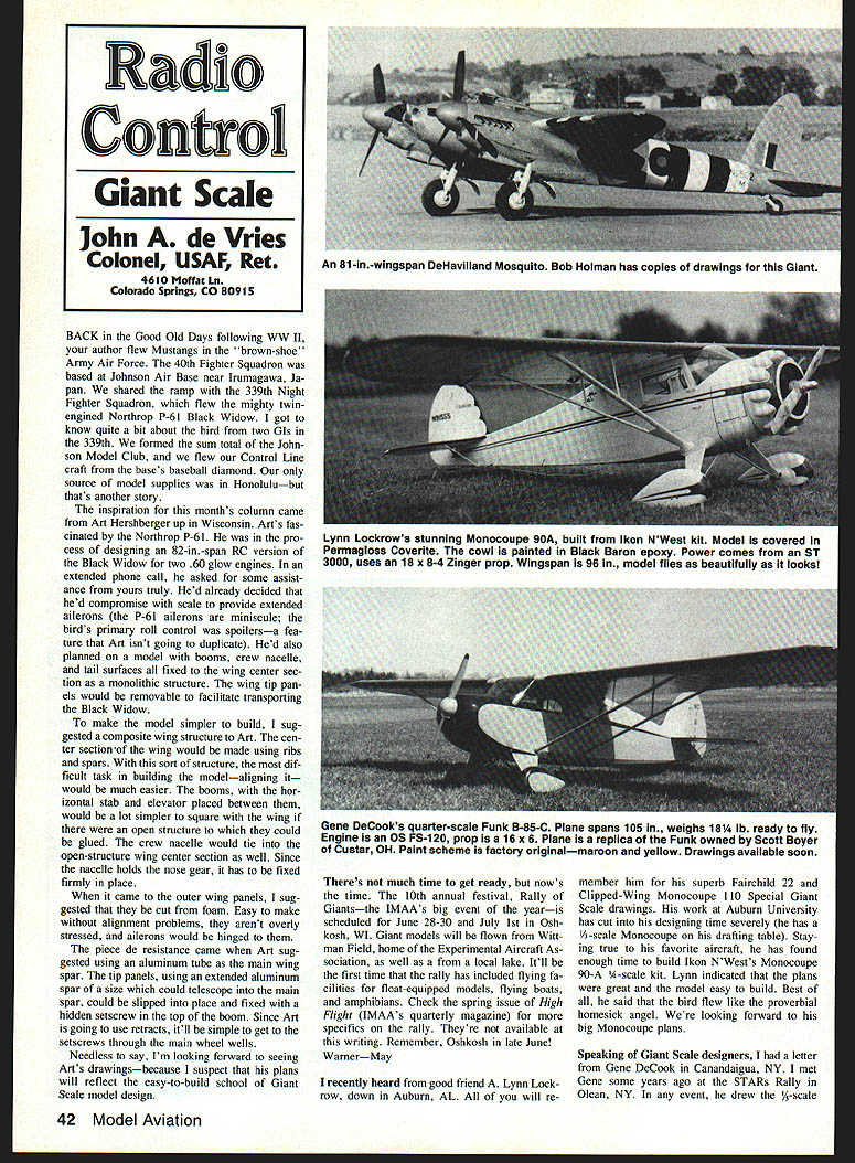 BACK Good Old Days following WW II author flew Mustangs brown-shoe Army Air Force 40th Fighter Squadron based Johnson Air Base near Irumagawa Ja pan shared ramp 339th Night Fighter Squadron flew mighty twinengined Northrop P-61 Black Widow got know quite bit about bird two GIs 339th formed sum total John son Model Club flew Control Line craft bases baseball diamond source model supplies Honolulubut thats another story inspiration months column came Art Hershberger up Wisconsin Arts fas cinated Northrop P-6 pro cess designing 82-in-span RC version Black Widow two 60 glow engines extended phone call asked some assist ance yours truly Hed already decided hed compromise scale provide extended ailerons P-61 ailerons miniscule birds primary roll control spoilersa fea ture Art isnt going duplicate Hed also planned model booms crew nacelle tail surfaces fixed wing center sec tion monolithic structure wing tip pan els would removable facilitate transporting Black Widow make model simpler build sug gested composite wing structure Art cen ter section-of wing would made using ribs spars sort structure dif ficult task building modelaligning would much easier booms hor izontal stab elevator placed between would lot simpler square wing open structure could glued crew nacelle would tie open-structure wing center section well Since nacelle holds nose gear has fixed firmly place came Outer wing panels sug gested cut foam Easy make alignment problems arent overly stressed ailerons would hinged piece de resistance came Art sug gested using aluminum tube main wing spar tip panels using extended aluminum spar size could telescope main spar could slipped place fixed hidden setscrew top boom Since Art going use retracts itll simple get setscrews through main wheel wells Needless say Im looking forward seeing Arts drawingsbecause suspect plans will reflect easy-to-build school Giant Scale model design 42 Model Aviation Theres much time get ready nows time 10th annual festival Rally Giantsthe IMAAs big event yearis scheduled June 28-30 July 1st Osh kosh WI Giant models will flown Witt man Field home Experimental Aircraft As sociation well local lake Itll first time rally has included flying fa cilities float-equipped models flying boats amphibians Check spring issue High Flight IMAAs quarterly magazine specifics rally Theyre available writing Remember Oshkosh late June WarnerMay member him superb Fairchild 22 Clipped-Wing Monocoupe 110 Special Giant Scale drawings work Auburn University has cut designing time severely has A-scale Monocoupe drafting table Stay ing true favorite aircraft has found enough time build Ikon NWests Monocoupe 90-A A-scale kit Lynn indicated plans great model easy build Best said bird flew like proverbial homesick angel looking forward big Monocoupe plans Radio Control Giant Scale John de Vries Colonel USAF Ret 4610 Moffat Ln Colorado Springs CO 80915 An 81-in-wingspan DeHavilland Mosquito Bob Holman has copies drawings Giant Lynn Lockrows stunning Monocoupe 90A built Ikon NWest kit Model covered Permagloss Coverite cowl painted Black Baron epoxy Power comes ST 3000 uses 18 x 8-4 Zinger prop Wingspan 96 model flies beautifully looks Gene DeCooks quarter-scale Funk B-85-C Plane spans 105 weighs 181/4 lb ready fly Engine OS FS-1 20 prop 16 x 6 Plane replica Funk owned Scott Boyer Custar OH Paint scheme factory originalmaroon yellow Drawings available soon recently heard good friend Lynn Lockrow down Auburn AL will re Speaking Giant Scale designers letter Gene DeCook Canandaigua NY met Gene some years ago STARs Rally Glean NY event drew -scale plans Akron Funk B-85-C have marketed DGA Designs 135 E Main St Phelps NY 14532 Its marvelously obscure aircraft Gene has now drawn A-scale version Thirties-vintage high-wing monoplane 105-in span powered OS FS-61 Gene dicates larger Funk has flight characteristics prototype particularly what might rather small engine power would pure overkill quote Gene di rectly drawings big version Funk will available near future Bob Holman PO Box 741 San Bernardino CA 92402 advises us now has Mick Reeves Sopwith Camel drawings both Y3 scale along spun cowls scale wheels both sizes British WW fighter warbird addicts Bob indicates hell soon have drawings A-scale Supermarine Spit fire should some kind B-I-G model Getting back obscure Giant subjects Chuck Rhodes 3218 Fairacres Rd Huntsville AL 35805 has prepared drawings Fiat CR 170 low-winged acrobatic monoplane Sug gested power SuperTigre 2500/3000 spans just smidgen short Big Bird 74 Hes also working CR 270 acrobatic bipe Drop Chuck line youre inter ested something entirely different take flying field have followed column over years know Ive advocated modify ing Scale designs produce different models same similar aircraft Flight lines perk up theres increased variety Scale ships rather usual lineup Mustangs Cubs adequate documentation average Gi ant Scale modeler can update Spitfire modify Waco retaining moments areas incidence settings original drawings pro duce unique model Ive come across sterling example sort kit-bashing has produced great Giant About two summers ago Bob Hanson RC club Colorado flying Senior Kadet wing rubberbands gave up ghost fuselage made like javelin preordained results wing fluttered ground piece Bob took home hung up workshop Later casting about new model build Bob ran across plans Sig kit important noted similarity between Senior Kadet Lindberghs Spirit St Louis use old wing build Gi ant Scale model thought Bob wrote Smithsonian some three-views began con struction drawings hand Bob noted fuse lage moments Kadet darn close Spirit Using 15-in chord Kadet wing size proposed model scaled fuselage tail surfaces match 60in Kadet fuselage stretched about six inches mostly ahead wing mount simple modification reproduce Ryans fuselage outlines old wing rather short dihedral built Spirit has flat wing split original center maintain chosen 2A-in-to-the-ft scale added two feet span few extra ribs so