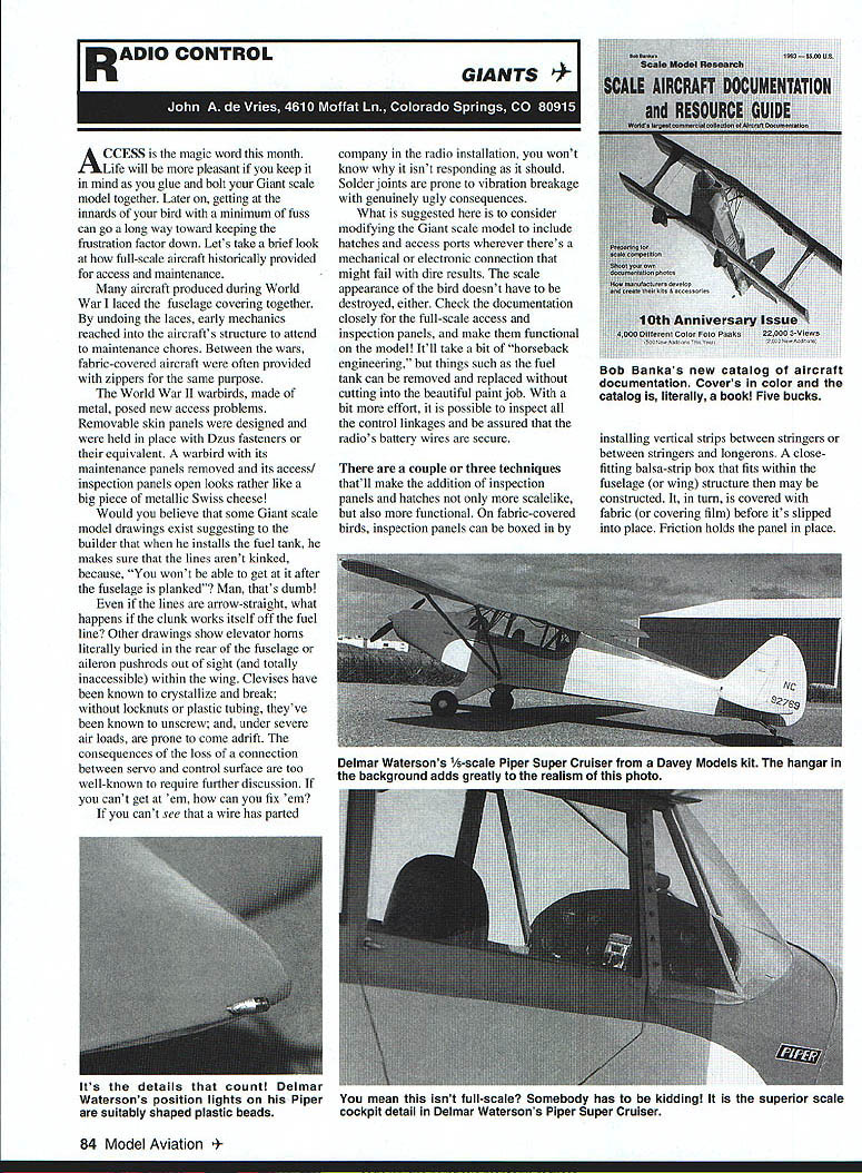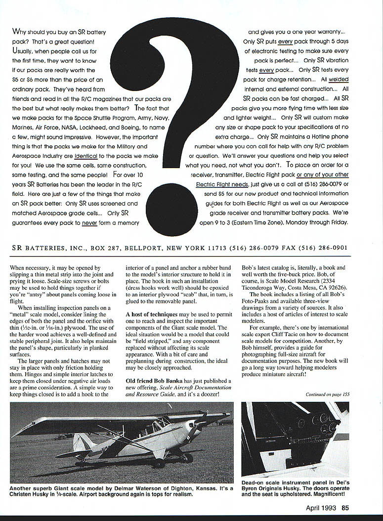 A CCESSis magic word month Life will pleasant keep mind glue bolt Giant scale model together Later getting innards bird minimum fuss can go long way toward keeping frustration factor down Lets take brief look full-scale aircraft historically provided access maintenance aircraft produced during World War laced fuselage covering together undoing laces early mechanics reached aircrafts structure attend maintenance chores Between wars fabric-covered aircraft often provided zippers same purpose World War II warbirds made metal posed new access problems Removable skin panels designed held place Dzus fasteners equivalent warbird its maintenance panels removed its access inspection panels open looks rather like big piece metallic Swiss cheese Would believe some Giant scale model drawings exist suggesting builder installs fuel tank makes sure lines arent kinked because wont able get after fuselage planked Man thats dumb lines arrow-straight what happens clunk works itself off fuel line Other drawings show elevator horns literally buried rear fuselage aileron pushrods out sight totally inaccessible within wing Clevises have known crystallize break locknuts plastic tubing theyve known unscrew under severe air loads prone come adrift consequences loss connection between servo control surface too well-known require further discussion cant get em can fix em cant see wire has parted company radio installation wont know isnt responding should Solder joints prone vibration breakage genuinely ugly consequences What suggested consider modifying Giant scale model include hatches access ports wherever theres mechanical electronic connection might fail dire results scale appearance bird doesnt have destroyed either Check documentation closely full-scale access inspection panels make functional model Itll take bit horseback engineering things such fuel tank can removed replaced cutting beautiful paint job bit effort possible inspect control linkages assured radios battery wires secure couple three techniques thatll make addition inspection panels hatches scalelike also functional fabric-covered birds inspection panels can boxed installing vertical strips between stringers between stringers longerons close fitting balsa-strip box fits within fuselage wing structure may constructed turn covered fabric covering film before its slipped place Friction holds panel place 84 Model Aviation HO CONTROL GIANTS 1 op 1nniver5 Uoor Foto R Bob Bankas new catalog aircraft documentation Covers color catalog literally book Five bucks Delmar Watersons 1A-scale Piper Super Cruiser Davey Models kit hangar backaround adds areatly realism Dhoto Its details count Delmar Watersons position lights Piper mean isnt full-scale Somebody has kidding superior scale suitably shaped plastic beads cockpit detail Delmar Watersons Piper Super Cruiser should buy SR ban ery pack Thats great question Usually people call us first time want know packs really worth $5 S6 price ordinary pack Theyve heard friends read R/C magazines packs best what really makes better fact make packs Space Shuffle Program Army Navy Marines Air Force NASA Lockheed Boeing name few might sound impressive However important thing packs make Military Aerospace industry identical packs make use same cells same construction same testing same people over o years SR Batteries has leader R/ C field Just few tue things make SR pack better Only SR uses screened matched Aerospace grade cells. Only SR guarantees pack never form memory gives year warranty. Only SR puts pack through 5 days electronic testing make sure pack perfect. Only SR vibration tests pack. Only SR tests pack charge retention. welded internal external construction. SR packs can fast charged. SR packs give flying time less size lighter weight. Only SR will custom make size shape pack specifications no extra charge. Only SR maintains Hotline phone number can call help R/C problem question Well answer questions help select what need what dont place order receiver transmitter Electric Flight pack other Electric Flight needs Just give us call 516 286-0079 send $5 new product technical information guides both Electric Flight well Aerospace grade receiver transmitter battery packs open 9 3 Eastern Time Zone Monday through Friday SR BATTERIES INC BOX 287 BELLPORT NEW YORK 11713 516 286-0079 FAX 516 286-0901 necessary may opened slipping thin metal strip joint prying loose Scale-size screws bolts may used hold things together youre antsy about panels coming loose flight installing inspection panels metal scale model consider lining edges both panel orifice thin 1/32-in 1/16-in plywood use harder wood achieves well-defined stable peripheral joint also helps maintain panels shape particularly planked surfaces larger panels hatches may stay place friction holding Hinges simple interior latches keep closed under negative air loads prime consideration simple way keep things closed add hook interior panel anchor rubber band models interior structure hold place hook such installation dress hooks work well should epoxied interior plywood scab turn glued removable panel host techniques may used permit reach inspect important components Giant scale model ideal situation would model could field stripped component replaced affecting its scale appearance bit care preplanning during construction ideal may closely approached Bobs latest catalog literally book well worth five-buck price Bob course Scale Model Research 2334 Ticonderoga Way Costa Mesa CA 92626 book includes listing Bobs Foto-Paaks available three-view drawings variety sources also includes host articles interest scale modelers example theres international scale expert Cliff Tacie document scale models competition Another Bob himself provides guide photographing full-size aircraft documentation purposes new book will go long way toward helping modelers produce miniature aircraft April 1993 85 Old friend Bob Banka has just published new offering Scale Aircraft Documentation Resou