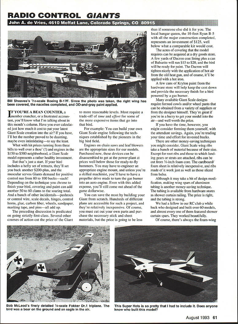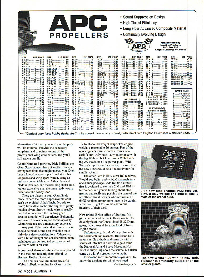 RADIO CONTROL GIANTS LFYO URE BEAN COUNTER umber cruncher frustrated accoun tant youll know what Im talking about months column Have ever calculat ed just much cost put latest Giant Scale creation air have Ill bet number proved daunting maybe intimidatingto say least What kit prices running three bills well over thou nes $150 $500 neighborhood Giant Scale model represents rather healthy investment thats just start bird includes hefty set retracts theyll set back another $200-plus muscular servos Giants demand positive control run SO 100 buckseach Depending technique choose finish bird covering paint can add another 50 60 clams soaring total bunch other incidentalspushrods control wire scale decals hinges control horns glue carbon fiber wheels sandpaper masking tape pinsall add up preceding discussion predicated going strictly first-class Several other courses action cut price Giant reasonable levels Most require trade-off time effort some expensive items go bird example can build own Giant Scale engine following tech niques established pioneers big bird field Engines chain saws leaf blowers appropriate sizes models Purchased new devices can disassembled get power plant prices well below ready-to-fly hummers may have engineer appropriate engine mount unless youre skilled machinist youll have have propeller drive made turn gas burner aero engine added expense 11 still come out ahead game dollarwise can save building Giant scratch Hundreds different plans accessible such project theyre relatively inexpensive course must cut out own parts pur chase necessary stick sheet materials price going less someone else did local hangar queen 10-foot Ryan B-S major construction completed represents investment $125 well below what comparable kit would cost acres covering model requires can acquired dry goods store few yards Dacron coat lining plus can Balsarite will run $15 $20 bird will ready paint Dacron will tighten nicely application hot air old heat gun course itll applied hot iron few cans Krylon paint hardware store will help keep cost down provide necessary finish bird powered gas burner available Giant Scale designs require formed cowls and/or wheel pants can obtained variety suppliers designer himself Theyre great youre hurry get model airand well worth price have time however might consider forming yourself attendant savings Again youre trading time effort invested bucks other money-saving techniques might consider Giant Scale wing ribs take bunch material because size Except root ribs land ing gears struts attached ribs can cut 1A-inch foam core cardboard foam sheet relatively inexpensive ribs made work just well sliced balsa Although may take bit design moth fication making wing spars aluminum tubing another money-saving technique tubing available hardware stores shower curtain railing price right tubing strong fellow RC club back designed built over 60 models almost featured shower curtain spars worked beautifully course theres always foam-wing August1993 61 Bill Sheavess 1/io-scale Boeing B-17F Since photo taken right wing has covered nacelles completed OD-and-gray paint applied Bob McLeods finely detailed -scale Fokker Dr1 triplane Super Hots pretty include Does anyone bird bear ground eagle air know built model SIZE USEPRICE 57X31159 6x21159 63 X4395 65X292395 65X372395 65X503395 65X553395 65X603395 65X653395 7x315159 7X415159 7X5159 7X6159 7X7159 7X8159 7X9159 7X10159 78X414395 78X66395 78X76395 8X73S395 8X414179 8X5179 8X6179 8X7179 8X8179 8X9179 8X10179 9X416199 9X516199 9X6199 9X7199 APC PROPELLERS SIZEUSE PRICE 9X8199 9X9199 9X10199 925 X 50 .. 4395 925X525 4395 925 X 55 .. 4395 925X575 4395 925 X 60 .. 4395 95 X 65N .. 5395 95 X 7ON .. 5395 95 X 7SN .. 5395 95 X BaN .. 5395 95 X BSN .. 5395 9X65 395 9X75 395 9X85 395 95 X45 29 10X3229 10x4229 10X5229 10X6229 10X7229 lOXO229 10X9229 1OX1O229 105X45 11395 11X3249 11X4249 11X5249 11X6249 11X7249 11X8249 SIZEUSE PRICE 11X9249 12X6289 12X7289 12X8289 lixia7795 liXil7795 11X127795 11X12W7795 11 X137795 11 X147795 115X48289 1225 X 375B349 12X97795 12X9W7795 12X107795 12X1OW7795 12X117795 12X11N7795 12X1157795 12X127795 12X1257795 12X12N7795 12X137795 12X13N7795 12X147795 125X97795 125X107795 125X117795 125X1157795 125X127795 125X1257795 125X137795 SIZEUSE PRICE 13X6425 13X7425 13X8425 13X97795 13X107795 13X117795 13X13N9795 13X135N.9795 135X971295 135X1071295 135X115N 71295 135 X 125 10. 1295 1355133 10 1295 135X135 101295 13SX 14 10 1295 135514W 10. 1295 14X5N1295 14561295 14581295 14X101295 14X121295 14X12N..10.1295 14513101295 14X13N101295 145135 101295 14X135N.10.1295 14X14101295 14X14N101295 1445105 101295 144 X 12 .. 10 . 1295 144 X 13 .. 10 . 1295 145 5 14N . 10 . 1295 Sound Suppression Design High Thrust Efficiency Long Fiber Advanced Composite Material Continually Evolving Design Manufactured Landing Product PO Box 938 Knights Landing CA 96645 SIZE USE PRICE 145 X 14SN 10. 1295 1550101295 15510101295 15511101295 15512101295 16581295 165101295 165121295 165141295 165161295 9X6PPusher 395 1056PPasber 395 1OX7P..Pasher 395 1OX8P..Puuher 395 11 X6P .. Pusher 395 11 X7P .. Pusher 395 145 OP .. Pusher 1295 MULTI-BLADE 2 Replaceable Blades 16582200 18X102200 18X12122200 185142200 18X162200 185182290 20X9122500 205102500 20X122500 205142500 205162500 20X182500 SIZEUSE PRICE 20 5 202500 21X122500 22X83100 22X10133100 22512133100 225143100 225163100 22X183100 22X203100 22X223100 245103800 24X123800 24x143800 24X163800 24X183800 24 5 203800 24 5 223800 2 Blade Hub 19 193000 2 Blade Hub 20- 21 3500 2 Blade Hub 22 . 4000 2 Blade Hub 24 . 6000 MULTI-BLADE 3 Replaceable Blades 17X103300 18X103300 195113300 20510133700 20512133700 205143700 21 5103700 215123700 SIZEUSE PRICE 225104500 225124500 225144500 225164500 245105500 245125500 245145500 245165500 3 Blade Hub 17-19 4500 3 Blade Hub 20-21 5500 3 Blade Hub 226500 3 Blade Hub 240000 CUeRENTUBABEB 1049 Free Flieht 2iSCumbaC 310-laPyler 425 Pylon a40 Pylon S35 Combat 7ee Pattern aCL Stunt 9121