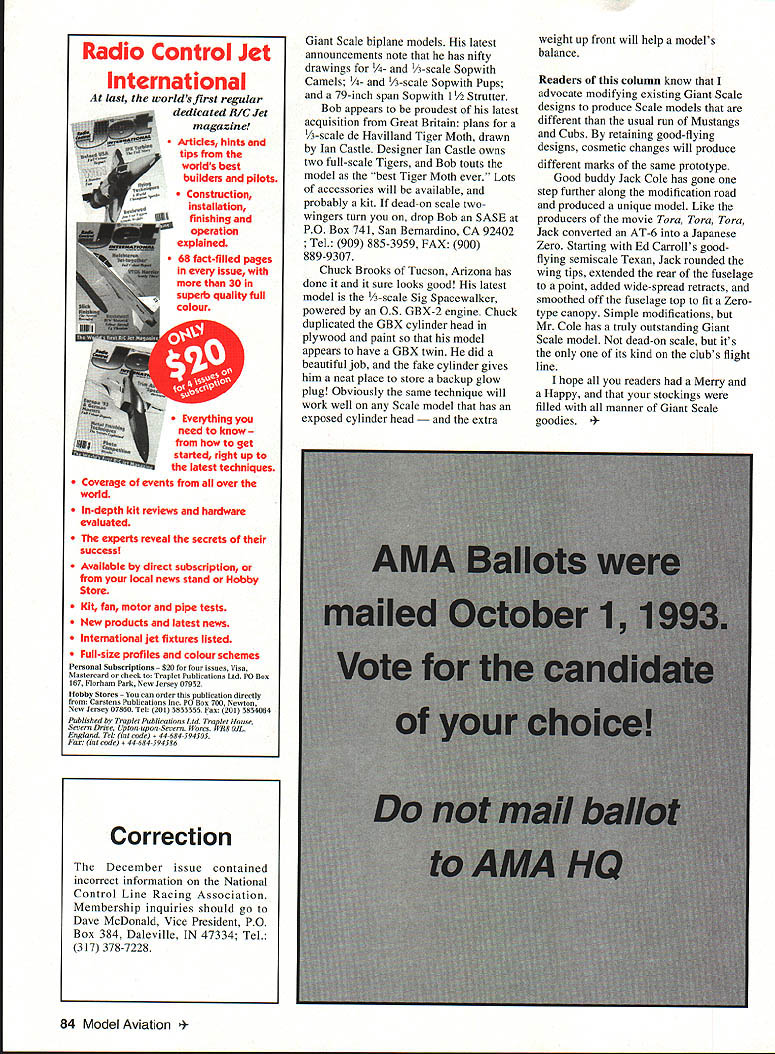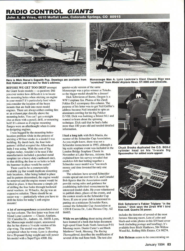 RADIO CONTROL GIANTS K 161111 BEFORE WE GET TOO DEEP amongst Giant Scale models tion Did ever notice difficult locate mounting holes sticking engine model Its particularly hard consider location beam mounts built model engines always either cooling fins exhaust pipe directly above mounting holes cant get straight shot pencil drill mounting bolt Its almost engine mounting flanges afterthought came designing engines bugged mounting-holeslocation problem process sticking 90 four-stroke model building dumb luck four-hole pattern drilled accepted Allen-head bolts using cost big engines today wouldnt neat manufacturers included punched metal template heavy-duty cardboard drilling four holes bolt hummer place would easier used commercially available jig would duplicate mounting hole locations After being bolted place its pattern determined engine would removed engine mount would bolted place became simple job drilling four holes through hardened metal washers 30 bucks jig expensive solution should easier way icularly have drill holes todays soft engine mounts lot correspondence accumulated since last column first letter old friend Lynn Lockrow Classic Airplans 321 Camellia Dr Auburn AL 36830 Lynn Monocoupe model expert announced has drawn /3-scale version clip-wing model about 70% completed wrote Lynn shooting 20-pound flying weight will power model SuperTigre 4500 quarter-scale version same Monocoupe prize-winner Toledo bigger model should doozer Dick Scbwieren Burns Oregon WW airplane fan Photos Ziroli Fokker DrI accompany column purpose letter get Neil Griffins address because Neil intended spin aluminum cowling big Fokker DVIII Dick building Bristol Ml wanted learn about spinning technique Dick said lathe 100 years old needed detailed information long talk Bob Martin mentor Schneider Cup Association As might know Schneider reenactment 1993 although big scale seaplane event included London Bridge Seaplane Classic November Lake Havasu Arizona Bob explained survey revealed modelers felt bolting together Schneider racer model too much money time invested event solution have several Schneider events spread out over US Canada Bob figures Association could provide racing rules guidance establishing individual reenactments interested model clubs volunteered publish dates places events contest results Schneider Cup News club interested putting miniature Schneider Race contact Schneider Cup Association 1520 B Corona Dr Lake Havasu City AZ 86403 talking about racing aircraft have learned book helps document high-speed Giant Scale North American P-5 1 Mustang racers Dustin Carters Birch Matthews book Mustang Racing Thoroughbred describes modification several real Reno birds text also includes histories several famous Mustang racers Lots color black-and-white photos $39 hard cover book including postage handling Its available Birch Matthews 584 Willow Wood Rd Rolling Hills Estates CA 90274 Bob Holman seems concentrating January1994 83 Mick Reeves Sopwith Pup Drawings available Bob Holman see text Bobs address Monocoupe Man Lynn Lockrows Giant Classic Bipe scratched Model Airplane News ST-3000 UltraCote Chuck Brooks duplicated OS BGX-2 cylinder head 1/3-scale Sig Spacewalker added scale appeal Dick Schwierens Fokker Triplane bones Dick says Ziroli WW bird flies well Quadra 35 power Radio Control Jet In-depth kit reviews hardware evaluated experts reveal secrets success Available direct subscription local news stand Hobby Store Kit fan motor pipe tests New products latest news International jet fixtures listed Full-size profiles colour schemes Personal Subscriptions four issues Visa Mastercard check Traplet Publications Ltd P0 Box 167 Florham Park New Jersey 07932 Hobby Stores order publication directly Carstens Publications Inc P0 Box 700 Newton New Jersey 07860 Tel 201 3833355 Fax 201 3834064 Published Tcaplet Publications Ltd Traplet House Sccero Dricc Upton upon-Sececn Wocco 99718 OJE England Tel inc code 44 684-594505 Fnr mt code 84-5 94586 Giant Scale biplane models latest announcements note has nifty drawings l/4 A-scale Sopwith Camels 1/3-scale Sopwith Pups 79-inch span Sopwith 1 1/7 Strutter Bob appears proudest latest acquisition Great Britain plans /3-scale de Havilland Tiger Moth drawn Jan Castle Designer Ian Castle owns two full-scale Tigers Bob touts model best Tiger Moth ever Lots accessories will available probably kit dead-on scale two wingers turn drop Bob SASE PO Box 741 San Bernardino CA 92402 Tel 909 885-3959 FAX 900 889-9307 Chuck Brooks Tucson Arizona has done it sure looks good latest model 1A-scale Sig Spacewalker powered OS GBX-2 engine Chuck duplicated GBX cylinder head plywood paint model appears have GBX twin did beautiful job fake cylinder gives him neat place store backup glow plug Obviously same technique will work well Scale model has exposed cylinder head a weight up front will help models balance Readers column know advocate modifying existing Giant Scale designs produce Scale models different usual run Mustangs Cubs retaining good-flying designs cosmetic changes will produce different marks same prototype Good buddy Jack Cole has gone step further along modification road produced unique model Like producers movie Tora Tora Tora Jack converted AT-6 Japanese Zero Starting Ed Carrolls goodflying semiscale Texan Jack rounded wing tips extended rear fuselage point added wide-spread retracts smoothed off fuselage top fit Zerotype canopy Simple modifications Mr Cole has truly outstanding Giant Scale model dead-on scale its its kind clubs flight line hope readers Merry Happy stockings filled manner Giant Scale goodies odel Aviation rnational last worlds first regular dedicated RIC Jet magazine Articles hints tips worlds best builders pilots Everything need know get started right up latest techniques Coverage events over world Correction December issue contained incorrect information National Control Line Racing Association Membership inquiries should go Dave McDonald Vice Presi