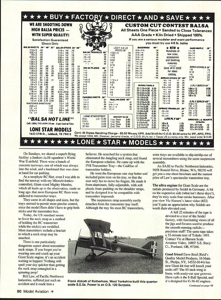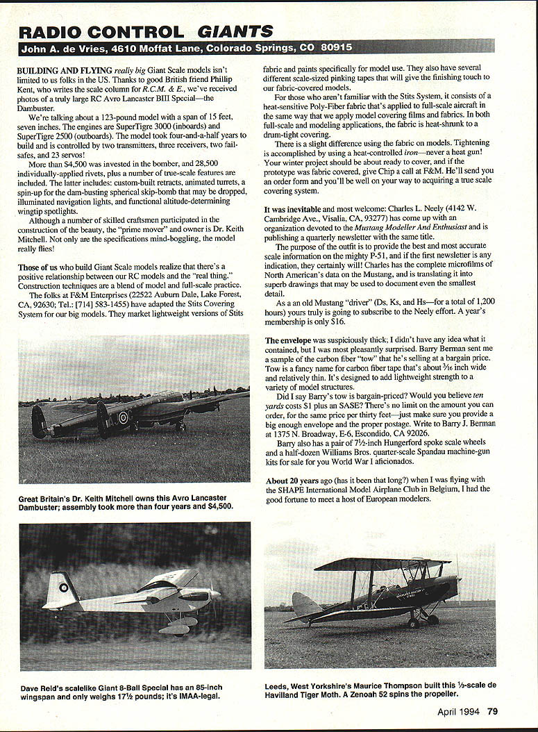 RADIO CONTROL GIANTS BUILDING AND FLYING really big Giant Scale models isnt limited us folks US Thanks good British friend Phillip Kent writes scale column RCM & E weve received photos truly large RC Avro Lancaster Bill Specialthe Dambuster talking about 123-pound model span 15 feet seven inches engines SuperTigre 3000 inboards SuperTigre 2500 outboards model took four-and-a-half years build controlled two transmitters three receivers two failsafes 23 servos $4500 invested bomber 28500 individually-applied rivets plus number true-scale features included latter includes custom-built retracts animated turrets spin-up dam-busting spherical skip-bomb may dropped illuminated navigation lights functional altitude-determining wingtip spotlights Although number skilled craftsmen participated construction beauty prime mover owner Dr Keith Mitchell oaly specifications mind-boggling model really flies us build Giant Scale models realize theres positive relationship between ourRC models real thing Construction techniques blend model full-scale practice folks F&M Enterprises 22522 Auburn Dale Lake Forest CA 92630 Tel [714] 583-1455 have adapted Stits Covering System big models market lightweight versions Stits fabric paints specifically model use also have several different scale-sized pinking tapes will give finishing touch fabric-covered models arent familiar Stits System consists heat-sensitive Poly-Fiber fabric thats applied full-scale aircraft same way apply model covering films fabrics both full-scale modeling applications fabric heat-shrunk drum-tight covering slight difference using fabric models Tightening accomplished using heat-controlled ironnever heat gun winter project should about ready cover prototype fabric covered give Chip call F&M Hell send order form youll well way acquiring true scale covering system inevitable welcome Charles L Neely 4142W Cambridge Ave Visalia CA 93277 has come up organization devoted Mustang Modeller Enthusiast publishing quarterly newsletter same title purpose outfit provide best accurate scale information mighty P-Si first newsletter indication certainly will Charles has complete microfilms North Americans data Mustang translating superb drawings may used document smallest detail As old Mustang driver Ds Ks Hsfor total 1200 hours yours truly going subscribe Neely effort years membership $16 envelope suspiciously thick didnt have idea what contained pleasantly surprised Bariy Berman sent sample carbon fiber tow hes selling bargain price Tow fancy name carbon fiber tape thats about /16 inch wide relatively thin Its designed add lightweight strength variety model structures Did say Barrys tow bargain-priced Would believe ten yards costs $1 plus SASE Theres no limit amount can order same price per thirty feetjust make sure provide big enough envelope proper postage Write Barry J Berman 1375 N Broadway E-6 Escondido CA 92026 Barry also has pair 7-inch Hungerford spoke scale wheels half-dozen Williams Bros quarter-scale Spandau machine-gun kits sale World War aficionados About 20 years ago has long flying SHAPE International Model Airplane Club Belgium good fortune meet host European modelers April 1994 79 Great Britains Dr Keith Mitchell owns Avro Lancaster Dambuster assembly took four years $4500 Dave Reids scalelike Giant 8-Ball Special has 85-inchLeeds West Yorkshires Maurice Thompson built -scale de wingspan weighs 17 pounds its IMAA-legalHavilland Tiger Moth Zenoah 52 spins propeller jij5 11w LW] 51 WE ARE SHOOTING DOWN NIGH BALSA PRICES WITH SUPER QUALITY Satisfaction Guaranteed Direct Only BALM SHEETS 38 48 30 *MSA STICKS 3645 1/162331/16x1/410 3/322401/16x3/811 l/8x2431/16s1/215 3/182493/32s1/412 1/42583/32x3/813 1/32s3373/32x1/217 1/203371/8x1/809 1/16s33749 311/8x1/412 3/32x34458 371/8x3/813 1/8x35574 451/851/218 3/1636384 553/16x3/1612 1/437598 613/16s3/818 5/16387115 16x 2 3/8x390128 711/41/418 1/23114160 4s 8 3/43170200 4x 2 1/1645878 481/4x3/434 3/3247297 561/4x142 1/8482109 865/185/1623 3/16496126 753/8x3/829 1/44115139 843/8x1/233 3/8x4170235 1443/8x3/444 1/2x4235273 2003/8x154 MATCHEDSHEETS42 1/2x 1/2 38 3/3241091/23/448 1/8 x41291/2x160 3/16x41445/8x5/852 1/4 x41 553/4x 3/4 75 BALSA HOT LINE Cell 804 745 4394 10am 6 pm Central Time w BALM TRIANGLES 36 141425 38 3830 121239 34 3445 55 BALSA PLANKS36 11190 12157 13219 14393 11133382 11/24396 22231 23339 24475 33515 34719 TAPERED SHEETS 36 1/4265 14385 30268 3/8398 123120 ujui AI L I57UVAV1 OM CUT CONTEST BALSA Sheets Piece ed Close Tolerances AAA Grade Dried ped 100% serious modeler want performance must try 4-6 lb balsa L/GHT 4-6 LB WOOD 36 1/32 s 3 1/20 1/16 3/32 1/8 3/16 1/4 3/8 1/2 3/4 1/1654 3/32 1/8 3/16 14 3/8 1/2 78 78 78 93 114 132 157 188 238 375 532 123 149 169 197 237 357 482 18 19 24 19 21 31 26 28 32 45 57 30 39 49 58 73 55 66 82 70 98 LONESTAREPOXY INSTANTGLUE 9 OList10991 oz Thick300 5Mm869loiThin300 15 Mm6692oz Thick550 30 Mix6692oz Thin550 TRAILING EDGE 36 4132 5/1611/439 38I1246 12270 SASS WOOD48 3/1631626 3/161430 3/163/838 3/18 1/246 3/183/460 1/41442 1/43/849 1/43/480 3/83S60 3/81/270 3/83/490 121/280 123/4100 BUNDLE DEALS 20-1/16x3x36699 20-1/1 6x4x361035 20-3/32x3s36875 1 5-3/32x4x38999 15-1/8x3x36775 10-1/8x4s36775 15-3/16336940 10-3/1 6x4x36899 10-1/4s3s36699 10-1/4x4x361090 1 0-3/8x336890 5-3/8x436655 5-1 /2s3x36540 5-1/24361110 1O-/32s4x48930 51 /8x4s48525 53/1 6x4x48620 5-1/4448680 * NEW * Hundreds new sizes accessories flilishing materials Send #10 SASE latest catalog SPR8ICESTICKS 36 48 1/8 1/81725 18 1/42028 18 3/82232 3/163/162638 1/4 1/43450 1/4 3/84085 1/41/24565 3/83/84889 3/81/26077 1/2 1/26688 1/23/47587 SPRUCE TRIANGLES 36 3/83/847 1/21/264 3/4 3/481 LflEPLV lISxS 118x12 114 sO 114 x 12 176 350 275 550 HARD MAPLEIS 143/840 3/83/845 3/81250 3/83458 123488 BIRCH DOWELS 16 1/812 3/1617 1/419 5/1625 3/832 3 PLY BIRCH 48 1164x12536 1132x12550 1116x12550 118x12496 5PLYBIRCH48 3/3212725 1/8n12825 3/1612625 1/412650 3/812750 1/2x12900 GROOVED LG M3UNTS 13 ache 3/8s3