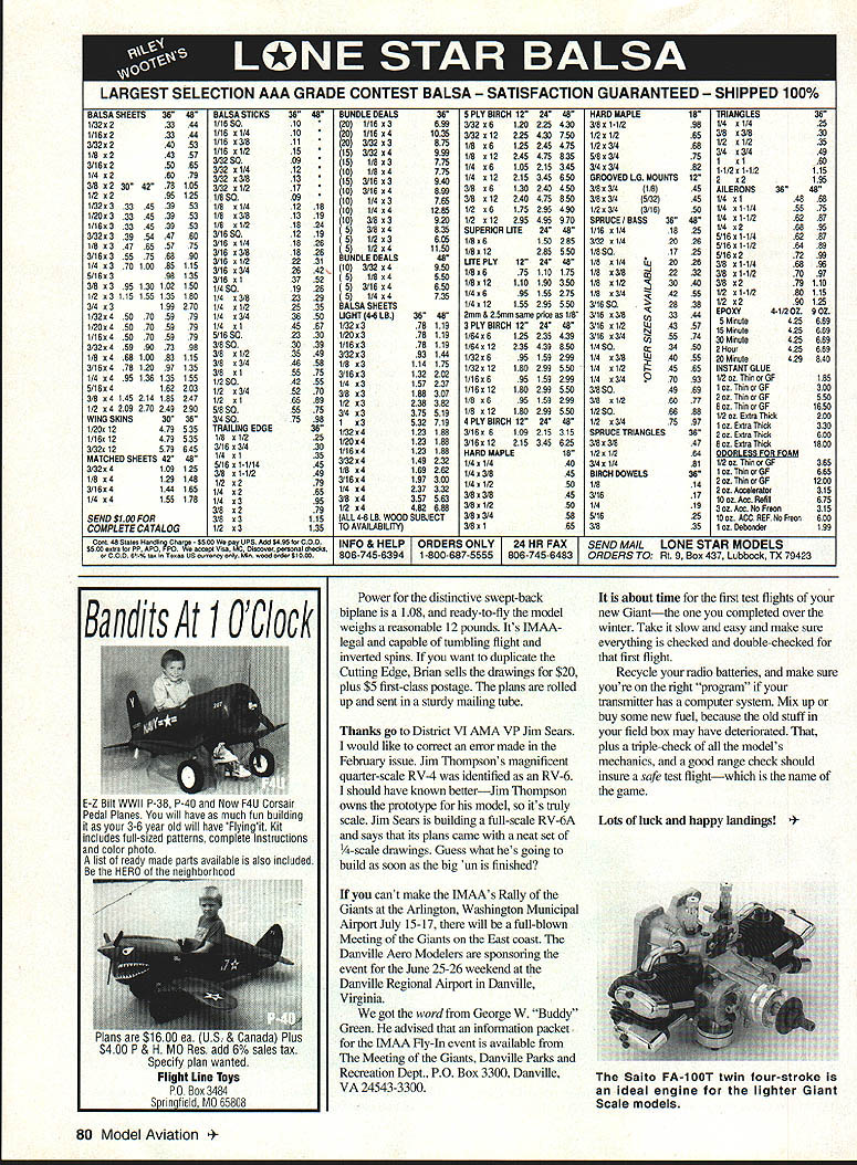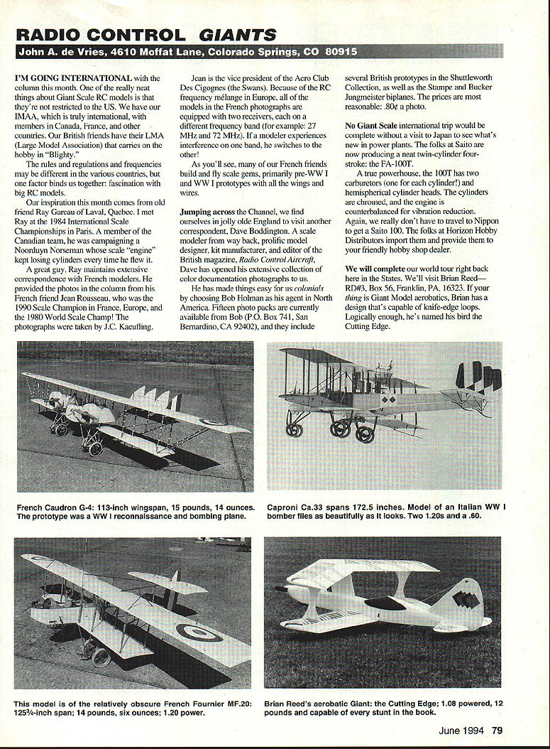 RADIO CONTROL GIANTS P FI TWw rA [eU u w urn r wri irni i- irn [fl~ 1 OING INTERNATIONAL column month really neat things about Giant Scale RC models theyre restricted US have IMAA truly international members Canada France other countries British friends have LMA Large Model Association carries hobby Blighty rules regulations frequencies may different various countries factor binds us together fascination big RC models inspiration month comes old friend Ray Gareau Laval Quebec met Ray 1984 International Scale Championships Paris member Canadian team campaigning Noorduyn Norseman scale engine kept losing cylinders time flew great guy Ray maintains extensive correspondence French modelers provided photos column French friend Jean Rousseau 1990 Scale Champion France Europe 1980 World Scale Champ photographs taken JC Kaeufling Jean vice president Aero Club Des Cigognes Swans Because RC frequency mlange Europe models French photographs equipped two receivers different frequency band example 27 MHz 72 MHz modeler experiences interference band switches other As youll see French friends build fly scale gems primarily pre-WW WW prototypes wings wires Jumping across Channel find ourselves jolly olde England visit another correspondent Dave Boddington scale modeler way back prolific model designer kit manufacturer editor British magazine Radio Control Aircraft Dave has opened extensive collection color documentation photographs us has made things easy us colonials choosing Bob Holman agent North America Fifteen photo packs currently available Bob PO Box 741 San Bernardino CA 92402 include several British prototypes Shuttleworth Collection well Stampe Bucker Jungmeister biplanes prices reasonable 80 photo No Giant Scale international trip would complete visit Japan see whats new power plants folks Saito now producing neat twin-cylinder fourstroke FA-IOOT true powerhouse lOOT has two carburetors cylinder hemispherical cylinder heads cylinders chromed engine counterbalanced vibration reduction Again really dont have travel Nippon get Saito 100 folks Horizon Hobby Distributors import provide friendly hobby shop dealer will complete world tour right back States Well visit Brian Reed RD#3 Box 56 Franidin PA 16323 thing Giant Model aerobatics Brian has design thats capable knife-edge loops Logically enough hes named bird Cutting Edge June1994 79 French Caudron G-4 113-inch wingspan 15 pounds 14 ounces Caproni Ca33 spans 1725 inches Model Italian WW prototype WW reconnaissance bombing plane bomber flies beautifully looks Two 120s 60 model relatively obscure French Fournier MF20 Brian Reeds aerobatic Giant Cutting Edge 108 powered 12 125-inch span 14 pounds six ounces 120 power pounds capable stunt book 0 0 0 0 z - --a 0IC -I o o 0 0 0 0 0 0 - Cl 0 0 0 - 0- - ~ 0 2 V0 0~ 0 0- - 0 31 - C C oo 00- 0cr 0-r 0-9 E 00C 2 C31 C ~C2 000C ~031 n ~ 0 C 00 C~0-o~0- - 2 0 ~- C0-~ 0 0 C 00 HO Coo 0o 30 01 02 011 10 01 az CD -0 00 010 jiZ 01 r 01 01 0 I3 01 (1 0cJ nfl mO j0 0 2J wm 0 OW -If 0 (0 GO _ 0Nh30OZ0 0 0000000 0 000000 00O3r aa 0Xj~0a 0 00000000 00000(0 010 0Z 0 00 0000-00(00 00& 000000000400C001 0100-00 00 o~ioooioio ob~aa 0000 0010 0 4001010 000000000000000000040 00 0 C001 01010101010100010cn OS 0000r 00000000000 -O0oo0ooo001oo o ago.aR3ro0a00a 000 RI 0 - 000 0m0 01 00 bo--bo-o00~0 . 00R33 R300-0 0 RIC0Cl0000C00000000000000C 0000 0000 00000000000 1 00101 0000000 01co00 00100005000001~J00e0 0101r0100000rS 0000010. 000r 000C00000000 0-0 0(0 -Oo0000 01Cl 01501 00 00000000 S0000 10000000000 0000aO0 00 -00 00 -oa aos 00S 00(00000000M 0000(00 (0000000000 0000000000a 000-00 0a0a0100a-Ja 0000000 10000000000 (00000*60 o6oE30 000~I a6aRIRIRIaaaa----- 6boooaoRIRIoo fl01101 000 O0oog 0000001 010r~o P. 0. 00000000 a0001-~aaaoo~ 0 .4a0a00000 rn 01 ~ z01 OTHEF1SIZESAVAILABLE K 2 000000OO-J 0 og01aosa 050 000A010501I0000005 o0ooooi3 ooRIooo RI00X DRflOos0o 5-aR30aZ .. 00. 00001 R 01-0g8g~000~ aRIor 0 ZE00-ooo5CRIRI 001 O01O01jo I5io00-orgo -AOOO 00-0 Sa a a0 00000 -00010000 0000000- 0001001 (0-00 0005001010100000050000000000 1 000000000000000000000 w31 jom 00fl310 -t 0101Q010 cOD1I 00 cnCl y00~oo a31 0~Cd C3a c0 31 0 - 0 0 ~ ga 31 22 0 -r 01a0 101 0 010 3031 a0C: C rn C -I C ii rn 0 -I 0 z C ii C 0 z -I ii Cl -I w C Cl 1 C -I 0 z C C z -I rn ni 0 CD ii 0 -L 0 0