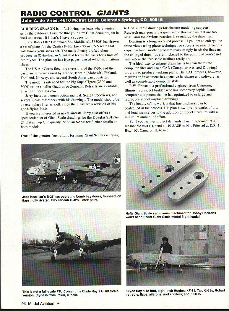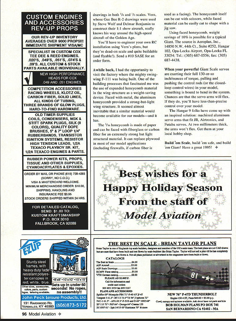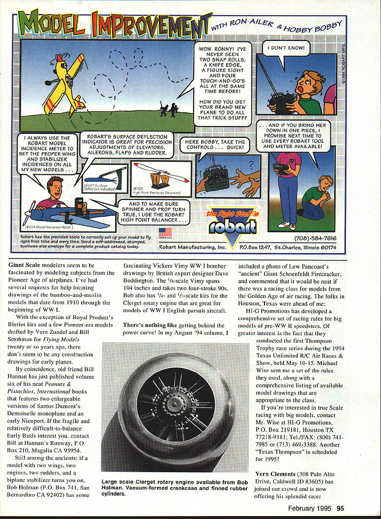 RADIO CONTROL GIANTS BUILDING SEASON full swingat least winter grips outdoors assume new Giant Scale project well underway isnt have suggestion Jerry Bates 102 Glenwood St Mobile AL 36606 has drawn set plans Curtiss P-36/Hawk 75 155 scale will knock socks off meticulously drafted plans produce 82-inch-span Giant forms basis host prototypes plan set has five pages pattern sheet US Air Corps flew three versions P-36 basic airframe used France Britain Mohawk Finland Thailand Norway several South American countries model intended big SuperTigres 2500 3000 smaller Quadras Zenoahs Retracts available will fiberglass cowl Jerry includes construction manual Scale three-views several Scale references drawings model should exemplary flier well since plans revision good-flying P-40 interested naval aircraft Jerry also offers spectacular set Giant Scale drawings Douglas SBD/A 24 Top Gun quality Send SASE further details both models greater frustrations Giant Scalers trying find suitable drawings obscure modeling subjects Research may generate great set three-views too small obvious reaction enlarge drawings Drafting long involved process opt enlarge three-views using photo techniques successive runs through copy machine another problem rears its ugly head lines enlarged drawings thickened point youre sure true scale outlines really ideal way enlarge drawings scan computer files use CAD Computer-Assisted Drawing program produce working plans CAD process however requires investment expensive hardware software well considerable computer skills RW Friestad professional engineer Cameron Illinois model builder has some very sophisticated computer equipment has optimized enlarge reproduce model airplane drawings beauty work line thickness can controlled process plan blow-ups works art lend themselves addition model structure minimum amount effort So winter project demands plan enlargement reasonable cost #10 SASE Mr Friestad RR 1 Box 163 Cameron IL 61423 94 Model Aviation Kezelians B-25 has operating bomb bay doors four-section flaps fully riveted two Zenoah G-42s Latex paint Hefty Giant Scale servo arms machined Hobby Horizons wont bend under Giant Scale model flight loads full-scale F4U Corsair its Clyde Rays Giant ScaleClyde Rays 12-foot eight-inch Hughes XF-11 Two G-38s Robart version Clyde Pekin Illinoisretracts flaps ailerons spoilers about 50 lb t gON AIL~OI~ Giant Scale modelers seem fascinated modeling subjects Pioneer Age airplanes Ive several requests help locating drawings bamboo-and-muslin models date 1910 through beginning WW exception Royal Products Bleriot kits few Pioneer-era models drafted Vein Zundel Bill Strohman Flying Models twenty years ago dont seem construction drawings early planes coincidence old friend Bill Hannan has just published volume six neat Peanuts & Pistachios International books features two enlargeable versions Santos Dumonts Demoiselle monoplane early Nicuport fragile relatively difficult-to-balance Early Birds interest contact Bill Hannans Runway PO Box 210 Magalia CA 95954 Still among ancients model two wings two engines two rudders biplane stabilizer turns Bob Holman PO Box 741 San Bernardino CA 92402 has some fascinating Vickers Vimy WW bomber drawings British expert designer Dave Boddington 1/s-scale Vimy spans 104 inches takes two four-stroke 90s Bob also has 1/4 /3-scale kits Clerget rotary engine great models WW English pursuit aircraft Theres nothing like getting behind power curve August 94 column included photo Lew Pancoasts ancient Giant Schoenfeldt Firecracker commented would neat racing class models Golden Age air racing folks Houston Texas ahead HJ-G Promotions has developed comprehensive set racing rules big models pre-WW II speedsters greater interest fact conducted first Thompson Trophy race series during 1994 Texas Unlimited R/C Air Races & Show held May 10-15 Michael Wise sent set rules used along comprehensive listing available model drawings appropriate class youre interested true Scale racing big models contact Mr Wise HI-G Promotions PO Box 219181 Houston TX 77218-9181 Tel/FAX 800 7417985 713 469-3388 Another Texas Thompson scheduled 1995 Vein Clements 308 Palo Alto Drive Caldwell ID 83605 has joined crowd now offering splendid racer FebrUary 1995 95 ANt MAKE SI 5IINNER AND PROP TURN TRUE USE THE ROART II.HIGH POINT SALANCER. J upyourmoertofly Ireet tam peel catalo0 todayRobart Manufacturing Inc PO 5 ox 1247 5VCharlee Illinois 60174 Large scale Clerget rotary engine available Bob Holman Vacuum-formed crankcase finned rubber cylinders SPECIALIST IN CUSTOM COX TEE DEE & REED ENGINES 020S 049S 051S 074S & 09S ALL CUSTOM & STOCK PARTS AVAILABLE INDIVIDUALLY COMPETITION ACCESSORIES RACING WHEELS KLOTZ OIL CARBON FIBER SOLID LINES ALL KINDS OF TUBING THREE BRANDS OF GLOW PLUGS HARD-TO-FIND HARDWARE OLD TIMER SUPPLIES COILS CONDENSERS NGK & STIlT SPARK PLUGS SILK 8 COLORS QUALITY DOPE BRUSHES 5 & 7 LOOP 114 RUBBERBANDS TRANSISTOR IGNITION SYSTEMS RESISTOR HIGH TENSION LEADS 1I2A TEXACO PLAYBOY SR KIT 1I2A TEXACO ENGINES & PARTS RUBBER POWER KITS PROPS TISSUE AND OTHER SUPPLIES CYANOACRYLATES & EPOXIES ORDER BY MAIL OR PHONE 619 728-4365 SORRY NO COD VISA & MASTERCARD WELCOME MINIMUM MERCHANDISE ORDER $1000 SHIPPING HANDLING AND INSURANCE FEE $395 STOCK ORDERS SHIPPED WITHIN 24 HRS 96 Model Aviation ings both 1/4 1/3 scales Vein Gee Bee R-2 drawings used Steve Wolf Delmar Benjamin construct 11 show aircraft really knows way around high-speed aircraft Golden Age Youll have engineer own RC installation using Veins plans theyre dead-on scale quite buildable flyable Send #10 SASE order form Awhile back opportunity visit factory mighty swingwing F-ill being built building processes fascinated use expanded honeycomb material wing structure weight-saving device Faced metal aluminum honeycomb provided strong-but-light wing structure seemed almost inevitable similar material would become available modelsand has ycomb made paper can faced fiberglass carbon fiber