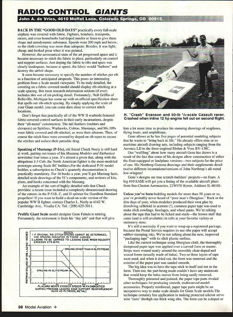 RADIO CONTROL GIANTS BACK IN THE GOOD OLD DAYS practically full-scale airplane covered fabric Fighters bombers transports racers homebuilts doped muslin linen give shape aerodynamic substance Speeds 200 mph below cloth covering adequate Besides light cheap looked great painted However aeronautical state art progressed apace became necessary stitch fabric place particularly control support surfaces Just doping fabric ribs spars clearly inadequate because speed fabric would balloon destroy airfoil shape soon became necessary specify number stitches per rib function anticipated airspeeds poses interesting problem Scale model viewpoint truly detailed covering fabric covered model should display rib-stitching scale spacing research information seldom ever includes sort nit-picking detail Fortunately Neil Griffin Belleville Michigan has come up official specification sheet spells out rib-stitch spacing simply applying scale Giant model can come darn close correct stitch locations Dont forget practically WW II warbirds featured fabric-covered control surfaces early incarnations despite all-metal construction tail feathers rudders elevators Spitfires Warhawks Cobras Mustangs 109s fabric covered rib-stitched ailerons course stitch lines covered doped-on rib tapes secure stitches reduce parasitic drag Speaking Mustangs P-5 old friend Chuck Neely still hard work putting out issues Mustang Modeler Enthusiast newsletter four times year Its almost given along ubiquitousJ-3 Cub North American fighter most-modeled prototype among Scale RC buildersFor dedicated P-5 1 model builder subscription Chucks quarterly documentation practically mandatory 16 bucks year youll get Mustang facts detailed scale drawings 51 s components reviews kits plans books concerned Mustang An example sort highly detailed info Chuck provides recent issue included completely dimensioned drawing cutouts P-S 1 B C D spinner Hamilton Standard propellers want build dead-on scale version popular WW II fighter contact Charles L Neely 4142 W Cambridge Ave Visalia CA Tel 209 625-3011 Prolific Giant Scale model designer Gene Falada retiring Fortunately retirement day job will give NOTES I IF ORIGINAL RIB STITCH SPACING CANNOT BE DETERMINED o USE SPACING INDICATED IN THESE CURVES 2 LACING TO BE CARRIED TO LEADING EDGE WHEN VELOCITY EXCEEDS 275 MPH 100150200250 PLACARD NEVER EXCEEDS SPEEDS-MPHtINDICATED CURVES PRESUME LEADING EDGE SUPPORT REINFORCEMENT SUCH AS PLYWOOD METAL SPACING OTHER THAN IN SLIPSTREAM -I SPACING IN SLIPSTREAM ash Evanson 50-lb 112-scale Cassutt racer Crashed inline 12 hp engine fell out second flight him lot time produce stunning drawings seaplanes flying boats amphibians Gene allows has five pages potential modeling subjects wants bring back life already offers nine maritime aircraft drawing sets including subjects ranging Aeronca LD three-engined Blohm & Voss BV-138C waffling about aircraft Gene has drawn result fact some designs allow construction either float-equipped landplane versionstwo subjects price Northrop Gamma drawings supplements detail twelve different incarnations/versions John Northrops all-metal low-wingers Genes designs true scratch-builders projectsno foam big #10 SASE will get listing available aircraft plans Sea-Clusion Aeronautics 22W070 Byron Addison IL 60101 Unless youve building models 50 years youve probably never heard poor mans fiberglass Back dim days yore modelers produced own glue dissolving celluloid acetone on paper tape used make slick cowlings fuselages wheel pants talking about tape licked stuckthe brown stuff came still available rolls favorite variety stationery store Its still necessity want wrap up registered package because Postal Service requires its use paper will accept rubber-stamping ink talking about new improved packaging tape its slick plastic surface Like current technique using fiberglass cloth thoroughly dampened paper tape applied over carved form master Strips wound neatly around smoothly clear-doped waxed forms usually made balsa Two three layers tape used dried out form removed exterior paper part sanded smooth big idea have tape stick itself form too part being made couldnt have undercuts would keep balsa master being easily removed Thoroughly primered painted paper tape parts rivaled other techniques producing smooth multicurved model accessories Properly reinforced paper tape parts might inexpensive way make scale details Giant Scale modelsThe technique certainly has application making protected aileron servo wire runs thrdbgh thick wing ribs form can doped 98 Model Aviation oughly waxed birch dowel bit overlap between single winding paper tape will produce slick cylinder will make fishing aileron servo extension through wing easy task Like fiberglass parts paper tape moldings really cant used structural weight- other force-bearing parts Giant Scale models relatively fragile need scale detail have produce hurry fuss resins epoxies might give paper tape method try thing sureits inexpensive will soon part year temperate climes winds March blow As winter turns spring will days eager Giant Scale fliers will venture out club field check out latest RC models Just couple/three words caution seem appropriate season winds brings important consideration no such thing constant wind changes force direction second next poses control problems particularly landing aircraft size configuration techniques used full-scale pilots minimize effects shifts gusts also useful RC fliers During cruising flight prudent pilot often slows aircraft combat turbulence action makes lot easier trim airplane level flight lessens stress gusts produce airframe suggesting RC pilot slow model down speed just above stalling would folly want arrive proper trim Giant Scale beauty dont try gas burner running full bore Just pull back throttle stick bit making sure model controllable aviating reasonable rate Things get bit dicey get closer terra firma under windy conditions takeoff its good idea hold aircra