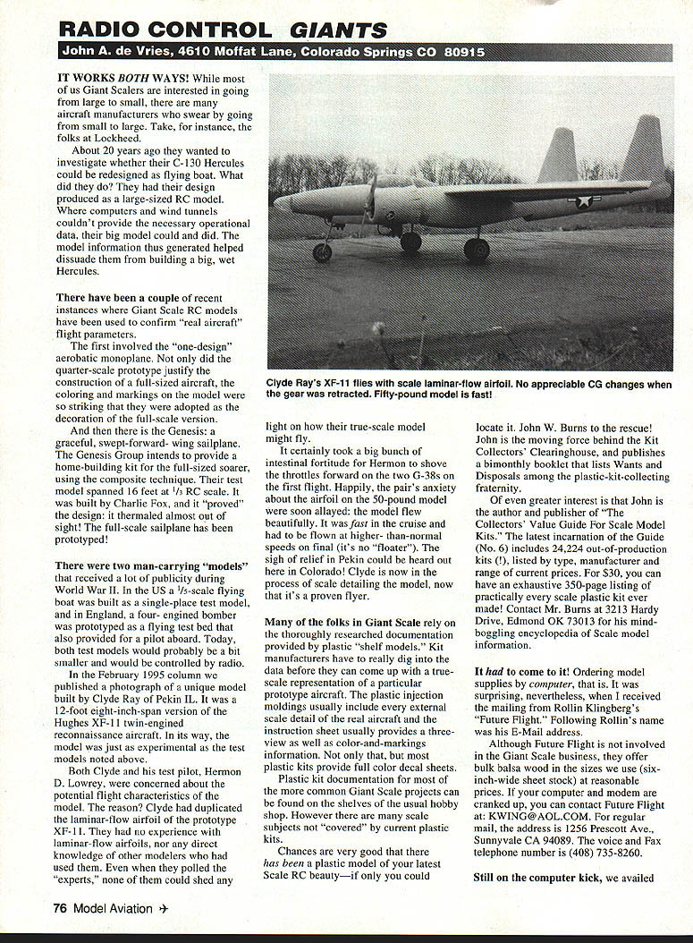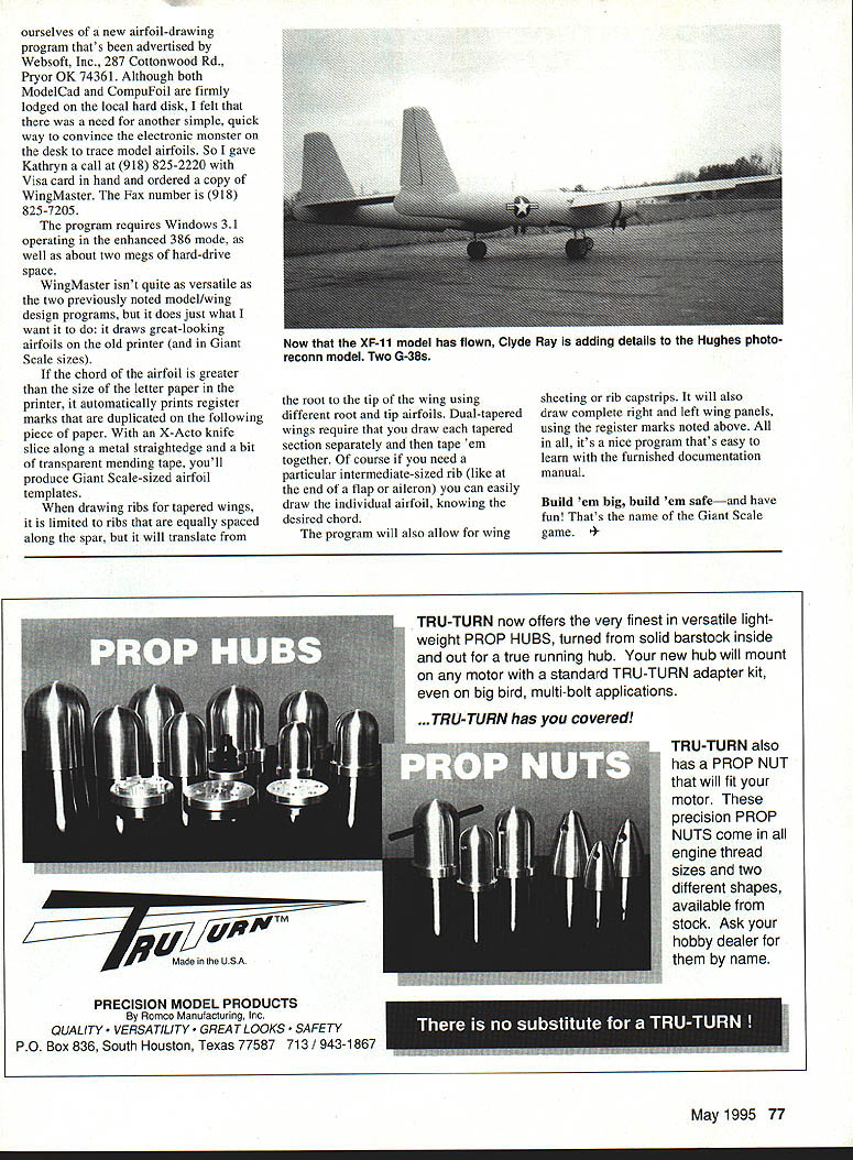 RADIO CONTROL GIANTS IT WORKS BOTH WAYS us Giant Scalers interested going large small aircraft manufacturers swear going small large Take instance folks Lockheed About 20 years ago wanted investigate whether C-130 Hercules could redesigned flying boat What did design produced large-sized RC model computers wind tunnels couldnt provide necessary operational data big model could did model information thus generated helped dissuade building big wet Hercules have couple recent instances Giant Scale RC models have used confirm real aircraft flight parameters first involved one-design aerobatic monoplane did quarter-scale prototype justify construction full-sized aircraft coloring markings model striking adopted decoration full-scale version Genesis graceful swept-forward- wing sailplane Genesis Group intends provide home-building kit full-sized soarer using composite technique test model spanned 16 feet 1/3 RC scale built Charlie Fox proved design thermaled almost out sight full-scale sailplane has prototyped two man-carrying models received lot publicity during World War II US /5-scale flying boat built single-place test model England four- engined bomber prototyped flying test bed also provided pilot aboard Today both test models would probably bit smaller would controlled radio February 1995 column published photograph unique model built Clyde Ray Pekin IL 12-foot eight-inch-span version Hughes XF-l 1 twin-engined reconnaissance aircraft its way model just experimental test models noted above Both Clyde test pilot Hermon D Lowrey concerned about potential flight characteristics model reason Clyde duplicated laminar-flow airfoil prototype XF- 11 no experience laminar-flow airfoils nor direct knowledge other modelers used polled experts could shed light true-scale model might fly certainly took big bunch intestinal fortitude Hermon shove throttles forward two G-38s first flight Happily pairs anxiety about airfoil 50-pound model soon allayed model flew beautifully fast cruise flown higher- than-normal speeds final its no floater sigh relief Pekin could heard out Colorado Clyde now process scale detailing model now its proven flyer folks Giant Scale rely thoroughly researched documentation provided plastic shelf models Kit manufacturers have really dig data before can come up truescale representation particular prototype aircraft plastic injection moldings usually include external scale detail real aircraft instruction sheet usually provides threeview well color-and-markings information plastic kits provide full color decal sheets Plastic kit documentation common Giant Scale projects can found shelves usual hobby shop However scale subjects covered current plastic kits Chances very good has plastic model latest Scale RC beautyif could locate John W Burns rescue John moving force behind Kit Collectors Clearinghouse publishes bimonthly booklet lists Wants Disposals among plastic-kit-collecting fraternity greater interest John author publisher Collectors Value Guide Scale Model Kits latest incarnation Guide No 6 includes 24224 out-of-production kits ed type manufacturer range current prices $30 can have exhaustive 350-page listing practically scale plastic kit ever made Contact Mr Burns 3213 Hardy Drive Edmond OK 73013 mindboggling encyclopedia Scale model information come Ordering model supplies computer surprising nevertheless received mailing Rollin Klingbergs Future Flight Following Rollins name E-Mail address Although Future Flight involved Giant Scale business offer bulk balsa wood sizes use six inch-wide sheet stock reasonable prices computer modem cranked up can contact Future Flight KWING@AOLCOM regular mail address 1256 Prescott Ave Sunnyvale CA 94089 voice Fax telephone number 408 735-8260 Still computer kick availed 76 Model Aviation e Rays XF-11 flies scale laminar-flow airfoil No appreciable CG changes gear retracted Fifty-pound model fast ourselves new airfoil-drawing program thats advertised Websoft Inc 287 Cottonwood Rd Pryor OK 74361 Although both ModelCad CompuFoil firmly lodged local hard disk felt need another simple quick way convince electronic monster desk trace model airfoils So gave Kathryn call 918 825-2220 Visa card hand ordered copy WingMaster Fax number 918 825-7205 program requires Windows 31 operating enhanced 386 mode well about two megs hard-drive space WingMaster isnt quite versatile two previously noted model/wing design programs does just what want draws great-looking airfoils old printer Giant Scale sizes chord airfoil greater size letter paper printer automatically prints register marks duplicated following piece paper X-Acto knife slice along metal straightedge bit transparent mending tape 11 produce Giant Scale-sized airfoil templates drawing ribs tapered wings limited ribs equally spaced along spar will translate root tip wing using different root tip airfoils Dual-tapered wings require draw tapered section separately tape em together course need particular intermediate-sized rib like end flap aileron can easily draw individual airfoil knowing desired chord program will also allow wing sheeting rib capstrips will also draw complete right left wing panels using register marks noted above its nice program thats easy learn furnished documentation manual Build em big build em safeand have fun Thats name Giant Scale game 1995 77 Now XF-11 model has flown Clyde Ray adding details Hughes photo reconn model Two G-38s TRU-TURN now offers very finest versatile light weight PROP HUBS turned solid barstock inside out true running hub new hub will mount motor standard TRU-TURN adapter kit big bird multi-bolt applications TRU-TURN has covered TM Made U S TRU-TURN also has PROP NUT will fit motor precision PROP NUTS come engine thread sizes two _different shapes available stock Ask hobby dealer name PRECISION MODEL PRODUCTS Ey Romco Manufacturing Inc QUALITY VERSA TILITY T LOOKS TY PO Box 836 South Houston Texas 77587 713 / 943-1867