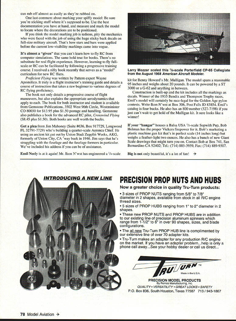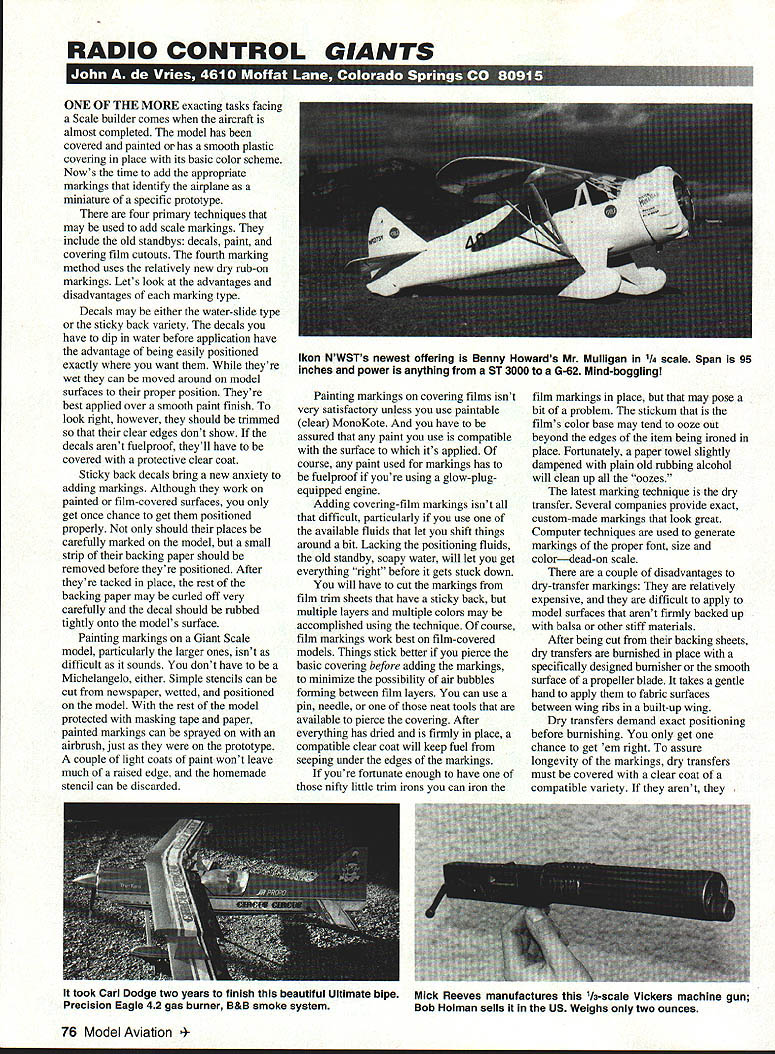 RADIO CONTROL GIANTS p ONE OF THE MORE exacting tasks facing Scale builder comes aircraft almost completed model has covered painted has smooth plastic covering place its basic color scheme Nows time add appropriate markings identify airplane miniature specific prototype four primary techniques may used add scale markings include old standbys decals paint covering film cutouts fourth marking method uses relatively new dry rub-on markings Lets look advantages disadvantages marking type Decals may either water-slide type sticky back variety decals have dip water before application have advantage being easily positioned exactly want theyre wet can moved around model surfaces proper position Theyre best applied over smooth paint finish look right however should trimmed clear edges dont show decals arent fuelproof theyll have covered protective clear coat Sticky back decals bring new anxiety adding markings Although work painted film-covered surfaces get once chance get positioned properly should places carefully marked model small strip backing paper should removed before theyre positioned After theyre tacked place rest backing paper may curled off very carefully decal should rubbed tightly onto models surface Painting markings Giant Scale model particularly larger ones isnt difficult sounds dont have Michelangelo either Simple stencils can cut newspaper wetted positioned model rest model protected masking tape paper palnted markings can sprayed airbrush just prototype couple light coats paint wont leave much raised edge homemade stencil can discarded Painting markings covering films isnt very satisfactory unless use paintable clear MonoKote have assured paint use compatible surface its applied course paint used markings has fuelproof youre using glow-plugequipped engine Adding covering-film markings isnt difficult particularly use available fluids let shift things around bit Lacking positioning fluids old standby soapy water will let get everything right before gets stuck down will have cut markings film trim sheets have sticky back multiple layers multiple colors may accomplished using technique course film markings work best film-covered models Things stick better pierce basic covering before adding markings minimize possibility air bubbles forming between film layers can use pin needle neat tools available pierce covering After everything has dried firmly place compatible clear coat will keep fuel seeping under edges markings youre fortunate enough have nifty little trim irons can iron film markings place may pose bit problem stickum films color base may tend ooze out beyond edges item being ironed place Fortunately paper towel slightly dampened plain old rubbing alcohol will clean up oozes latest marking technique dry transfer Several companies provide exact custom-made markings look great Computer techniques used generate markings proper font size colordead-on scale couple disadvantages dry-transfer markings relatively expensive difficult apply model surfaces arent firmly backed up balsa other stiff materials After being cut backing sheets dry transfers burnished place specifically designed burnisher smooth surface propeller blade takes gentle hand apply fabric surfaces between wing ribs built-up wing Dry transfers demand exact positioning before burnishing get chance get em right assure longevity markings dry transfers must covered clear coat compatible variety arent 76 Model Aviation NWSTs newest offering Benny Howards Mr Mulligan 14 scale Span 95 inches power anything ST 3000 G-62 Mind-boggling took Carl Dodge two years finish beautiful Ultimate bipe Precision Eagle 42 gas burner B&B smoke system Mick Reeves manufactures 113-scale Vickers machine gun Bob Holman sells US Weighs two ounces can rub off almost easily theyre rubbed last comment about marking spiffy model sure youre sticking stuff its supposed Use best documentation have hand measure mark model locate decorations positioned think model marking job tedious pity mechanics faced job using huge sticky back decals full-size military aircraft Thats stars bars applied before current low-visibility markings came vogue Its almost given cant learn fly RC computer simulations same hold true books Theres no substitute real flight experience However learning fly fullscale RC can facilitated following progressive training course received nifty book recently serves model curriculum new RC fliers Proficient Flying written Pattern expert Wayne Apostolico truly flight instructors training guide details course instruction takes raw beginner various degrees RC flying proficiency book details progressive course flight maneuvers also explains appropriate aerodynamics apply book both instructor student available Gemstone Publications 3502 West 96th Circle Westminister CO 80030 $1395 plus $150 postage handling Gemstone also publishes book advanced RC pilot Crosswind Flying $845 plus $150 Both books well worth bucks Got plea Jim Mahoney Suite #636 Box 917729 Longwood FL 3279 1-7729 whos building quarter-scale Aeronca Chief using ancient kit put out Union Stadt Zepplin Works AKG formerly Union City CA way back 1946 Jim says hes struggling fuselage fuselage formers particular Weve included address can assistance Emil Neely again Mr Ikon Nwst has engineered /4-scale kit Benny Howards Mr Mulligan model spans reasonable 95 inches weighs about 20 pounds can powered ST 3000 G-62 anything between Construction built-up kit includes markings decals Winner 1935 Bendix Thompson Trophy races Emils model will certainly race-legal Golden Age pylon contests Write Ikon Nwst Box 306 Post Falls ID 83854 Emils catalog four bucks also has 800 number 327-7198 just cant wait get hold Mulligan kit sure looks like winner hangar houses Balsa USA /3-scale Sopwith Pup Bob Holman has proper Vickers firepower Bobs marketing plastic machine gun kit thats perfect scale 14 inches long weighs feather-light two ounces also has bunch new Giant Scale drawings might turn Contact Bob 