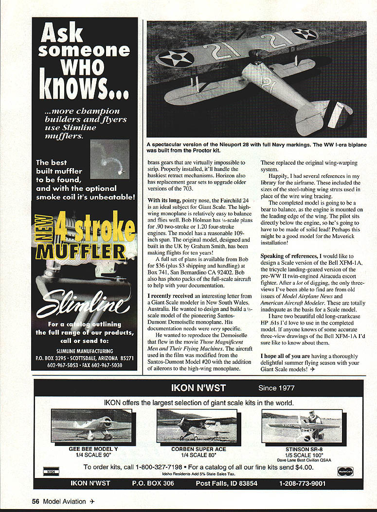 RADIO CONTROL GIANTS first met Phil Kent Paris 1984 covering international Scale contest respective magazines Phil writes Scale column British magazine RCM&E Radio Control Models & Electronics top-selling RC magazine United Kingdom Phil hit off agreed swap magazines past 11 years Ive sending him Model Aviation hes sending RCM&E Phils latest mailing found Italian company Robotec srl has come up something 11 knock socks off about $1225 theyll send very own pilot Im talking about Maverick radiocontrolled pilot Hes available V6 A special order Y scale has Ni-Cds legs complete RC system receiver servos installed torso comes ready flight dressed choice variety costumes order have Maverick fly Scale aircraft must built him mind controls must operated cockpit just like full-scale aircraft will have provide seat Maverick functional safety belt along two rudder pedals control stick working throttle quadrant Position Maverick feet rudder pedals right hand control stick left hand throttle scale pilots legs operate rudder right arm operates elevators ailerons controlled twisting torso right left deluxe version aileron action tied Mavericks head looks left right left aim operates throttle connected carburetors bellcrank simple pushrod course Mavericks extremities have firmly fixed controls first high g turn will result unpredictable loss control advantage using Maverick Assuming have two models set up use Maverick makes snap swap radios Unfortunately no indication model pilot compatible US radiocontrol frequencies nor indication orifice antenna issues want first kid block have model pilot can modify him appropriate receiver hes available Robotec srl Polisen 30 Montalto Dora Italy also market appropriate control-system components well Scale airplane model kits designed unique RC method Avey Shaw inspiration Avey long-time model builder works injection-molding business combination interests led him invent 3rd Hand clamp Mr Shaws device versatile clamp pressure generated regular #64 rubber band Turning band increases clamping pressure couple turns band provides nominal pressure Greater clamping pressure generated increasing number turns rubber band takes hand open set clamp advantages 3rd Hand made polypropylenethe same material used cyanoacrylate CyA bottles Glue wont stick jaws adjustable clamping awkwardly shaped model pieces Ive found has true five-inch clamping span making suitable Giant Scale 3rd Hand available Tower Hobbies Nick Ziroli Modelstwo $598 Although Giant Scale modelers use pneumatic systems operate retracts aircraft prefer mechanical servo action folks JR have come up super servo retracts 93 inch/ounces torque new JR 703 servo offered Horizon Hobby Distributors has machined54 Model Aviation Shaws handy pardon pun 3rd Hand clamp worksThe newly updated JR 703 retract servo features machinedwell glue wont stick itbrass gear train 93 inch/ounces torque Sporty Fokker DVII model built Rich Uravitch plans NoGiant Scale Fairchild 24 e Bob Holman has full plans particulars although did fly wellfor 109-inch wingspan model brass gears virtually impossible strip Properly installed itll handle huskiest retract mechanisms Horizon also has replacement gear sets upgrade older versions 703 its long pointy nose Fairchild 24 ideal subject Giant Scale high wing monoplane relatively easy balance flies well Bob Holman has -scale plans 90 two-stroke 120 four-stroke engines model has reasonable 109inch span original model designed built UK Graham Smith has making flights ten years full set plans available Bob $36 plus $3 shipping handling Box 741 San Bernardino CA 92402 Bob also has photo packs full-scale aircraft help documentation recently received interesting letter Giant Scale modeler New South Wales Australia wanted design build 1/3 scale model pioneering Santos Dumont Demoiselle monoplane documentation needs very specific wanted reproduce Demoiselle flew movie Magnificent Men Flying Machines aircraft used film modified Santos-Dumont Model #20 addition ailerons high-wing monoplane replaced original wing-warping system Happily several references library airframe included sizes steel-tubing wing struts used place wire wing bracing completed model going bear balance engine mounted leading edge wing pilot sits directly below engine hes going have made solid lead Perhaps might good model Maverick installation Speaking references would like design Scale version Bell XFM- lA tricycle landing-geared version pre-WW II twin-engined Airacuda escort fighter After lot digging threeviews Ive able find old issues Model Airplane News American Aircraft Modeler totally inadequate basis Scale model have two beautiful old long-crankcase HP 61s Id love use completed model anyone knows some accurate three-view drawings Bell XFM-1A Id sure like know about hope having thoroughly delightful summer flying season Giant Scale models SON SR-8 1/4 SCALE 901/4 SCALE 80 SCALE 100 Dave Lane Best Civilian QSAA order kits call 1-800-327-7198 log fine kits send $400 Idaho Residents Add 5% State Sales Tax 56 Model Aviation 4A spectacular version Nieuport 28 full Navy markings WW I-era biplane built Proctor kit IKON offers largest selection giant scale kits world