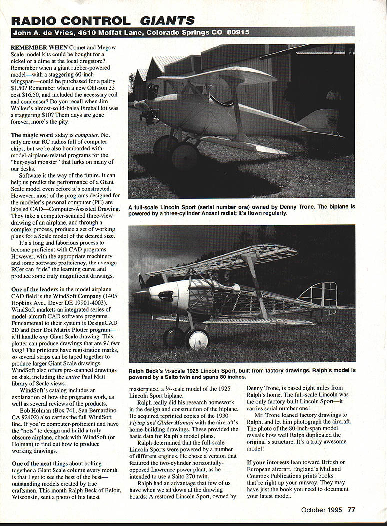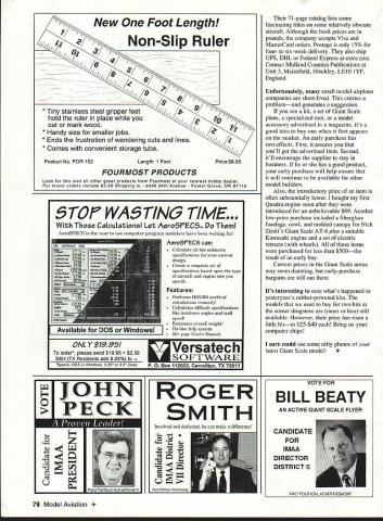 RADIO CONTROL GIANTS REMEMBER WHEN Comet Megow Scale model kits could bought nickel dime local drugstore Remember giant rubber-powered modelwith staggering 60-inch wingspancould purchased paltry $150 Remember new Ohlsson 23 cost $1650 included necessary coil condenser recall Jim Walkers almost-solid-balsa Fireball kit staggering $10 days gone forever mores pity magic word today computer RC radios full computer chips also bombarded model-airplane-related programs bug-eyed monster lurks desks Software way future can help us predict performance Giant Scale model before its constructed However programs designed modelers personal computer PC labeled CADComputer-Assisted Drawing take computer-scanned three-view drawing airplane through complex process produce set working plans Scale model desired size Its long laborious process become proficient CAD programs However appropriate machinery some software proficiency average RCer can ride learning curve produce some truly magnificent drawings leaders model airplane CAD field WindSoft Company 1405 Hopkins Ave Dover DE 19901-4003 WindSoft markets integrated series model-aircraft CAD software programs Fundamental system DesignCAD 2D Dot Matrix Plotter program itll handle Giant Scale drawing plotter can produce drawings 91 feet long printouts have registration marks several strips can taped together produce larger Giant Scale drawings WindSoft also offers pre-scanned drawings disk including entire Paul Matt library Scale views WindSofts catalog includes explanation programs work well several reviews products Bob Holman Box 741 San Bernardino CA 92402 also carries full WindSoft line youre computer-proficient have hots design build truly obscure airplane check WindSoft Holman find out produce working drawings neat things about bolting together Giant Scale column month get see best best outstanding models created true craftsmen month Ralph Beck Beloit Wisconsin sent photo latest masterpiece 1/3-scale model 1925 Lincoln Sport biplane Ralph really did research homework design construction biplane acquired reprinted copies 1930 Flying Glider Manual aircrafts home-building drawings provided basic data Ralphs model plans Ralph determined full-scale Lincoln Sports powered number different engines chose version featured two-cylinder horizontallyopposed Lawrence power plant intended use Saito 270 twin Ralph advantage few us have sit down drawing boards restored Lincoln Sport owned Denny Trone based eight miles Ralphs home full-scale Lincoln factory-built Lincoln Sportit carries serial number Mr Trone loaned factory drawings Ralph let him photograph aircraft photo 80-inch-span model reveals well Ralph duplicated originals structure Its truly awesome model interests lean toward British European aircraft Englands Midland Counties Publications prints books thatre right up runway may have just book need document latest model October 1995 77 full-scale Lincoln Sport serial number owned Denny Trone biplane powered three-cylinder Anzani radial its flown regularly Ralph Becks -scale 1925 Lincoln Sport built factory drawings Ralphs model powered Saito twin spans 80 inches New Foot Length Non-Slip Ruler / 1 /i 1/ / 1 Product No FOR 152Length 1 FootPrice$695 * Tiny stainless steel gripper feet hold ruler place cut mark wood * Handy size smaller jobs * Ends frustration wandering cuts lines * Comes convenient storage tube FOURMOST PRODUCTS Look other great products Fourmost nearest hobby dealer direct orders include $350 Shipping 4040 24th Avenue Forest Grove O 97116 TOF WA TIME Calculations Let AeroSFECS AeroSPECS easy use computer program modelers have heen waiting AeroSFECS can Calculate att unknown specifications current design Create comptete set specifications based upon type aircraft engine size specie Feature6 Performs HOURS worth catcutations instantly Catcutates difficutt specifications like incidence angles stalt speed Estimates overatt weight On-tine hetp system 26 page Users Manual ONLY$1995Versatech order please send $1995 S&H TX Residents add 825% SOFTWARE SpecifyDOSorWindows 525 35 DisksP 0 Box 112022 Carrollton TX 75011 ROGER SMITH Involved dedicated can make difference Poltcal Adcetsng 71-page catalog lists some fascinating titles some relatively obscure aircraft Although book prices pounds company accepts Visa MasterCard orders Postage 15% four- six-week delivery also ship UPS DHL Federal Express extra cost Contact Midland Counties Publications Unit 3 Maizefield Hiuckley LElO lYF England Unfortunately small model-airplane companies short-lived creates problemand generates suggestion see kit set Giant Scale plans specialized tool model accessory advertised magazine its good idea buy first appears market An early purchase has two effects First assures youll get advertised item Second itll encourage supplier stay business has good product early purchase will help ensure will continue available other model builders Also introductory price item often substantially lower bought first Quadra engine soon after introduced unbelievable $89 Another low-price purchase included fiberglass fuselage cowl molded canopy Nick Zirolis Giant Scale AT-6 plus suitable Kawasaki engine set electric retracts wheels items purchased less $500the result early buy Current prices Giant Scale arena may seem daunting early-purchase bargains still out Its interesting note whats happened yesteryears rubber-powered kits models used buy two bits corner drugstore less still available However price has risen little bitto $25-$40 Bring computer chips sure could use some nifty photos latest Giant Scale model odel Aviation VOTE FOR BILL BEATY ACTIVE GIANT SCALE FLYER PAID POLITICAL ADVERTISEMENT CANDIDATE FOR IMAA DIR ECTOR DISTRICT 5
