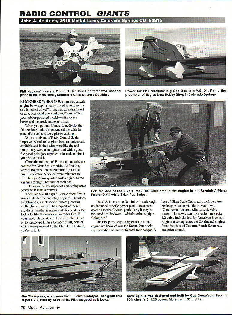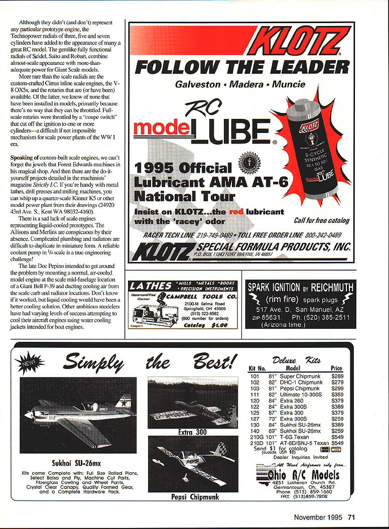 RADIO CONTROL GIANTS REMEMBER WHEN YOU simulated scale engine wrapping heavy thread around cork length dowel extra nickel two could buy celluloid engine nibber-powered modelwith rocker boxes pushrods everything got Control Line Scale fake scale cylinders improved along state art plastic castings advent Radio Control Scale improved simulated engines became universally available looked lot like real thing lot lighter good fuelproof paint job represented scale engine Scale model Came millenium Functional metal scale engines Giant Scale models first curiositiesintended primarily engine collector Modelers reluctant trust gas/glow quarter-scale engines vagaries flight because cost Lets examine impact combining scale power scale airframes few full-scale aircraft single-cylinder reciprocating engines Therefore definition scale model power plant multicylinder device simplest usually twin appropriate models look lot like venerable Aeronca C-2 model duplicates Ed Heaths Baby Bullet prototype British Comper Swift both powered Cherub 32 hp twin youre luck OS four-stroke Gemini twins although intended scale power plants almost dead-on Cherub particularly theyre mounted upside downwith exhaust pipes facing up first purposely-designed scale model engine know Kavan four-stroke representation Continental four-banger host Giant Scale Cubs really took true Scale appearance Kavan 4 Continental impressed its scale valve covers newly available scale four-stroke 12-cubic-inch flat four American Precision Engines also duplicates Continental engines found host Cessnas Beech Bonanzas other aircraft 70 Model Aviation Nuckles h-scale Model D Gee Bee Sportster won second Power Phil Nuckles big Gee Bee YS 91 Phils place 1995 Rocky Mountain Scale Masters Qualifier proprietor Eagles Nest Hobby Shop Colorado Springs Bob McLeod Pikes Peak R/O Club cranks engine Scratch-A-Plane Fokker DVIII Brian Paul helps Jim Thompson owns full-size prototype designed thisSemi-Spinks designed built Gus Gustafson Span super RV-4 built Al Vacchio Flies good looks80 inches YS 120 power 130 flights Although didnt dont iepresent particular prototype engine Technopower cadials three five seven cylinders have added appearance great RC model gemlike fully functional radials Seidel Saito Robart combine almost-scale appearance more-thanadequate power Giant Scale models rare scale radials custom-crafted Cirrus inline scale engines V 8 OX5s rotaries have available latter know have installed models primarily because theres no way can thmtttled Fullscale rotaries throttled coupe switch cut off ignition cylindersa difficult impossible mechanism scale power plants WW era Speaking custom-built scale engines cant forget jewels Forest Edwaids machines magical shop do-ityourself projects detailed machinists magazine Strictly IC youre handy metal lathes drill presses milling machines can whip up quarter-scale Kinner K5 other model power plant drawings 24920 43rd Ave S Kent WA 980324160 sad lack scale engines representing liquid-cooled prototypes Allisons Merlins conspicuous absence Complicated plumbing radiators difficult duplicate miniature form reliable coolant pump 1/4 scale true engineering challenge late Doc Pepino intended get around problem mounting normal air-cooled model engine scale mid-fuselage location Giant Bell P-39 ducting cooling air scale carb radiator locations Dont know worked liquid cooling would have better cooling solution Other ambitious modelers have varying levels success attempting cool aircraft engines using water cooling jackets intended boat engines Kits come Complete Full Size Rolled Plans Select Balsa Ply Machine Cut Parts Fiberglass Cowling Wheel Pants Crystal Clear Canopy Quality Formed Gear Complete Hardware Pack Ve4ze Model Price 10181Super Chipmunk$289 10282DHC-1 Chipmunk$279 10381Pepsi Chipmunk$299 11162Ultimate 10-3005$359 12084Extra 260$379 12284Extra 3005$389 12587Extra 300$379 12770Extra 3005$259 13084Sukhoi SU-26mx$389 14069Sukhoi SU-26mx$259 210G101T-6G Texan$549 210D101AT-6D/SNJ-5 Texan$549 SerdSd1 % oIog er Inquiries Invited AI 7Oeod 4ames oa4 nem .hio A/C Models 4251 Lutheron Church Ad Germantown Oh 45327 Phone 513 8591660 FAX 5138597202 November1995 71 FOLLOW THE LEADER Galveston ra ie ACAMPDELL TOOLS Co 2100M Saline Rand Springfield OH 45505 /JAIocili513 3228562 800 number orders Cataleg $L99 r4ee4d Kit No Sukhoi SU-26mx Iepsi Lhlpmunk NEED SCALE DOCUMENTATION, Antiques Military Civilian Helicopters Sailplanes have the worlds largest aircraft documentation collection 5500 different full color photo studies 1905-1995 30000 3-view line drawings New 1995 Catalog/Guide 168 pages Only $800 Canada $900 Overseas $1400 Bob Banka s Scale Model Research 3114 Yukon Avenue e Costa Mesa CA 92626 ATHER CUT creates new standard ease accuracy cutting white blue foam wing cores s off Precise single wire tracking concert micro-adjustable balance weights guided exclusive three-point tracking system guarantees ripple-free surfaces No trailing edge burn-out common two wire systems Couple FEATHER CUT Tekoas THERMAL GENERATOR fool proof temperature control youll Pro st time out Cuts straight taper wings fins stabilizers matically ts tape edge workbench dining table stores its own heavy duty mailing tube lete kit anodized plated components no hardware store trips ructions include cutting first wing making templates dd Bow 40 52 Available Power supply required Guaranteed out perform rest Simply best TEKOA THE CENTER OF DESIGN 49380 SKYHARBOR WAY AGUANGA CA 92536 FEATHER CuT $14950 S & H THERMAL GENERATOR Power Supply $11950 S & H have have heard some folks going give liquid-cooled scale RC engine go things too preliminary discuss column well let know Although Giant Scale column emphasis model side things fascinated documentation side hobby end wed like announce weve found superb draftsman aircraft drawings plans league themselves talking about drawings rival Bill Wylam late Paul Matt artist Stanley Teachman 71 East Ave Fairport NY 1445
