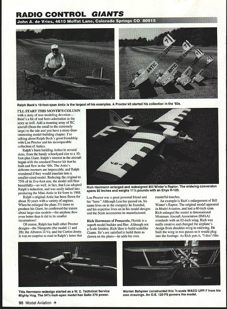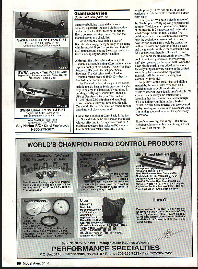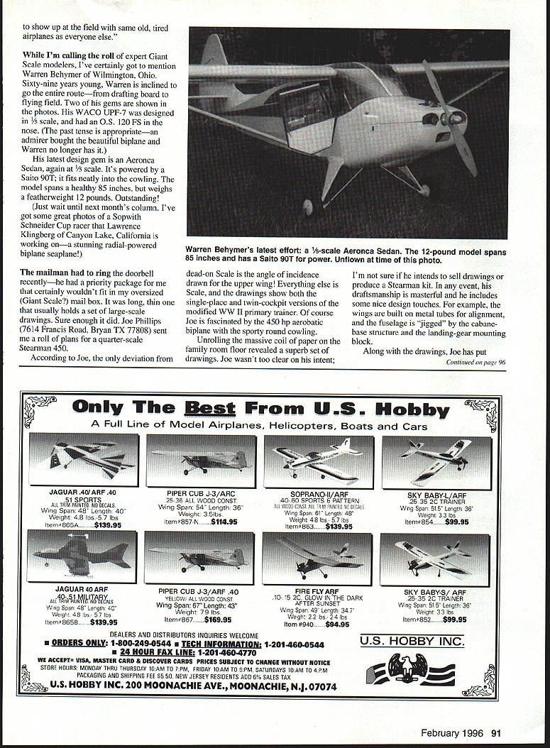 RADIO CONTROL GIANTS ILL START THIS MONThS COLUMN story true modeling devotion theres bit real hero-admiration story well Add stunning array RC aircraft small extremely large tale have more-thaninteresting model-building chapter Im talking about Ralph Becks great friendship Lou Proctor incomparable collection Antics Ralphs building Antics several sizes handy schoolyard size 10foot-plus Giant Ralphs interest aircraft began standard Proctor kit built flew 60s Antics airborne manners impeccable Ralph wondered would translate smaller-sized model Reducing original 75% its five-foot size model still flew beautifullyso well fact Lou adopted Ralphs reduction easily talked producing Mini-Antic kit form 1968 Ralphs original Antic has flown about 30 years variety engines enlarged plans 1 times produce Giant confirmed truism about large-size modelsthe airplane flew better did its smaller incarnations course Ralph has built other Proctor designsthe Nieuports model 11 28 Albatros DVa Curtiss Jenny no surprise read Ralphs letter Lou Proctor great personal friend hero Although Lou has passed name lives company founded expertise lives model designs Scale accessories manufactured Rich Herrmann Pensacola Florida superb model builder flier Although Scale fetishist Rich likes build scalelike Giants Hes satisfied build shown planshe adds own masterful touches An example Richs enlargement Bill Winters Raptor original model appeared Model Aviation 60-inch span Rich enlarged model International Miniature Aircraft Association IMAA standards 82-inch wing Rich really creative changed airplanes design shoulder-wing midwing built wing two pieces would plug fuselage As Rich puts dont like Herrmann redesign started W E Technical Service Warren Behymer constructed 1A-scale WACO UPF-7 Mighty Hog 94-inch-span model has Saito 270 power own drawings An OS 120 FS powers model 90 Model Aviation h Becks 1 0-foot-span Antic largest examples Proctor kit started collection 60s icn nerrmann eriiargu unu ruu~Iuu Winters Raptor midwing conversion spans 82 inches weighs 11 ds wiih Enya R-1 20 show up field same old tired airplanes everyone else Im calling roll expert Giant Scale modelers Ive certainly got mention Warren Behymer Wilmington Ohio Sixty-nine years young Warren inclined go entire routefrom drafting board flying field Two gems shown photos WACO UPF-7 designed Vs scale OS 120 FS nose past tense appropriatean admirer bought beautiful biplane Warren no longer has latest design gem Aeronca Sedan again 1/5 scale Its powered Saito 90T fits neatly cowling model spans healthy 85 inches weighs featherweight 12 pounds Outstanding Just wait until next months column Ive got some great photos Sopwith Schneider Cup racer Lawrence Klingberg Canyon Lake California working ona stunning radial-powered biplane seaplane mailman ring doorbell recentlyhe priority package certainly wouldnt fit oversized Giant Scale mail box long thin usually holds set large-scale drawings Sure enough did Joe Phillips 7614 Francis Road Bryan TX 77808 sent roll plans quarter-scale Stearman 450 According Joe deviation dead-on Scale angle incidence drawn upper wing Everything else Scale drawings show both single-place twin-cockpit versions modified WW II primary trainer course Joe fascinated 450 hp aerobatic biplane sporty round cowling Unrolling massive coil paper family room floor revealed superb set drawings Joe wasnt too clear intent Im sure intends sell drawings produce Stearman kit event draftsmanship masterful includes some nice design touches example wings built metal tubes alignment fuselage jigged cabane base structure landing-gear mounting block Along drawings Joe has put Continued page 96 Only TheFrom US Hobby Full Line Model Airplanes Helicopters Boats Cars bI JAGUAR 4OIARF 40 51 SPORTS ALL TRIM PAINTED Pit DECALS Wing Span 48 Length 40 Weight 48 lbn-57 lbs ItemnOSSA JAGUAR 40 ARF iTY Wing Span 48 Length 40 Weignt 48 Ibs- 57 lbs Item 8658 995 PIPER CUB J-3/ARC 25-36 AL. WOOD CONST Wing Span 54 Length 36 Weight 3 SIbs Item#857 N $11495 PIPER CUB J-3/ARF 40 YELLOW AL WOOD CONST Wing Span 67 Length 43 Weight 79 lbs ItemnSS7 95 FIRE FLY ARF 10-15 2C GLOW IN THE DARK AFTER SUNSET Wing Span 49 Length 347 Weight 22 lbs- 24 lbs Item #940 5 DEALERS AND DISTRIBUTORS INQUIRIES WELCOME QRDERLONLY 1400-249-0544 u TECH INFORMATION 1-2014600544 u 24 HOUR FAX LINE 1-2014604770 WE ACCEPT VISA MASTER CARD & DISCOVER CARDS PRICES SUBJECT TO CHANGE WITHOUT NOTICE STORt HOURS MONDAY THRU THURSDAY tOAM TO 7 PM FRIDAY tO AM TO RPM SATURDAYS 10AM TO 4PM PACKAGING AND SHIPPING FEE S5 50 NEW JERSEY RESIDtNTS ADD 0% SALES lAX US HOBBY INC 200 MOONACHIE AVE NOONACHIE NJ 07074 SKY BABY-S/ ARF 25-35 2C TRAINER Wing Span 515 Length 36 Weight 33 lbs Itemn852 5 US HOBBY INC February 1996 91 Warren Behymers latest effort 1A-scale Aeronca Sedan 12-pound model spans 85 inches has Saito 90T power Unflown time photo ___I_ SOPRANO-II/ARF SK BABY-L/ARF 40-60 SPORTS 8 PATTERN 5 2C TRAINER ALL WASh CONSA hi PA hItS hA STEAlWing Span St 5 Length 36 Wing Span St Length 48 eight 33 lbs Weight 48 lbs- 57 lbs 1teme854 $9995 OK II Also Available Rota Finish Stiletto Color Tile P-51 Sky Harbor R/C Fine Woods 1-800-279-2871 G iantsldeVries Continued page 91 together building manual thats truly detailed parallels good old instruction books Heathkit folks put together construction step covered manual serves check list Joe currently developing pair fiberglass landing-gear leg fairings go along model youve got hots build 30-pound round-engine Stearman model takes 45 hp engine drop Joe line Although titles bit redundant Bill Hannans latest publishing effort maintains superior quality books GBs & Gee Bees features Bills others great Scale drawings GB refers Gordon Bennett airplane races 1910-12theyre detailed books text As Ive said before although Bills books include mostly Peanut Scale drawings theyre easy enlarge Giant size thing building flying Pioneer Era models GBs & Gee Bees book $1095 plus $250 shippi