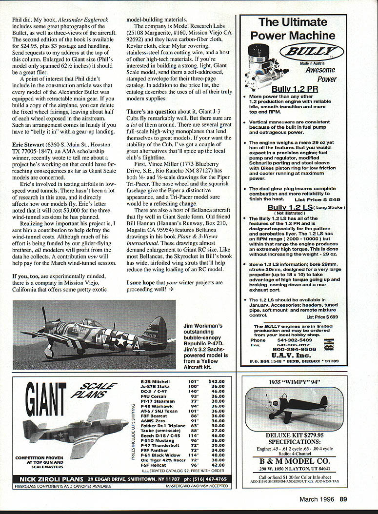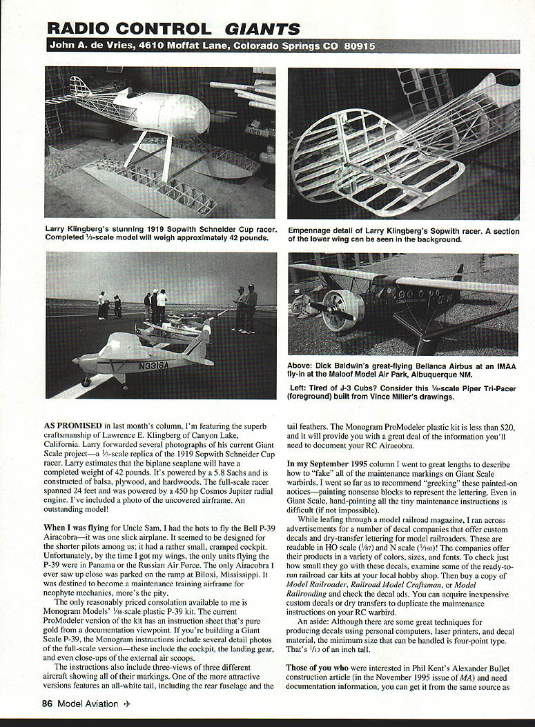 RADIO CONTROL GIANTS KYIJ II Left Tired J-3 Cubs Consider -scale Piper Tn-Pacer foreground built Vince Millers drawings AS PROMISED last months column Im featuring superb craftsmanship Lawrence E Klingberg Canyon Lake California Lany forwarded several photographs current Giant Scale projecta -scale replica 1919 Sopwith Schneider Cup racer Larry estimates biplane seaplane will have completed weight 42 pounds Its powered 58 Sachs constructed balsa plywood hardwoods full-scale racer spanned 24 feet powered 450 hp Cosmos Jupiter radial engine Ive included photo uncovered airframe An outstanding model flying Uncle Sam hots fly Bell P-39 Airacobrait slick airplane seemed designed shorter pilots among us rather small cramped cockpit Unfortunately time got wings units flying P-39 Panama Russian Air Force Airacobra ever saw up close parked ramp Biloxi Mississippi destined become maintenance training airframe neophyte mechanics mores pity reasonably priced consolation available Monogram Models 8-scale plastic P-39 kit current ProModeler version kit has instruction sheet thats pure gold documentation viewpoint youre building Giant Scale P-39 Monogram instructions include several detail photos full-scale versionthese include cockpit landing gear close-ups external air scoops instructions also include three-views three different aircraft showing markings attractive versions features all-white tail including rear fuselage tail feathers Monogram ProModeler plastic kit less $20 will provide great deal information youll need document RC Airacobra September 1995 column went great lengths describe fake maintenance markings Giant Scale warbirds went far recommend greeking painted-on noticespainting nonsense blocks represent lettering Giant Scale hand-painting tiny maintenance instructions difficult impossible leafing through model railroad magazine ran across advertisements number decal companies offer custom decals dry-transfer lettering model railroaders readable HO scale 1/87 N scale 1/loo companies offer products variety colors sizes fonts check just small go decals examine some ready-torun railroad car kits local hobby shop buy copy Model Railroader Railroad Model Craftsman Model Railroading check decal ads can acquire inexpensive custom decals dry transfers duplicate maintenance instructions RC warbird An aside Although some great techniques producing decals using personal computers laser printers decal material minimum size can handled four-point type Thats 1/13 inch tall interested Phil Kents Alexander Bullet construction article November 1995 issue MA need documentation information can get same source 86 Model Aviation 4Larry Klingbergs stunning 1919 Sopwith Schneider Cup racer Completed 1/3-scale model will weigh approximately 42 pounds Empennage detail Larry Klingbergs Sopwith racer section lower wing can seen background Above Dick Baldwins great-flying Bellanca Airbus IMAA fly-in Maloof Model Air Park Albuquerque NM Phil did book Alexander Eaglerock includes some great photographs Bullet well three-views aircraft second edition book available $2495 plus $3 postage handling Send requests address top column Enlarged Giant size Phils model spanned 621/2 inches should great flier point interest Phil didnt include construction article model Alexander Bullet equipped retractable main gear build copy airplane can delete fixed wheel fairings leaving about half wheel exposed airstream Such arrangement comes handy have belly gear-up landing Eric Stewart 6360 5 Main St Houston TX 77005-1847 AMA scholarship winner recently wrote tell about project hes working could have farreaching consequences far Giant Scale models concerned Erics involved testing airfoils lowspeed wind tunnels hasnt lot research area directly affects models fly Erics letter noted will cost $3000 three wind-tunnel sessions has planned Realizing important project sent him contribution help defray wind-tunnel costs Although much effort being funded glider-flying brethren modelers will profit data collects contribution now will help pay March wind-tunnel session too experimentally minded company Mission Viejo California offers some pretty exotic FIBERGLASS COMPONENTS AND CANOPIES AVAILABLE model-building materials company Model Research Labs 25108 Marguerite #160 Mission Viejo CA 92692 have carbon-fiber cloth Kevlar cloth clear Mylar covering stainless-steel foam cutting wire host other high-tech materials youre interested building strong light Giant Scale model send self-addressed stamped envelope three-page catalog addition price list catalog describes uses of truly modem supplies Theres no question about Giant 1-3 Cubs fly remarkably well sure lot around several great full-scale high-wing monoplanes lend themselves great models want stability Cub Ive got couple great alternatives thatll spice up local clubs flightline First Vince Miller 1773 Blueberry Drive SE Rio Rancho NM 87127 has both /6- 1/t-scale drawings Piper Tn-Pacer nose wheel squarish fuselage give Piper distinctive appearance Tri-Pacer model sure would refreshing change also host Bellanca aircraft fly well Giant Scale form Old friend Bill Hannan Hannans Runway Box 210 Magalia CA 95954 features Bellanca drawings book Plans & 3-Views International drawings almost demand enlargement Giant RC size Like Bellancas Skyrocket Bills book has wide airfoiled wing struts thatll help reduce wing loading RC model sure hope winter projects proceeding well Workmans outstanding bubble-canopy Republic P-47D Jims 32 Sachs powered model Yellow Aircraft kit MASTERCARD AND VISA ACCEPTED Ultimate Power Machine MadesAustna Awesome Power Bully 12 PR Mare power other 12 production engine reliable Idle smooth transition top end RPM Vertical maneuvers consistent because built fuel pump outrageous power engine weighs mere 29 oz yet has features would expect precision engine fuel pump regulator modified Schnurlie porting steel sleeve Dikes piston ring low friction cooler running maximum power dual glow plu
