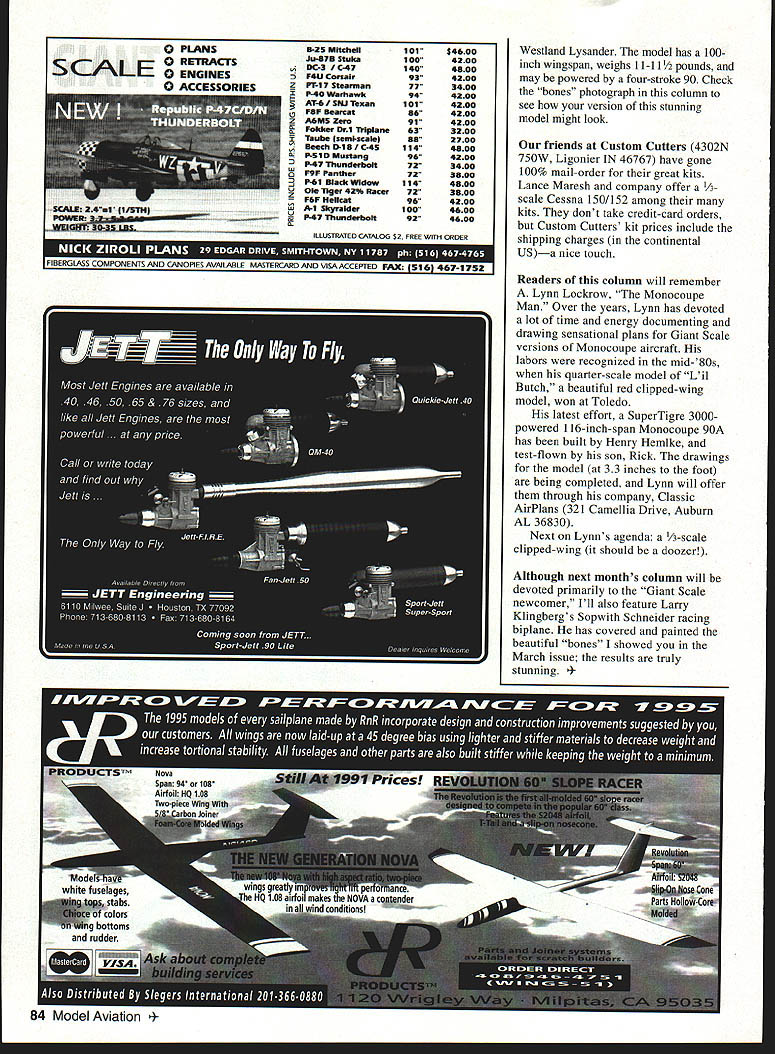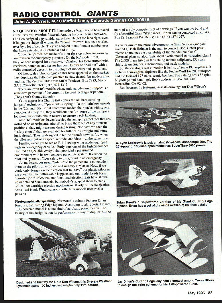 RADIO CONTROL GIANTS NO QUESTION ABOUT IT Leonardo da Vinci would amazed uses invention fostered Among other aerial hardware Old Leo designed pyramidal parachute got idea right got shape wrong aerial lifesaver has worked over lot people Theyve adapted found number uses have extended its usefulness utility course parachutes made silk rip-stop nylon worn aircrewmen emergency purposes RC model front theyve adapted air shows Charlie torso stuffed receivers batteries servos has known bail out radio-controlled descent delight modelers spectators late scale ribbon-drogue chutes have appeared market duplicate full-scale practice slow ducted-fan models after landing Theyre available MRM Products Box 7383 Macon GA 31209-7383 Tel 912 477-1317 RC models aerodynamic support scale-size parachute currently favored rectangular pattern arent Giants though Yet appear Charlie copies old barnstorming jumpers technique parachute slipping thrill airshow crowds 20s 30s aerial daredevils loaded packs several canopies As fell would cut canopies loosealways reserve ensure soft landing Also RC modelers havent scaled antispin parachutes installed experimental aircraft bring out unusual positions might assume during testing Nor have seen safety chutes available full-scale ultralight homebuilt aircraft Theyre designed let aircraft down softly pilot runs out airspeed altitude ideasat same time Finally weve yet see F-l 11 swing-wing model equipped emergency capsule Early versions fighter/bomber featured ejectable cockpit provided pressurized environment its own massive parachute system carried pilot systems officer safely ground emergency As modelers usual tribute parachute include pilots aerobatic military airplanes Now could design scale ejection seat save plastic pilots event unthinkable happens model heads powder job course nonfunctional ejection seats have shown up detailed Scale models nobodys adapted blank 22-caliber cartridge ejection mechanisms Early full-scale ejection seats used blank 37mm cannon shells later models used rocket power Photographically speaking months column features Brian Reeds great Cutting Edge biplane According reports Brians 108-powered model some kind aerobatic phenomenon beauty design its performance easy duplicatethe mark truly competent set drawings want build fly beautiful Giant sky dancer Brian can contacted Rd #3 Box 89 Franklin PA 16323 Tel 814 437-1627 yoare more-adventuresome Giant Scalers have $11 Bob Holman man contact Bobs latest press release announces availability model bauplane German plans catalog Talk about exotic model-construction plans 2000 plans listed catalog include sailplanes RC scale ships steam engines automobiles truck models catalogs real attraction its list Scale RC airplanes includes four-engine airplanes like Focke-Wulf Fw 200 transport Heinkel 177 transoceanic bomber catalog costs $8 plus $3 postage handling Bobs address Box 741 San Bernardino CA 92402 Bob currently featuring 1/6-scale drawings Don Wilsons May1996 83 A Lynn Lockrows latest almost-1k-scale Monocoupe 90A 251/4-pound 116-inch-span model has SuperTigre 3000 power Brian Reeds 108-powered version Giant Cutting Edge biplane Brian has set drawings available text has details Designed built UKs Don Wilson A-scale Westland Lysander spans 100 inches yet weighs 11 pounds Jay Dillons Cutting Edge Jay held contest among Texas RCers design color scheme 108-powered Giant 3-25 Mitcheu Ju-87B Stuka DC-3 1C47 F4U Corsair PTI 7 Stearman P40 Warhawk AT-6 / SMJ Texan F8F Bearcat A6U5 Zero Fokker Dri Triplane Taube Isemi-scalel Beech D-1 8/ C45 P-SID Mustang P47 Thunderbolt F9F Panther P41 Black Widow Ole TIger 42% Racer FOF Hellcat A-I Skyralder P47 Thunderbolt 101 100 140 3. 77. 94. 101 86 9. 63 88 114 96 72 72 114 72 96 100 92 $4600 4200 4800 4200 3400 4200 4200 4200 4200 3200 2700 4800 4200 3400 3800 4800 3800 4200 4600 4600 ILLUSTRATED CATALOG SZ FREE WITH ORDER FIBERGLASS COMPONENTS AND CAEJOPIES AVAILABLE MAsTERCARDANOv1SAACcEprED FAX 15161 467-1752 84 Model Aviation land Lysander model has 100inch wingspan weighs 11-11 /2 pounds may powered four-stroke 90 Check bones photograph column see version stunning model might look friends Custom Cutters 4302N 750W Ligonier IN 46767 have gone 100% mail-order great kits Lance Maresh company offer 1/3 scale Cessna 150/152 among kits dont take credit-card orders Custom Cutters kit prices include shipping charges continental USa nice touch Readers column will remember Lynn Lockrow Monocoupe Man Over years Lynn has devoted lot time energy documenting drawing sensational plans Giant Scale versions Monocoupe aircraft labors recognized mid- 80s quarter-scale model Lil Butch beautiful red clipped-wing model won Toledo latest effort SuperTigre 3000powered 116-inch-span Monocoupe 90A has built Henry Hemlke test-flown son Rick drawings model 33 inches foot being completed Lynn will offer through company Classic AirPlans 321 Camellia Drive Auburn AL 36830 Next Lynns agenda A-scale clipped-wing should doozer Although next months column will devoted primarily Giant Scale newcomer Ill also feature Larry Klingbergs Sopwith Schneider racing biplane has covered painted beautiful bones showed March issue results truly stunning LANS SCALE rr j z I 0 z 0 U z U a