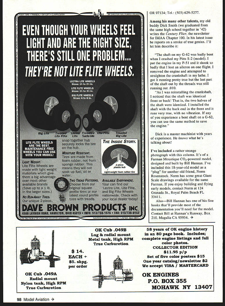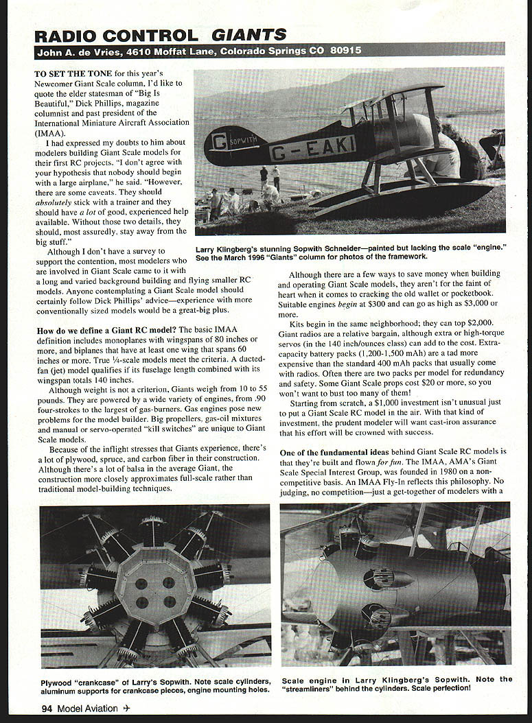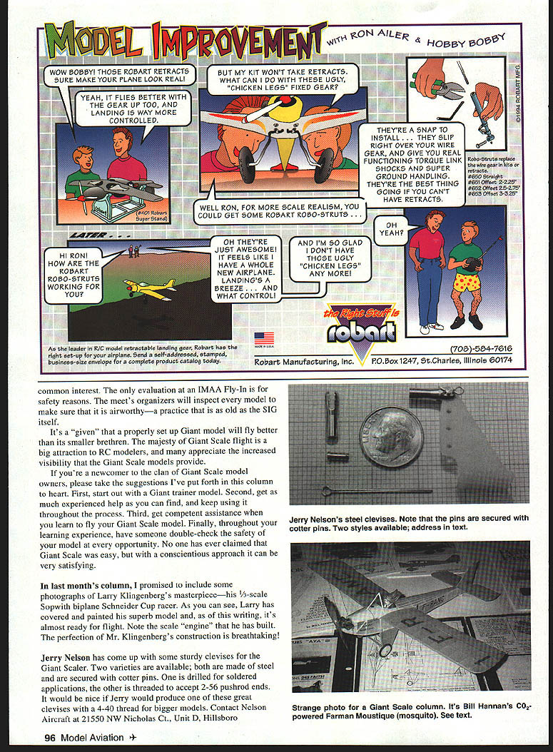 RADIO CONTROL GIANTS TO SET THE TONE years Newcomer Giant Scale column Id like quote elder statesman Big Beautiful Dick Phillips magazine columnist past president International Miniature Aircraft Association IMAA expressed doubts him about modelers building Giant Scale models first RC projects dont agree hypothesis nobody should begin large airplane said However some caveats should absolutely stick trainer should have lot good experienced help available Without two details should assuredly stay away big stuff Although dont have survey support contention modelers involved Giant Scale came long varied background building flying smaller RC models Anyone contemplating Giant Scale model should certainly follow Dick Phillips adviceexperience conventionally sized models would great-big plus define Giant RC model basic JMAA definition includes monoplanes wingspans 80 inches biplanes have least wing spans 60 inches True -scale models meet criteria ducted fan jet model qualifies its fuselage length combined its wingspan totals 140 inches Although weight criterion Giants weigh 10 55 pounds powered wide variety engines 90 four-strokes largest gas-burners Gas engines pose new problems model builder Big propellers gas-oil mixtures manual servo-operated kill switches unique Giant Scale models Because inflight stresses Giants experience theres lot plywood spruce carbon fiber construction Although theres lot balsa average Giant construction closely approximates full-scale rather traditional model-building techniques Although few ways save money building operating Giant Scale models arent faint heart comes cracking old wallet pocketbook Suitable engines begin $300 can go high $3000 Kits begin same neighborhood can top $2000 Giant radios relative bargain although extra high-torque servos 140 inch/ounces class can add cost Extracapacity battery packs 1200-1500 mAh tad expensive standard 400 mAh packs usually come radios Often two packs per model redundancy safety Some Giant Scale props cost $20 wont want bust too Starting scratch $1000 investment isnt unusual just put Giant Scale RC model air kind investment prudent modeler will want cast-iron assurance effort will crowned success fundamental ideas behind Giant Scale RC models theyre built flown fun IMAA AMAs Giant Scale Special Interest Group founded 1980 noncompetitive basis An IMAA Fly-In reflects philosophy No judging no competitionjust get-together modelers 94 Model Aviation y Klingbergs stunning Sopwith Schneiderpainted lacking scale engine See March 1996 Giants column photos framework Plywood crankcase Larrys Sopwith Note scale cylinders Scale engine Larry Klingbergs Sopwith Note aluminum supports crankcase pieces engine mounting holes streamliners behind cylinders Scale perfection common interest evaluation IMAA Fly-In safety reasons meets organizers will inspect model make sure airworthya practice old SIG itself Its given properly set up Giant model will fly better its smaller brethren majesty Giant Scale flight big attraction RC modelers appreciate increased visibility Giant Scale models provide youre newcomer clan Giant Scale model owners please take suggestions Ive put forth column heart First start out Giant trainer model Second get much experienced help can find keep using throughout process Third get competent assistance learn fly Giant Scale model Finally throughout learning experience have someone double-check safety model opportunity No has ever claimed Giant Scale easy conscientious approach can very satisfying last months column promised include some photographs Larry Klingenberg s masterpiecehis 1A-scale Sopwith biplane Schneider Cup racer As can see Larry has covered painted superb model writing its almost ready flight Note scale engine has built perfection Mr Klingenbergs construction breathtaking Jerry Nelson has come up some sturdy devises Giant Scaler Two varieties available both made steel secured cotter pins drilled soldered applications other threaded accept 2-56 pushrod ends would nice Jerry would produce great devises 4-40 thread bigger models Contact Nelson Aircraft 21550 NW Nicholas Ct Unit D Hillsboro ON AIL L HOY odel Aviation RON FOR MORE SCALE REALISM YOU COULD GET SOME ROBART ROO-STRUTS . OH V O GLAD JUST AWESOME DONT HAVE IT FEELS LIKE THOSE UGLY HAVE WHOLE~CHICKEN LEGS~ NEW AIRILANEII MOREI LANDINGS 8REEZE. AND WHAT CONTROL RoLart Manufacturing Inc FOox 1247 StCharles Illinois 60174 Jerry Nelsons steel devises Note pins secured cotter pins Two styles available address text Strange photo Giant Scale column Its Bill Hannans C02powered Farman Moustique mosquito See text OR 97124 Tel 503 629-5277 Among other talents old buddy Dick Smith graduated same high school together 42 writes Century Flier newsletter IMAA Chapter 100 latest issue reports stroke true genius Ill let him describe shaft G-62 badly bent crashed Pitts S-2 model put engine P-Si shook badly lost aileron flight removed engine attempted straighten crankshaft lathe got running pretty true last part shaft out threads still running out 0 10 As reinstalling crankshaft noticed shaft identical front back two halves shaft identical installed shaft back end front runs very true no vibration experience bent shaft G-62 can use same method save engine Dick master machinist years experience knows what hes talking about Ive included rather strange photograph column Its Farman Moustique C02-powered model designed built Bill Hannan Ive included 18-year-old model plug another old friend Norm Rosenstock Norm has some great Giant Scale drawings available same Farman enjoy building flying early models contact Norm 124 Granada St Royal Palm Beach FL 33411 AlsoBill Hannan has fine books thatll provide documentation youll need model Contact Bill Hannans Runway Box 210 Magalia CA 95954 EACH shpg per order OK Cub 049A Radial mount Nylon tank High RPM True Carburetion 58 years OK engine history 80 page book Includes complete engine listings full color photos COLLECTOR EDITION $1195 p