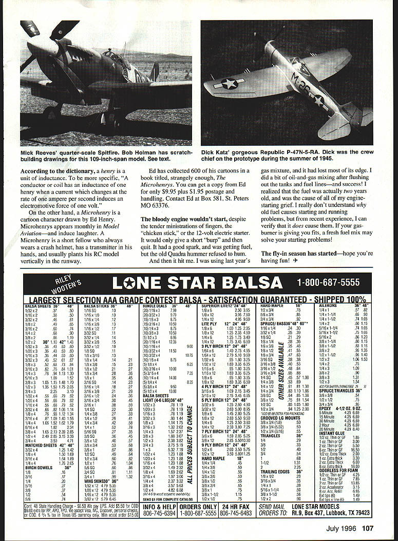 RADIO CONTROL GIANTS WHILE BACK complained beginning Giant Scale modeler little choice came suitable first modeling subjects field easily built models pretty well limited ubiquitous J-3 Cub course lot other high-winged full-scale model subjects gentle flight characteristics construction drawings conspicuous absence net result exercise heck lot yellow airplanes Giant Scale flightlines around world Jerry Bates rescue Mobile Alabama master draftsman has come up entire series eminently suitable Giant Scale plans based 1939 Interstate Cadet Theyre answer yellowing flightlines three quarter-scale versions original 1939 SlA Interstate Cadet 107-inch wingspan SiBi Interstate L-6 WW II observation/liaison aircraft big greenhouse Arctic Tern S1B2 referred ultimate bush plane drawings $30 Epoxy glass cowlings available $40 Fiberglass wheel pants available SlA $1750 90 four-stroke Zenoah G-23 recommended Interstate series Jerry generates plans computer stunaing includes appropriate construction manual plan order address 102 Glenwood St Mobile AL 36606 would prefer build kit uses Jerrys designs including warbirds theyre available Doug McMillian s All-American Kit Cutters companys address 365 Dutch Neck Road Hightstown NJ 08520 Tel 609 443-3175 Jerry must same frequency back suggested Bellanca Skyrocket would make doozer beginners Giant Scale model also suggested great start Bellanca model would superb GJ Alaback three-views published old friend Bill Hannan slim volume Model Plans & 3-Views International Actually Jerry way ahead used GJs drawings develop 1/5-scnle model aircraft 1/5 scale model has 109-inch wing 120 four-stroke makes suitable power plant Actually Jerrys drawings can used duplicate either civilian CH-400 Bellanca Skyrocket Special Navy/Marine RE-3 Fiberglass cowlings available either incamation Plans $35 long cowling $3750 short-ring cowling $22 Ive seen reduced versions Bellanca drawings theyre certainly up Jerrys standards Happily Bill Hannans book would go long way toward documenting Giant Scale model competitionminded Contact Bill Hannans Hangar Box 210 Magalia CA 95954 youre beyond newcomer stage Giant Scale models have interest building truly magnificent Supermarine Spitfire model Bob Holman offering Mick Reeves quarter-scale plans Spitfire Mk IX addition drawings Bob also has fiberglass cowlings spinners 109-inch-span WW II fighter drawings available $49 plus $3 postage handling Contact Bob Box 741 San Bernardino CA 92402 file data about Bell Airacuda thickened considerably addition magazine color photo Dick Katz Charlotte North Carolina Dick visions designing model XFM- 1 found several other Scale RC projects commanded attention info Dick supplied included some great cockpit photos well shots detail exterior twin-engine fighters nacelles Im still thrashing engineering problems posed need propeller drive extensions nose gear has sweep through 1200 retracts Thanks information Dick havent noticed old friend Bill Effinger has new address Bill WE Technical Services Inc can contacted 3206 E Post Woods Drive Atlanta GA 30339 Bill offers 64 Plan N Pattern sets everything RC-assisted free flight airplanes ducted-fan models catalog includes several desirable Giant Scale designs WW model drawings fans racing aircraft Bills next Plan N Pattern model will 1A-scale version Laird Super Solution Its biplane drawings should available before column appears Paul Matt drawings Williams Bros A2-scale plastic kit available documentation latest letter Bill indicated future efforts will devoted models powered 65-sized smaller engines Hes abandoning Giant Scale will choose designs wont require moreexpensive larger engines power 106 Model Aviation y Bates Arctic Tern series three Giant Scale models based Interstate Cadet Text has information partslplans availability Jerry Bates also has extensive line Giant Scale warbirds Douglas SBD built Jerrys plans Mike Montalban Mobile AL Wingspan 85 inches Mick Reeves quarter-scale Spitfire Bob Holman has scratch- Dick Katz gorgeous Republic P-47N-5-RA Dick crew building drawings 109-inch-span model See text chief prototype during summer 1945 According dictionary herny a Ed has collected 600 cartoons unit inductance specific book titled strangely enough conductor coil has inductance Microhenrys can get copy Ed henry current changes $995 plus $195 postage rate ampere per second induces handling Contact Ed Box 581 St Peters electromotive force volt MO 63376 other hand Microhenry cartoon character drawn Ed Henry Microhenrys appears monthly Model Aviationand induce laughter Microhenry short fellow always wears crash helmet has transmitter hands usually plants RC model vertically runway bloody engine wouldnt start despite tender ministrations fingers chicken stick 12-volt electric starter would give short burp quit good spark getting fuel old Quadra hummer refused hum hit using last years gas mixture lost its edge did bit oil-and-gas mixing after flushing out tanks fuel linesand success realized fuel actually two years old cause of enginestarting grief really dont understand old fuel causes starting running problems recent experience can verify does cause gasburner giving fits fresh fuel mix may solve starting problems fly-in season has startedhope youre having fun 458 3650 4661 x24965 An6x26074 1/4626890 3/8x286119 1/2623011842143 1/32633643 5060 1/20 x 33643 5060 1/16633644 5060 3/32 x 34352 6167 1/Ox 35263 7384 3/16x36276 64101 1/4x37694113130 5/1663109152 3/Ox 3105115148170 1/2x3135150175205 3/4x3225310 1/32645666 7992 1/20x45666 7992 1/16 x 45668 7992 3/32 x 46682106114 1/8x47693112134 3/166487109149156 1/4x4106152162179 5/16 x 4182234 3/8x4165210239285 1/264249285315336 3/464350471 MATCHEDSHEETS4248 3/3264125142 1/8x4159169 3/16x4164189 1/464176205 BIRCH DOWELS 38 1/816 3/1617 1/420 5/1627 3/837 1/254 5/874 1/16 5010 1/16x1/810 1/1661/412 1/1663/813 1/16x 1/217 3/325011 3/32x1/414 3/32x3/815 3/32x1/219 1/85011 1/8x3/1613 1/8x1/414 1/863/815 1/8x1/221 1/863/428 1/
