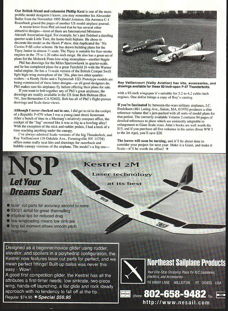 RADIO CONTROL GIANTS q r1 ii mwW WITH YOUR KIND INDULGENCE Im going begin months column fairy story Like good fairy stories begins Once upon time . Once upon time poor-but-honest Radio Control builder flier building small but-flyable Scale models basement workshop evening after supper would descend stairs shop begin tinker balsa plywood other magical materials time time skillful efforts would realized beautiful multicolored model airplane complete glow-plug engine complex array electronic equipment Saturday afternoons weather fair wind hinting zephyr hed take beautiful airplane out club field After checking radio filling gas tank glow fuel hed entrust current masterpiece mercy air Most time model would fly give him much pleasure bent through routine aerobatics Alas however poor-but-honest model airplane builder flier began feel effects age eyes reactions dimmed slowed difficulty keeping track beautiful Scale models air Woe lamented hero Whatever can maintain flying pleasures came himhe would build bigger Scale models would easier see would also fly slowly Unfortunately one-time model engine powerhouses proved woefully inadequate Giant model Taylor Cub building Once again inspirationthis time trimming trees backyard Theres nothing says can t remove gasoline-powered engine chain saw adapt big Cub did First removed extraneous bits pieces chain-saw engine wouldnt contribute working airplane power plant called machining skills adapted engine turn big propeller find gas tank fuel lines wouldnt affected gas/oil mixture engine required concerned effects engines ignition system operation radio faced engine compartment flat piece aluminum shielded chain saws high-tension spark-plug lead bit copper screening Wonder wonders Giant Scale Cub flew ease real airplane Nice slow soared Saturday afternoon sun hero could keep track aging eyes able keep big model sight easily happy man price chain sawless $90he reliable power plant would motivate Giant Scale models story doesnt quite end Some very clever Canadians heard heros magical engine transformation reasoned should Giant Scale model builders have buy chain saw throw away useless bits pieces order make suitable Giant model airplane engine Well buy chain-saw engines manufacturer modify model aircraft use production-line basis did hero able buy airplane-ready engine power second Giant Scaler very reasonable $85 Remember fairy story Soon others saw trend larger-and-larger radio controlled models decided get gasolinepowered model engine business used everything small weed-trimmer engines massive hummers biggest chain saws converted engines intended snowmobiles model airplanes almost big enough builders get fly fairy story starts unravel new engine converters soon became overly enthusiastic came pricing engines Inflation effects currency value fluctuations between countries jlayed big part much charged big model engines hero story soon found $1000 engines way too expensive modeling budget least-expensive engines airplanes $300 So what did hero went neighborhood hardware store purchased simple gas-powered weed whacker retired basement workshop took out tools once againand made himself engine $7395 plus sales tax labor moral story Its good idea take shop high school least learn machining skills want minimize cost Giant Scale models Philip Kents version Tipsy Junior almost-1/a-scale Charles Lindbergh flew full-scale Mohawk Pinto thought model uses engines 75- 120-cubic-inch range great airplane Philip Kents model flies just well October1996 83 Philip Kents 1/4-scaIe Little Toot finished Hawk Pshaw colors full-scale home-built aerobatic capabilities British friend columnist Phillip Kent mostprolific model designers know may remember Alexander Bullet November 1995 Model Aviation Aeronca C-I Razorback graced pages another US model airplane journal recent letter Phil advised has several other attractive designsmost International Miniature Aircraft Association-legal example hes just finished dazzling quarter-scale Little Toot home-built biplane chose decorate model Hawk Pshaw duplicated 30s Curtiss P-6E color scheme has drawn building plans Tipsy Junior almost- scale Tipsy suitable four-stroke engines 75 120 cubic-inch range also has great set plans Mohawk Pinto low-wing monoplaneanother biggie Phil has drawings Miles Sparrowhawk quarter-scale has completed plans great Fairchild 24 Warner radial engine has A-scale version British Comper Swift light high-wing monoplane 30s plus two other quarterscalersa Hendy Hobo Taylorcraft 12D Prototype models being constructed latter designsas good designers Phil makes sure airplanes fly before offering plans sale want bolt together Phils great airplanes drawings readily available US Bob Holman Box 741 San Bernardino CA 92402 Bob has Phils flight-proven drawings Scale three-views Although never checked out did get sit cockpit Republic P-47N young short lieutenant After bunch time Mustangs relatively compact office cockpit Jug seemed like big bowling alley exception stick rudder pedals heck time reaching anything under canopy Ive always admired Scale versions big Thunderbolt Roy Vaillancourt 18 Oakdale Ave Farmingville NY 11738 offers some really neat kits drawings razorback bubble-canopy versions airplane models big 92-inch wingspan its suitable 32 42 cubic-inch engines dollar brings copy Roys catalog youre fascinated between-the-wars military airplanes JC Fredriksen 461 Loring Ave Salem MA 01970 produces slim reference volume thats jam-packed sorts model plans period currently available Volume 2 contains 94 pages detailed references plans eminently adaptable enlargement Giant Scale sizes Johns books well worth $15 purchase five volumes series WW Jet Age youll save $20 leaves will soon turning itll about time consider project next year Make Giant make Scaleitll worth effort Vaillancourt Vailly Aviation has kits accessories drawings available 92-inch-span P-47 Thunderbolts