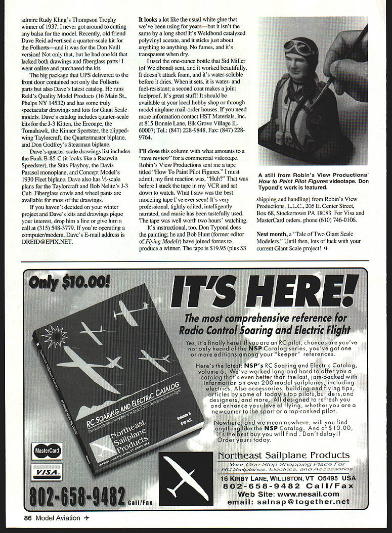 RADIO CONTROL GIANTS IN THE JANUARY 1989 Model Aviation colunm featured outstanding design work Charles Fowler Annapolis Maryland Charles devised clever system operating Fowler flaps Scale model aircraft mechanism designed used Giant Scale Lockheed P-38 Although Charles related Fowler invented flap system full-sized aircraft Charles solved problems associated applying models Fowler flaps particularly effectivein addition slowing aircraft its landing approach provide increased wing area provide additional lift well drag lowered angles up 400 aerodynamically efficient simple split flaps Building Mr Fowlers work Robert McDaniel Bowie Maryland designed constructed low-wing sport model single Fowler flap stretches beneath fuselage Robert calls design Viper model has fixed slots aft wings leading edge wingtip oaly single surface move Fowler flap mechanism has materially simplified Unlike Mr Fowlers design Mr McDaniels design doesnt require component soldering uses epoxy anchor mechanism Theyre operated single flap servo Bob sent videotape Viper flight sure eye-opener airplane very maneuverable true wonder its performance shows up its final landing approach Fowler flap deployed airplane comes down like elevator top landing run-out six-to-ten feet flap test flights conducted 900 days winds ranging 8 12 miles per hour flap airplanes 70inch wing 18 inches long 3 inches wide latter figure 25% 13-inch chord Mr McDaniel congratulated stunning design work us have seen flying venetian blind aircraft TV Shots weird wonderful aircraft feature its demise collapses pile wings Few us know Cycleplane designed William Fred Gerhardt 1923 actually flew seven-winged aircraft towed air automobile seemed relatively stable intended man-powered aircraft included bicycle mechanism turned propeller As originally constructed Cycleplanes wings spanned 40 feet a wing spars leading edges covered tough Japanese paper 1/s-scale version craft would International Miniature Aircraft Association JIvIAA legal Old friend Bill Hannan researched Cycleplane has produced set three-views latest bookthe second Plans & 3-Views International series As usual Bill includes several other three-views eminently suitable enlargement Giant Scale sizes Curtiss-Wright Technical Institutes Bunting 1 would make great Giant would Avro Avian Tipsy S2 book really adventurous Bill includes several scale drawings autogiros Write Bill Hannans Runway Box 210 Magalia CA 95954 book $1095 plus $250 shipping handling ago purchased set Don Neills Folkerts SK-3 -scale plans fiberglass parts went Although really February 1997 85 Robert McDaniels 70-inch-span Viper model equipped slots Fowler flap design Very maneuverable Partially extended Fowler flap Robert McDaniels Viper Note increases wing area Operated single flap servo bit extension McDaniels Fowler flap really slows Viper its landing approach Short run-out too Note outboard pushrods move McDaniels Fowler flap aft inboard rod causes flap lower admire Rudy Klings Thompson Trophy winner 19371 never got around cutting balsa model Recently old friend Dave Reid advertised quarter-scale kit Folkertsand Don Neill version kit lacked both drawings fiberglass parts went online purchased kit big package UPS delivered front door contained Folkerts parts also Daves latest catalog runs Reids Quality Model Products 16 Maln St Phelps NY 14532 has some truly spectacular drawings kits Giant Scale models Daves catalog includes quarter-scale kits J-3 Kitten Ercoupe Tomahawk Kinner Sportster clippedwing Taylorcraft Quartermaster biplane Don Godfreys Stearman biplane Daves quarter-scale drawings list includes Funk B-85-C looks like Rearwin Speedster Stits Playboy Davis Parasol monoplane Concept Models 1930 Fleet biplane Dave also has A-scale plans Taylorcraft Bob Nelitzs J-3 Cub Fiberglass cowls wheel pants available drawings havent decided winter project Daves kits drawings pique interest drop him line give him call 315 548-3779 youre operating computer/modem Daves E-mail address DREID@EPIXNET looks lot like usual white glue weve using yearsbut isnt same long shot Its Weldbond catalyzed polyvinyl acetate sticks just about anything anything No fumes its transparent dry used one-ounce bottle Sid Miller Weldbond sent worked beautifully doesnt attack foam its water-soluble before dries sets water- fuel-resistant second coat makes joint fuelproof Its great staff should available local hobby shop through model airplane mail-order houses need information contact HST Materials Inc 815 Bonnie Lane Elk Grove Village IL 60007 Tel 847 228-9848 Fax 847 2289764 Ill close column what amounts rave review commercial videotape Robins View Productions sent tape titled Paint Pilot Figures must admit first reaction Huh before stack tape VCR sat down watch What saw best modeling tape Ive ever seen Its very professional tightly edited intelligently narrated music has tastefully used tape well worth two hours watching Its instructional too Don Typond does painting Bob Hunt former editor Flying Models have joined forces produce winner tape $1995 plus $3 shipping handling Robins View Productions LLC 205 E Center Street Box 68 Stockertown PA 18083 Visa MasterCard orders phone 610 746-0106 Next month Tale Two Giant Scale Modelers Until lots luck current Giant Scale project odel Aviation l Robins View Productions Paint Pilot Figures videotape Don Typonds work featured ean nowhere will find SP Catalog $1000 will find delayll day