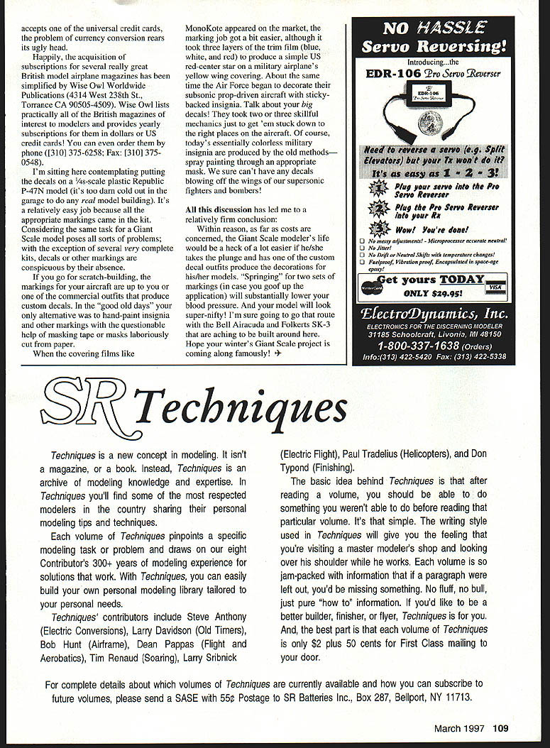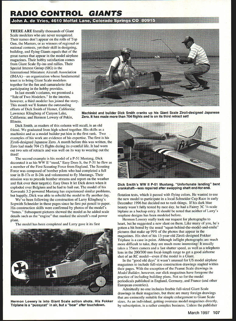 RADIO CONTROL GIANTS rIJIIIwuL-u FU. THERE ARE literally thousands Giant Scale modelers never recognized names dont appear rolls Top Gun Masters winners regional national contests yet skill designing building flying Giants equals great names appear model airplane magazines hobby satisfaction comes Giant Scale fly-ins rallies Special Interest Group SIG International Miniature Aircraft Association IMAAan organization fundamental tenet bring Giant Scale modelers together fun camaraderie participating hobby provides last months column promised Tale Two Modelers interim however third modeler has joined story month well feature outstanding efforts Dick Smith Hemet California Lawrence Klingberg Canyon Lake California Hermon Lowery Pekin Illinois Dick Smith readers column will recall old friend graduated high school together skills machinist model builder put him first rank Two examples work evidence expertise first Ziroli-designed Japanese Zero month before written Zero made 704 hts during its eventful life worn out two sets retracts well its way wearing out third second example model P-5 1 Mustang Dick decorated WW II steed Easy Does P-5 1 flew member First Scouting Force England Scouting Force composed bomber pilots completed full tour B-17s B-24s volunteered fly Mustangs mission precede bomber streams report weather flak over targets Easy Does let Dick down exploded over Belgium bail out model Kawasaki 32-powered Mustang has experienced similar problems happily Dick able rebuild model fly another day Weve following construction Larry Klingbergs Sopwith Schneider pages since first put pencil paper construction skills confirmed photos models bones Subsequent pictures showed model added scale details such engine masked aircrafts real power plant model has completed Larry gave its first flotation tests passed flying colors wanted use new model participate local Schneider Cup Race early December 1996 decided rush things dark blue beauty wasnt fully tested race day Fairey 3C -scale biplane backup entry should noted neither Larrys seaplane designs has modeled before Hermon Lowery really took request photographs heart suggested new slant Like hes gotten bit bored usual squat-behind-the-model-and-smile pictures make up 99% photos appear magazines shot 13-year-old Ziroli-designed Fokker Triplane case point Although inflight photographs much difficult take much interesting usually takes 35mm camera fast shutter speed well telephoto lens 200/300 mm focal-length range get good airborne shot RC modeleven model Giant good old days wasnt unusual US model airplane magazines include full-size construction drawings stapled within pages exception Peanut Scale drawings Model Builder however slick magazines have foregone practice including building plans model periodicals published England Germany France other European countries Admittedly no includes freebie full-sized Giant Scale drawings magazines foreign drawings eminently suitable simple enlargement Giant Scale sizes As individual getting overseas model magazines directly subscription rather complex business Unless publisher March 1997 107 Machinist builder Dick Smith cranks up Giant Scale Ziroli-designed Japanese Zero has made 704 flights its third retract set Dick Smiths WW II P-51 Mustang Unfortunate landing bent crankshaftwas repaired after swapping shaft end-for-end Hermon Lowery Giant Scale action shots Fokker Triplane pussycat air bear after touchdown accepts universal credit cards problem currency conversion rears its ugly head Happily acquisition subscriptions several really great British model airplane magazines has simplified Wise Owl Worldwide Publications 4314 West 23 8th St Torrance CA 90505-4509 Wise Owl lists practically British magazines interest modelers provides yearly subscriptions dollars US credit cards can order phone [310] 375-6258 Fax [310] 3750548 Im sitting contemplating putting decals s-scale plastic Republic P-47N model its too darn cold out garage real model building Its relatively easy job because appropriate markings came kit Considering same task Giant Scale model poses sorts problems exception several very complete kits decals other markings conspicuous absence go scratch-building markings aircraft up commercial outfits produce custom decals good old days alternative hand-paint insignia other markings questionable help masking tape masks laboriously cut paper covering films like MonoKote appeared market marking job got bit easier although took three layers trim film blue white red produce simple US red-center star military airplanes yellow wing covering About same time Air Force began decorate subsonic prop-driven aircraft stickybacked insignia Talk about big decals took two three skillful mechanics just get em stuck down right places aircraft course todays essentially colorless military insignia produced old methods spray painting through appropriate mask sure cant have decals blowing off wings supersonic fighters bombers discussion has led relatively firm conclusion Within reason far costs concerned Giant Scale modelers life would heck lot easier he/she takes plunge has custom decal outfits produce decorations his/her models Springing two sets markings case goof up application will substantially lower blood pressure model will look super-nifty Im sure going go route Bell Airacuda Folkerts SK-3 aching built around Hope winters Giant Scale project coming along famously niques Techniques new concept modeling isnt magazine book Instead Techniques archive modeling knowledge expertise Techniques youll find some respected modelers country sharing personal modeling tips techniques volume Techniques pinpoints specific modeling task problem draws eight Contributors 300 years modeling experience solutions work Techniques can easily build own personal modeling library tailored personal needs Techniques contributors include Steve Anthony Electric Conversions Larry Davidson Old Timers Bob Hunt Airframe Dean Pappas Flight Aerobatics Tim 