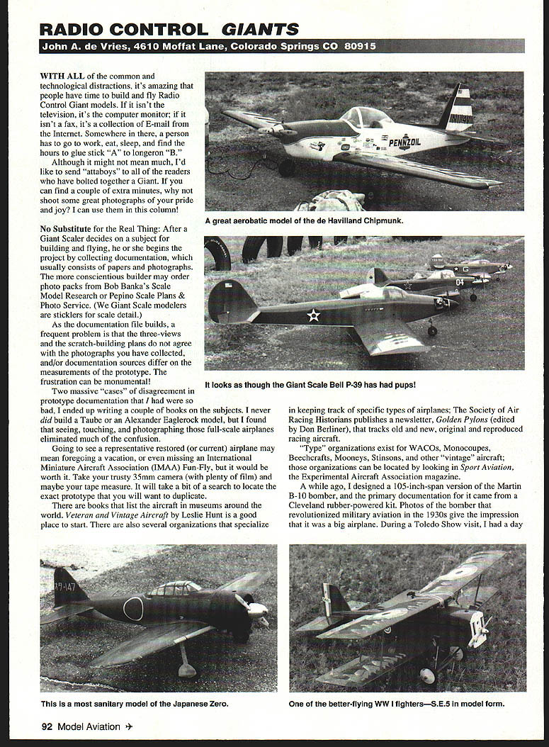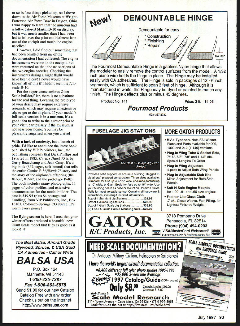 RADIO CONTROL GIANTS W IS] II WITH ALL common technological distractions its amazing people have time build fly Radio Control Giant models isnt television its computer monitor isnt fax its collection E-mail Internet Somewhere person has go work eat sleep find hours glue stick longeron B Although might mean much Id like send attaboys readers have bolted together Giant can find couple extra minutes shoot some great photographs pride joy can use column No Substitute Real Thing After Giant Scaler decides subject building flying begins project collecting documentation usually consists papers photographs conscientious builder may order photo packs Bob Bankas Scale Model Research Pepino Scale Plans & Photo Service Giant Scale modelers sticklers scale detail As documentation file builds frequent problem three-views scratch-building plans agree photographs have collected and/or documentation sources differ measurements prototype frustration can monumental Two massive cases disagreement prototype documentation bad ended up writing couple books subjects never did build Taube Alexander Eaglerock model found seeing touching photographing full-scale airplanes eliminated much confusion Going see representative restored current airplane may mean foregGing vacation missing International Miniature Aircraft Association IMAA Fun-Fly would worth Take trusty 35mm camera plenty film maybe tape measure will take bit search locate exact prototype will want duplicate books list aircraft museums around world Veteran Vintage Aircraft Leslie Hunt good place start also several organizations specialize keeping track specific types airplanes Society Air Racing Historians publishes newsletter Golden Pylons edited Don Berliner tracks old new original reproduced racing aircraft Type organizations exist WACOs Monocoupes Beechcrafts Mooneys Stinsons other vintage aircraft organizations can located looking Sport Aviation Experimental Aircraft Association magazine ago designed 105-inch-span version Martin B-b bomber primary documentation came Cleveland rubber-powered kit Photos bomber revolutionized military aviation 1930s give impression big airplane During Toledo Show visit day 92 Model Aviation t aerobatic model de Havilland Chipmunk looks though Giant Scale Bell P-39 has pups sanitary model Japanese Zero better-flying WW fightersSE5 model form before things picked up drove down Air Force Museum WrightPatterson Air Force Base Dayton Ohio happy learn museum fully-restored Martin B-b display much smaller led believe pilot could almost lean out cockpit touch engine nacelles However did find out something omitted documentation collected engine instruments cockpit mounted inboard sections two engine nacelles Checking instruments during night flight would have dicey never would have known hadnt seen fullscale B-b super-conscientious Giant Scale builder/flier no substitute real thing Locating prototype desire may require extensive research may require extensive trip get airplane models full-scale version museum its good idea write curator prior visit particularly museum near home may pleasantly surprised arrive lack modesty bunch pride Id like announce latest book published ViP Publishers Inc publishing company Dick Phillips started 1985 Curtiss Hawk 75 Gerry Beauchamp Jean Cuny Its big book 352 pages soft-bound tells entire Curtiss P-36/Hawk 75 story story airplanes offspring XP-37 XP-42 prototype P-40 book includes photographs 11 pages color profiles extensive documentation model builder cost $4995 plus $4 postage handling ViP Publishers Inc Box 16103 Colorado Springs CO 80935 Its worth penny flying season trust winter efforts produced beautiful new Giant Scale model flies good looks MOUNTABLE HINGE Demountable easy *Construction *Finishing Fourmost Demountable Hinge gapless Nylon hinge allows modeler easily remove control surfaces model 1/32 inch piano wire holds hinge place Hinge may installed easily CA adhesives Hinge sold packages 12 6 inch segments sufficient span 3 feet hinge Although manufactured white Hinge may dyed painted match finish Hinge deflects plus minus 45 degrees Product No 141 Fourmost Products 503 357-2732 FIJSELAOE JIA STATIONS MORE GATOR PRODUCTS Provides solid support accurate building Rugged 7ply aircraft plywood construction Three sizes available Standard fuse up 7-1/2 wide Jumbo fuse up 10, wide Giant Scale fuse up 15 wide Use building board base mount Uni-Strut Guide Rails versatile set-up contains hardware & instructions including Uni-Strut inlormation Box 4 Standard Jig Stations $2195 Box 4 Jumbo Jig Stations 2395 Box 4 Giant Scale Jig Stations $3895 2 Five Ft Guide Rails & Mounting Nuts.$2295 MV-i Typhoon Nats FAI winner Plans Parts available 909 1000 22 1140 versions Plug-in Wing Tube & Socket Sets 7/16 5/8 7/8 1-1/2 dia Special Lengths Order Plug-in Wing Adjusters 4-pack Adjust Both Wing Panels Plug-in Adjustable Stab Kits Micro-Adjustment Both Stab Panels Soft-N-Safe Engine Mounts 120 91 60 size engines Feather Lite Glass Cloth lose weave Fast Filling Lightest Finished Weight 3713 Pompano Drive Pensacola FL 32514 GATORPhone 904 494-0203 RIC Products Inc lMasterCard Welcomed ____________________________________________ SCALE AIRCRAFT IA06 ________________________________________________ Ohio Antiques Military Civilian Helicopters Sailplanes have worlds largest aircraft documentation collection 6 400 different full color photo studies 1905-1996 Q 35000 3-view line drawings 1997 Catalog/Guide 200 pages Canada/Mexico $1000 Bob Bankas Only $8w Overseas $15 00 Scale Model Research 3114 Yukon Avenue a Mesa CA 92626 714 979-8a58 Look us net http//imfnet/ims/scalehfml Price 3 ft $495 July1997 93 Best Balsa Aircraft Grade Plywood Spruce & USA Gold CA Adhesives Call Write BALSA USA PO Box 164 Marinette WI 54143 1-800-225-7287 Fax 1-906-863-5878 Send $100 new Catalog Catalog Free order Check us out Internet http//wwwbalsausacom [ Simply fill helium available local discount department party supply stores mou