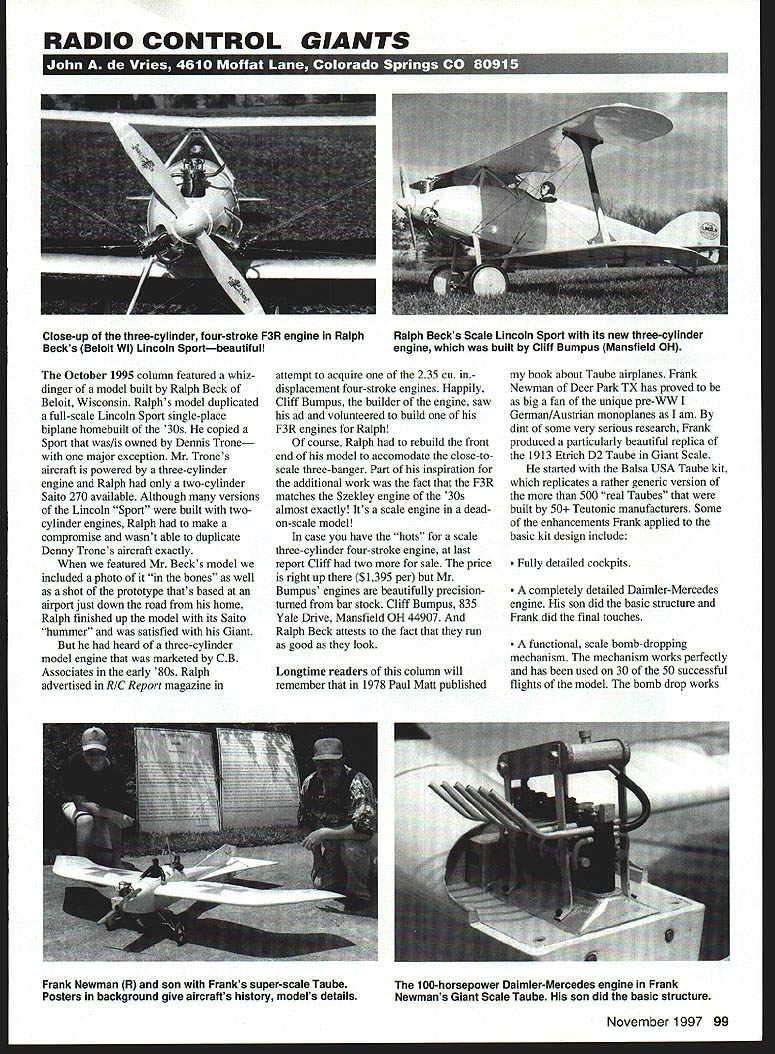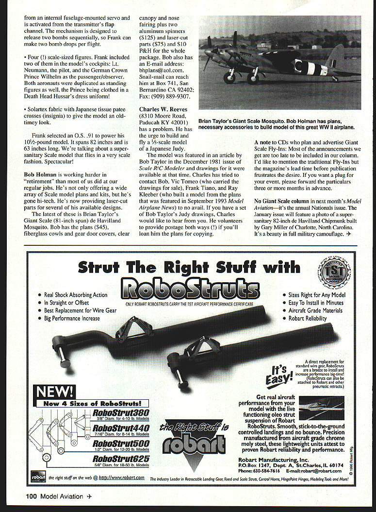 RADIO CONTROL GIANTS tober 1995 column featured whiz dinger model built Ralph Beck Beloit Wisconsin Ralphs model duplicated full-scale Lincoln Sport single-place biplane homebuilt 30s copied Sport was/is owned Dennis Trone major exception Mr Trones aircraft powered three-cylinder engine Ralph two-cylinder Saito 270 available Although versions Lincoln Sport built twocylinder engines Ralph make compromise wasnt able duplicate Denny Trones aircraft exactly featured Mr Becks model included photo bones well shot prototype thats based airport just down road home Ralph finished up model its Saito hummer satisfied Giant heard three-cylinder model engine marketed CB Associates early 80s Ralph advertised RIC Report magazine attempt acquire 235 cu displacement four-stroke engines Happily Cliff Bumpus builder engine saw ad volunteered build F3R engines Ralph course Ralph rebuild front end model accomodate close-toscale three-banger Part inspiration additional work fact F3R matches Szeldey engine 30s almost exactly Its scale engine deadon-scale model case have hots scale three-cylinder four-stroke engine last report Cliff two sale price right up $1395 per Mr Bumpus engines beautifully precisionturned bar stock Cliff Bumpus 835 Yale Drive Mansfield OH 44907 Ralph Beck attests fact run good look Longtime readers column will remember 1978 Paul Matt published book about Taube airplanes Frank Newman Deer Park TX has proved big fan unique pre-WW German/Austrian monoplanes am dint some very serious research Frank produced particularly beautiful replica 1913 Etrich D2 Taube Giant Scale started Balsa USA Taube kit replicates rather generic version 500 real Taubes built 50 Teutonic manufacturers Some enhancements Frank applied basic kit design include Fully detailed cockpits completely detailed Daimler-Mercedes engine son did basic structure Frank did final touches functional scale bomb-dropping mechanism mechanism works perfectly has used 30 50 successful flights model bomb drop works November1997 99 Close-up three-cylinder four-stroke F3R engine RalphRalph Becks Scale Lincoln Sport its new three-cylinder Becks Beloit WI Lincoln Sportbeautifulengine built Cliff Bumpus Mansfield OH Frank Newman R son Franks super-scale TaubeThe 100-horsepower Daimler-Mercedes engine Frank Posters background give aircrafts history models detailsNewmans Giant Scale Taube son did basic structure internal fuselage-mounted servo activated transmitters flap channel mechanism designed release two bombs sequentially Frank can make two bomb drops per flight Four e-sized figures Frank included two models cockpits Lt Neumann pilot German Crown Prince Wilhelm passenger/observer Both aeronauts duplicated standing figures well Prince being clothed Death Head Hussars dress uniform Solartex fabric Japanese tissue patee crosses insignia give model old timey look Frank selected OS 91 power 10-pound model spans 82 inches 63 inches long talking about supersanitary Scale model flies very scale fashion Spectacular Bob Holman working harder retirement us did regular jobs Hes offering wide array Scale model plans kits hes gone hi-tech Hes now providing laser-cut parts several available designs latest Brian Taytors Giant Scale 81-inch span de Havilland Mosquito Bob has plans $45 fiberglass cowls gear door covers clear canopy nose fairing plus two aluminum spinners $125 laser-cut parts $75 $10 P&H whole package Bob also has E-mail address bhplans@aolcom Snail-mail can reach him Box 741 San Bernardino CA 92402 Fax 909 889-9307 Charles W Reeves 8310 Moore Road Paducah KY 42001 has problem has urge build fly 1/5-scale model Japanese Judy model featured article Bob Taylor December 1981 issue Scale RIC Modeler drawings available time Charles has tried contact Bob Vic Tomeo carried drawings sale Frank Tiano Ray Kleeber built model plans featured September 1993 Model Airplane News no avail have set Bob Taylors Judy drawings Charles would like hear volunteers provide postage both ways l loan him plans copying note CDs plan advertise Giant Scale Fly-Ins Most announcements get too late included column Id like mention traditional Fly-Ins magazines lead time before publication frustrates desire want plug event please forward particulars three months advance No Giant Scale column next months Model Aviationits annual Nationals issue January issue will feature photo supersanitary 82-inch de Havilland Chipmunk built Gary Miller Charlotte North Carolina Its beauty full military camouflage Model Aviation n Taylors Giant Scale Mosquito Bob Holman has plans necessary accessories build model great WW II airplane Real Shock Absorbing Action ____________________________________________________ w w w w w Straight Offset ONLY ROBART ROBOSTRUTS CARRY THE TST AIRCRAFT PERFORMANCE Best Replacement Wire Gear Big Performance Increase Sizes Right Any Model Easy Install Minutes Aircraft Grade Materials Robart Reliability Strut Right Stuff Robart Manufacturing Inc POBox 1247 Dept StCharles IL 60174 Phone 630-584-7616 E-mail robart@robartcom 0 right stuff web @ httfsIlwwwrobart corn Industry Leader Retractable landing Gear Fixed Scale Struts ConirnI Hams HingePoint Hinges Modeling Tools Morel Now 4 Sizes RobStrutsl t real aircraft performance model live Hobo5tut88Ofunctioning oleo strut suspension Robart RoboStruts Smooth stick-totheground Hohotrut44Ocontrolled Iandinfs no bounce Precision manufactured aircraft grade chrome Hobo Strut500moly steel lightweight units attest proven Robart reliability performance Robo8tutG25 iom f 185O lb Models