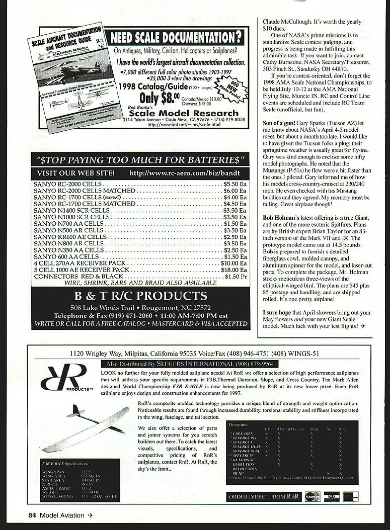 RADIO CONTROL GIANTS E9 11111Uj j m I1 I1 [1 d- r eUi 1 F.UPi5 BEAUTIFUL warm spring day Radio Control RC flying field Only couple models tracing filmy exhaust trails blue sky airplanes heads runway low pass scream engine grabs everyones attention model dives earthward happens As flier pulls model sharply out dive theres ominous craaakand wing folds up middle fuselage now bereft lift spears runway debris scattered everywhere Balsa plywood propeller spinner engine radio create long swath destruction Above half-wing flutters slowly earth Too Us gravity consensus modelers witnessed crash modeling population have possibly witnessed sort ugly end RC flight Too Us isnt whole story poorly braced wing center section might have waiting high-U pull-out maybe plywood dihedral braces werent sufficiently epoxied wing spars fiberglass scab over center section wing wasnt fully adhered wings planking Assuming earlier precise joining wing halves maybe things came apart because extended vibration after flights fuelsoaked joints may have decided enough enough Anyhow wing failed its most-stressed locationthe center section type wing construction probably sensitive center-section failure two foam sections butt-joined either plywood dihedral braces Most type wings strength relies fiberglass cloth wrapping center section fiberglass tape fixed place bath CyA cyanoacrylate glue resin epoxy Properly done fiberglassing wings center section holds things together pretty well its very important glue penetrates wing sheeting Wings conventional rib-and-spar construction usually much stronger particularly theyre sheeted balsa thin plywood foam-core wings usually dihedral braces can fully adhered spars before wing center section sheeted fiberglass scab adds additional strength leads interesting wing construction techniquethe composite wing build highly stressed center section conventionally add less-stressed outer wing panels using foam technique particularly attractive Uiant Scale subjects flat rectangular plan view wing middles other wing plans using conventional riband-spar construction outboard landing gear offers several advantages hardwood bearers retracts easier locate pressure hnes pushrods activation wont need pick little round bits foam out wing provide scale wheel wells multiengined models conventional construction just outboard engines facilitates mounting along throttle control runs maln upper lower wing spars extended wingtips slots cut foam wing ends monolithic wing can constructed Adding strip carbon fiber the spars will icing cake can pry JeeprM out mud such wing several interesting important Special Interest Uroups SIUs AIVIA belong two IMAA International Miniature Aircraft Association Ive since before began April 1980 13th member sign up other group found kindred spirits NASA National Association Scale Aeromodelers Johnny-comelately organization #577 Im glad Ijoined cutrent president Bob Underwood Scale competitor classic sense including several visits Scale Internats member US Scale team Cliff Tacie another longtime Scale expert editor Replica NASA newsletter included membership Cliffs bimonthly efforts well worth reading NASA membership also includes copy Scale Data Source List truly inspired publication kept up date May 1998 83 Former full-scale P-51 pilot Gary Sparks Tucson AZ Midwest AT-6 Power Giant VS 120 Another Gary Sparks modela Midwest 202 aerobatic monoplane Bob Holmans Brian Taylor-designed Spitfire Late version seems fascinated VS 120s power model British fighter has pointy rudder four-bladed prop 11 I4i lid 1 .I i [1 ntiques Militory Civilian Helicopters Soilpions hove worlds largest airauft documentation collection 7000 different full color photo studies 1903-1997 35000 3-view line drowings 1998/Guide 200 pages Catalog flY Canada/Mexico 510 00 14 OI$8 IOverseas $1500 Bob Bankas Scale Model Research 1 Yukon Avenue a Mesa CA 92626 714 979-8058 http Ilwww imt net/ms/scole html INTEWIwVADWE&LUWEWIWN&EWIWEWaWI&WiVAUWWiWJ SSS SANYO RC-2000 CELLS$550 Ea SANYO RC-2000 CELLS MATCHED$600 Ea SANYO RC-1700 CELLS new$400 Ea SANYO RC-1700 CELLS MATCHED$450 Ea SANYO N1400 SCR CELLS$350 Ea SANYO N1000 SCR CELLS$350 Ea SANYO N700AACELLS$150 Ea SANYO N500 AR CELLS$350 Ea SANYO KR600 AE CELLS$250 Ea SANYO N800 AR CELLS$350 Ea SANYO N350 AA CELLS$250 Ea SANYO 600 AACELLS$150 Ea 4 CELL 270AA RECEIVER PACK$1000 Ea 5 CELL 1000 AE RECEIVER PACK$1800 Ea CONNECTORS RED & BLACK$150 Pr WIRE SHRINK BARS AND BRAID ALSO AVAIL4BLE Claude McCullough Its worth yearly $10 dues NASAs prime missions standardize Scale contest judging progress being made fulfilling admirable task want join contact Cathy Burnstine NASA Secretary/Treasurer 303 Finch St Sandusky OH 44870 youre contest-oriented dont forget 1998 AMA Scale National Championships held July 10-12 AMA National Flying Site Muncie IN RC Control Line events scheduled include RC Team Scale unofficial fun Son gun Gary Sparks Tucson AZ let know about NASAs April 4-5 model meet about month too late would like have given Tucson folks plug springtime weather usually great fly-ins Gary kind enough enclose some nifty model photographs noted Mustangs P-5 ls flew bit faster ones piloted Gary informed models cross-country-cruised 230/240 mph checked Mustang buddies agreed memory must failing Great airplane though Bob Holnians latest offering true Giant esoteric Spitfires Plans British expert Brian Taylor 83inch version Mark VII IX prototype model came out 145 pounds Bob prepared fumish detailed fiberglass cowl molded canopy aluminum spinner model laser-cut parts complete package Mr Holman stocks meticulous three-views elliptical-winged bird plans $45 plus $5 postage handling shipped rolled Its pretty airplane sure hope April showers bring out May flowers new Giant Scale model Much luck test flights Wrigley Way Milpitas California 95035 Voice/Fax 408 946-4751 408 WINGS-SI LOOK no further fully molded sailplane needs RnR offer selection high performance sailplanes will address speci