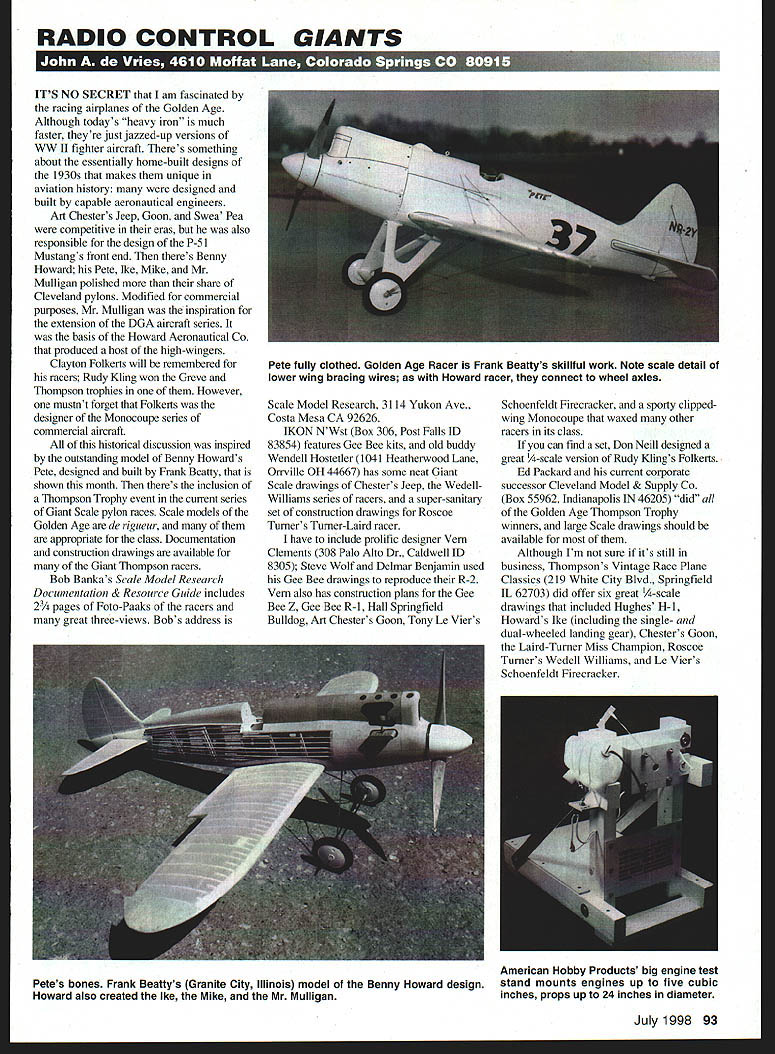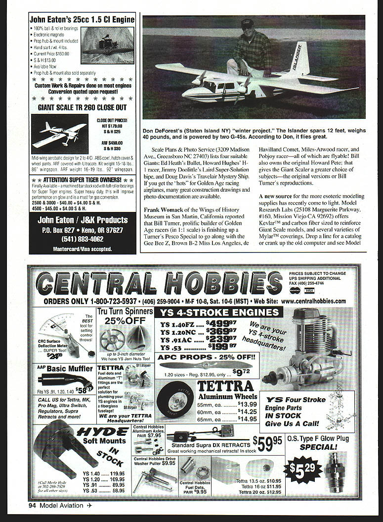 RADIO CONTROL GIANTS ITS NO SECRET am fascinated racing airplanes Golden Age Although todays heavy iron much faster theyre just jazzed-up versions WW II fighter aircraft Theres something about essentially home-built designs 1930s makes unique aviation history designed built capable aeronautical engineers Art Chesters Jeep Goon Swea Pea competitive eras also responsible design P-5 1 Mustangs front end theres Benny Howard Pete Ike Mike Mr Mulligan polished share Cleveland pylons Modified commercial purposes Mr Mulligan inspiration extension DGA aircraft series basis Howard Aeronautical Co produced host high-wingers Clayton Folkerts will remembered racers Rudy Kling won Greve Thompson trophies However mustnt forget Folkerts designer Monocoupe series commercial aircraft historical discussion inspired outstanding model Benny Howards Pete designed built Frank Beatty shown month theres inclusion Thompson Trophy event current series Giant Scale pylon races Scale models Golden Age de rigueur appropriate class Documentation construction drawings available Giant Thompson racers Bob Bankas Scale Model Research Documentation & Resource Guide includes 2 pages Foto-Paaks racers great three-views Bobs address Scale Model Research 3114 Yukon Ave Costa Mesa CA 92626 IKON NWst Box 306 Post Falls ID 83854 features Gee Bee kits old buddy Wendell Hostetler 1041 Heatherwood Lane Orrville OH 44667 has some neat Giant Scale drawings Chesters Jeep Wedell Williams series racers super-sanitary set construction drawings Roscoc Turners Turner-Laird racer have include prolific designer Vein Clements 308 Palo Alto Dr CaIdwell ID 8305 Steve Wolf Delmar Benjamin used Gee Bee drawings reproduce R-2 Vein also has construction plans Gee Bee Z Gee Bee R- 1 Hall Springfield Bulldog Art Chesters Goon Tony Le Viers Schoenfeldt Firecracker sporty clippedwing Monocoupe waxed other racers its class can find set Don Neill designed great -scale version Rudy Klings Folkerts Ed Packard current corporate successor Cleveland Model & Supply Co Box 55962 Indianapolis IN 46205 did Golden Age Thompson Trophy winners large Scale drawings should available Although Im sure its still business Thompsons Vintage Race Plane Classics 219 White City Blvd Springfield IL 62703 did offer six great -scale drawings included Hughes H-l Howards Ike including single- dual-wheeled landing gear Chesters Goon Laird-Turner Miss Champion Roscoe Turners Wedell Williams Le Viers Schoenfeldt Firecracker July1998 93 Pete fully clothed Golden Age Racer Frank Beattys skillful work Note scale detail lower wing bracing wires Howard racer connect wheel axles Petes bones Frank Beattys Granite City Illinois model Benny Howard design Howard also created Ike Mike Mr Mulligan American Hobby Products big engine test stand mounts engines up five cubic inches props up 24 inches diameter John Eatons 25cc 15 CI Engine 100% bali & roller bearings r1 Fiectronic magneto Prop hob & macnt included Hood start / wI 4105 Curreot Price $15000 S&H$1300 Aoailable Now Prop nub & mount also sold separately custom Walk & Hapabs dime nut mAgnum ConversIon ipoted upon request GIANT SCALE TR 260 CLOSE OUT CLOSE OUT PRICESI KIT 817800 S & H 820 ARF $45000 S H $80 rain-wing aeronaric design ror 4 Ci ABS cowl horch Goner & wheel pants ARE conered Ijltracote Ku weigot 15-18 lbs 86 wingspan ARE weight 16-19 lbs 92 wingspan * * ATTETION SIIPSI DGER OWNEBSI * * Finallynailable macmood barstock rod toll roller bearings tor Super Tiger engines Sopor beany duty w II improve performance glow iso tor gas conoersiss 2500&3000-S400D$4OOS&H 4500- $4500 S & H Scale Plans & Photo Service 3209 Madison Ave Greensboro NC 274413 lists four suitable Giants Ed Heaths Bullet Howard Hughes H 1 racer Jimmy Doolittles Laird Super-Solution bipe Doug Daviss Travelair Mystery Ship get hots Golden Age racing airplanes great construction drawings photo documentation available Frank Womack Wings History Museum San Martin California reported Bill Turner prolific builder Golden Age racers 11 scale finishing up Turners Pesco Special go along Gee Bee Z Brown B-2 Miss Los Angeles de Havilland Comet Miles-Atwood racer Pobjoy racerall flyable Bill also owns original Howard Pete gives Giant Scaler greater choice subjectsthe original versions Bill Turners reproductions new source esoteric modeling supplies has recently come light Model Research Labs 25108 Marguerite Parkway #160 Mission Viejo CA 92692 offers KevlarTM carbon fiber sized reinforce Giant Scale models several varieties MylarTM coverings Drop line catalog crank up old computer see Model q iviuui MVIdLIUII T Don DeForests Staten Island NY winter project Islander spans 12 feet weighs 40 pounds powered two G-45s According Don flies great Research Labs updated catalog InternetwwwbestpccomIMRL bit behind power curve well worth effort American Hobby Products 12 West Hill Circle Reading MA 01867 has come up RollsRoyceTM Giant Scale engine test stands handles gas burners large five cubic inches will accommodate propellers large 24 inches diameter stand includes kill switch big enough hold 8- x 12- x 16-inch concrete blocks ballast Sullivan 12-ounce fuel tank array mounting hardware included $7450 list price bit dear side its quality product will handle engines up 40 pounds thrust Right after WW III stationed Wright Field Dayton OH Although today real estate included overall titleWrightPatterson Air Force Basethe old Wright Field home US Air Force Museum flew B-17s AT-6s old Wright Field great place fly Today its inactive full-scale flying facility surrounding museum finest RC flying sites US No obstructions full-scale airplane runway Dayton Ohio Giant Scalers International Miniature Aircraft Association Chapter #547 sponsoring US Air Force Museum Fly-In September 4-6 will Radio Control flying 8 am-5 pm daily after-hours flying permitted will antique shop tour ladies Saturday special Museum tour IMAX theater showing Saturday night Add primitive camping facilities host great motels peop