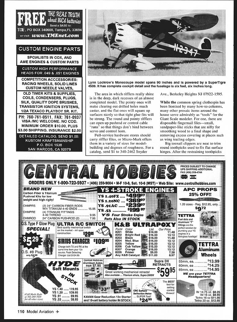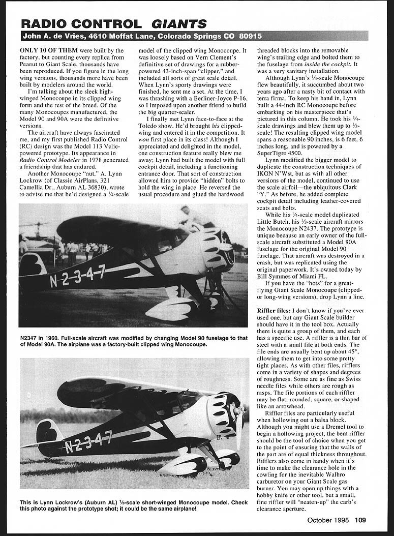 RADIO CONTROL GIANTS II ONLY 10 OF THEM built factory counting replica Peanut Giant Scale thousands have reproduced figure long wing versions thousands have built modelers around world Im talking about sleek highwinged Monocoupe its clipped wing form rest breed Monocoupes manufactured Model 90 90A definitive versions aircraft have always fascinated first published Radio Control RC design Model 113 Velie powered prototype Its appearance Radio Control Modeler 1978 generated friendship has endured Another Monocoupe Lockrow Classic AirPlans 321 Camellia Dr Auburn AL 36830 wrote advise hed designed /4-scale model clipped wing Monocoupe loosely based Vein Clements definitive set drawings rubberpowered 43-inch-span clipper included sorts great scale detail Lynns sporty drawings finished sent set time thrashing Berliner-Joyce P-16 imposed upon another friend build big quarter-scaler finally met Lynn face-to-face Toledo show Hed brought clippedwing entered competition won first place its class Although appreciated delighted model construction feature really blew away Lynn built model full cockpit detail including functioning entrance door sort construction allowed him provide hidden bolts hold wing place reversed usual procedure glued hardwood threaded blocks removable wings trailing edge bolted fuselage inside cockpit very sanitary installation Although Lynns -scale Monocoupe flew beautifully succumbed about two years ago after nasty bit contact terra firma keep hand Lynn built 44-inch RC Monocoupe before embarking masterpiece thats pictured column took /4 scale drawings blew up I/3 scale resulting clipped wing model spans reasonable 90 inches 6 feet 6 inches long powered SuperTigre 4500 Lynn modified bigger model duplicate construction techniques IKON NWst other versions model continued use scale airfoilthe ubiquitous Clark Y As before added complete cockpit detail including leather-covered seats belts /4-scale model duplicated Little Butch /3-scale aircraft mirrors Monocoupe N2437 prototype unique because early owner fullscale aircraft substituted Model 90A fuselage original Model 90 fuselage aircraft destroyed crash replicated using original paperwork Its owned today Bill Symmes Miami FL have hots greatflying Giant Scale Monocoupe clipped long-wing versions drop Lynn line Riffler files dont know youve ever used Giant Scale builder should have tool box Actually quite group has specific use riffler thin bar steel small file both ends file ends usually bent up about 450 allowing get some pretty tight places As other files rifflers come variety shapes degrees roughness Some fine Swiss needle files others rough rasps file portions riffler may flat rounded square shaped like arrowhead Riffler files particularly useful hollowing out balsa block Although might use Dremel tool begin hollowing project bent riffler should tool choice get point ensuring walls part equal thickness throughout Rifflers also come handy its time make clearance hole cowling inevitable Walbro carburetor Giant Scale gas burner may open up things hobby knife other tool small fine riffler will neaten-up carbs clearance aperture October1998 109 N2347 1960 Full-scale aircraft modified changing Model 90 fuselage Model 90A airplane factory-built clipped wing Monocoupe Lynn Lockrows Auburn AL 1/3-scale short-winged Monocoupe model Check photo against prototype shot could same airplane OLD TIMER KITS & SUPPLIES COILS CONDENSERS PLUGS SILK QUALITY DOPE BRUSHES TRANSISTOR IGNITION SYSTEMS 112A TEXACO PLAYBOY SR KIT PH 760-761-0511 FAX 761-0937 VISA /MC WELCOME NO COD MINIMUM ORDER $1000 PLUS t2 fifi HlPPIMA INSURANCE $200 area rifflers really shine deep dark recesses almost completed model pointy ones will make clearing out drilled holes much easier flat ones will square up surfaces nicely tight glue fits will strong round pointy rifflers can open up pushrod control cable runs things dont bind between servo control horn Full-service hardware stores should carry riffler files Micro-Mark offers variety sizes modelbuilding degrees roughness catalog send $1 340-2462 Snyder Ave Berkeley Heights NJ 07922-1595 common spring clothespin has lionized how-to columns other prosaic items around house serve admirably tools Giant Scale modeler disposable fingernail filessmall sandpaper-like sticks nifty smoothing wood final shape removing excess covering places such wing trailing edges Big toenail clippers neat trim round toothpicks used fix flat surface hinges After restraining toothpicks 110 Model Aviation ALISTS IN COX AND AME ENGINES & CUSTOM PARTS COMPETITION ACCCESSORIES RACING WHEELS SOLID LINES Lynn Lockrows Monocoupe model spans 90 inches powered Superigre 4500 has complete cockpit detail fuselage six feet six inches long CUSTOM NEEDLE VALVES have CyAd cyanoacrylate glue place toenail clippers great trim flush edge nippers used shorten toothpicks about 1/s-inch above surface rounded edge applied smooth things truly inexpensive set clamps bulldog paper clipsthe ones have squeeze open Theyre available several sizes larger ones great hold wing sheeting place Although may dent wood bit moisture will remove clamp marks bit sanding will smooth things nicely things call magic wands Alligator clips available Radio Shack other suppliers CyAed end thin dowels used hold smallish pieces apply glue position wherever want Magic wands nifty use stick thin plywood gussets inside stickbuilt fuselages hold screws get started through servo mounts Common serrated steak knives good youre forming StyrofoamTM chunks faired parts fuselages Theyll take foam point can finished off perfect form sandpaper serrations make short work tapering turtledeck preparation bit fiberglass cloth epoxy covering forming scale details such wheel pants landing gear strut streamlining use steak knives foam sawing action will best way trim things Old used-up artificial sponges come handy flexible sanding blocks glue piece sandpaper Use some white glue rubber contact cement weight block dow