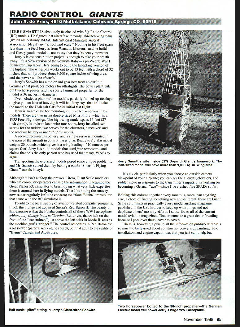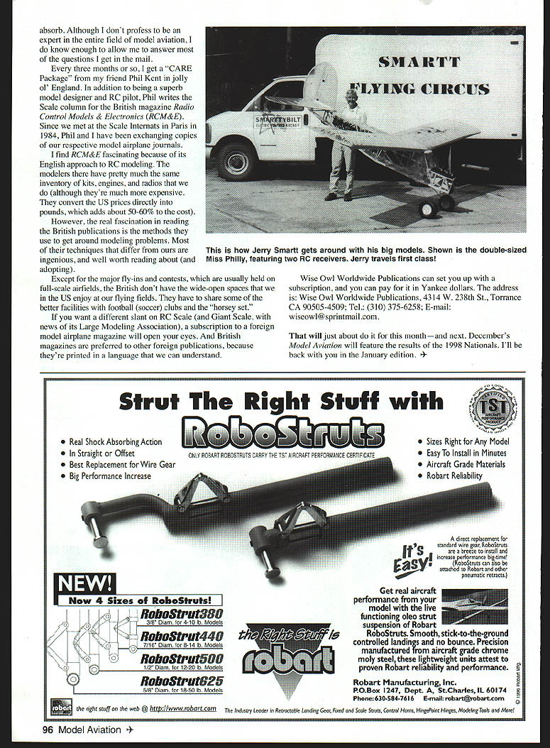 RADIO CONTROL GIANTS JERRY SMARTT IS absolutely fascinated big Radio Control RC models figures aircraft 84-inch wingspans certainly IMAA [International Miniature Aircraft Association]-legal schoolyard scale Nothing fleet spans less nine feet Jerry Warsaw Missouri builds flies gigantic modelsnot say theyre heavy monsters Jerrys latest construction project enough take breath away Its 52% version Sopwith Babya pre-Worid War Schneider Cup racer Hes going build landplane version biplane wingspan works out 13 feet chord 32 inches will produce about 9200 square inches wing area power will electric Jerrys Sopwith has motor gear box outfit Germany produces motors ultralights power plant pots out two horsepower sporty laminated propeller model 36 inches diameter Ive included photo models partially framed-up fuselage give idea big will Jerry says hell take model Utah salt flats its initial test flights Jerry advocate mounting multiple RC receivers models two double-sized Miss Philly 1933 Free Flight design high-wing model spans 15 feet 27inch chord order keep wire runs short Jerry installed two servos rudder two servos elevators receiver receiver battery tail model second receiver its battery single servo mounted nose aircraft control engine Ready fly model weighs 20 pounds gives wing loading 10 ounces per square foot Jerry has built models usedfour receiversand claims hes person has used Whos argue Transporting oversized models posed some unique problems Mr Smartt solved buying truck Smartts Flying Circus travels style Although isnt Stop presses item Giant Scale modelers computer operators can use information acquired Great Planes RC simulator brush up what very little expertise around flying models Im hitting runway now rather regularly isnt conceru faux Futaba transmitter came RC simulator add local supply aviation-related computer programs took plunge acquired Sierras Red Baron II beauty exercise Futaba controls WW aeroplanes change its calibration Better yet switch front transmitter just above left stick Mode II acts machine guns trigger control responses Red Baron bit slower particularly engine speed adds reality flying Camels Albatroses Its kick particularly choose outside camera viewpoint airplane can see ailerons elevators rudder move response transmitters inputs Im working becoming German acesince Ive crashed five SPADs far Bolting column together month anything else chore finding something new different Giant Scale columnists practically model airplane magazine published US order keep up things duplicate others monthly efforts subscribe current model aviation magazines amounts great deal reading because pore over cover cover however plus information published theres much learned about construction covering painting radio installation engine capabilities just cant help November1998 95 Jerry Smartts wife inside 52% Sopwith Giants framework half-sized model will have 9000 sq wing area Two horsepower bolted 36-inch propellerthe German Half-scale pilot sitting Jerrys Giant-sized SopwithElectric motor will power Jerrys huge WW aeroplane absorb Although dont profess expert entire field model aviation know enough allow answer questions get mail three months get CARE Package friend Phil Kent jolly ol England addition being superb model designer RC pilot Phil writes Scale column British magazine Radio Control Models & Electronics RCM&E Since met Scale Internats Paris 1984 Phil have exchanging copies respective model airplane journals find RCM&E fascinating because its English approach RC modeling modelers have pretty much same inventory kits engines radios although theyre much expensive convert US prices directly pounds adds about 50-60% cost However real fascination reading British publications methods use get around modeling problems Most techniques differ ingenious well worth reading about adopting Except major fly-ins contests usually held full-scale airfields British dont have wide-open spaces US enjoy flying fields have share some better facilities football soccer clubs horsey set want different slant RC Scale Giant Scale news its Large Modeling Association subscription foreign model airplane magazine will open eyes British magazines preferred other foreign publications because theyre printed language can understand Wise Owl Worldwide Publications can set up subscription can pay Yankee dollars address Wise Owl Worldwide Publications 4314 W 238th St Torrance CA 90505-4509 Tel 310 375-6258 E-mail wiseowl@ sprintmail com will just about monthand next Decembers Model Aviation will feature results 1998 Nationals Ill back January edition tTheR tStuffwith Real Shock Absorbing Action Sizes Right Any Model Straight Offset Easy Install Minutes Best Replacement Wire Gear Aircraft Grade Materials Big Performance Increase Robart Reliability direct replacement standard wire tear Robotruna breeze install increase performance big-time Robotruta can alno attached Robart other pneumatic retracts Get real aircraft Now 4 Sizes RoboStrutslperformance model live o$tut38G 3/8 Diem 4 10 lb Modelsfunctioning oleo strut Isuspension Robart / HoboStut44ORobotruts Smooth stick-to-the-ground I716 Diem 8-14 lb Modelscontrolled landings no bounce Precision factured aircraft grade chrome flohoStputEGO moly steel lightweight units attest 1/2 Diam 12-20 lb Models proven Robart reliability performance Stut825Robart Manufacturing Inc 5/8 Diem 18-50 lb ModelsROBox 247 Dept StCharles IL 60174 Phone630-584-7616 E-mail mbart@mbartcom right stuff en web @ httpI/wwwroba rtcom Industry Leader Retractable Lending Ceer Fined Scale Struts centre Hnrns HingePoint Hinges Medehng Teels Morn 96 Model Aviation y Smartt gets around big models Shown double-sized Miss Philly featuring two RC receivers Jerry travels first class